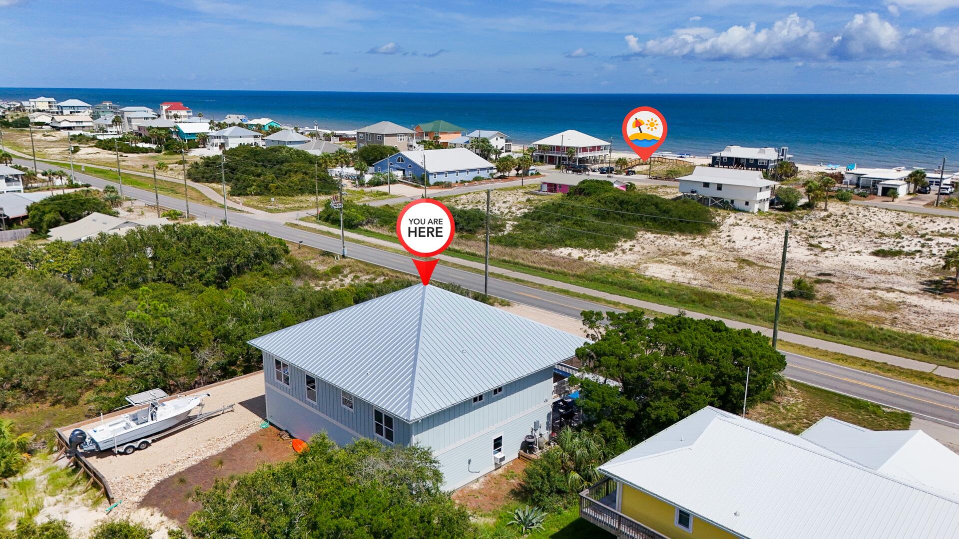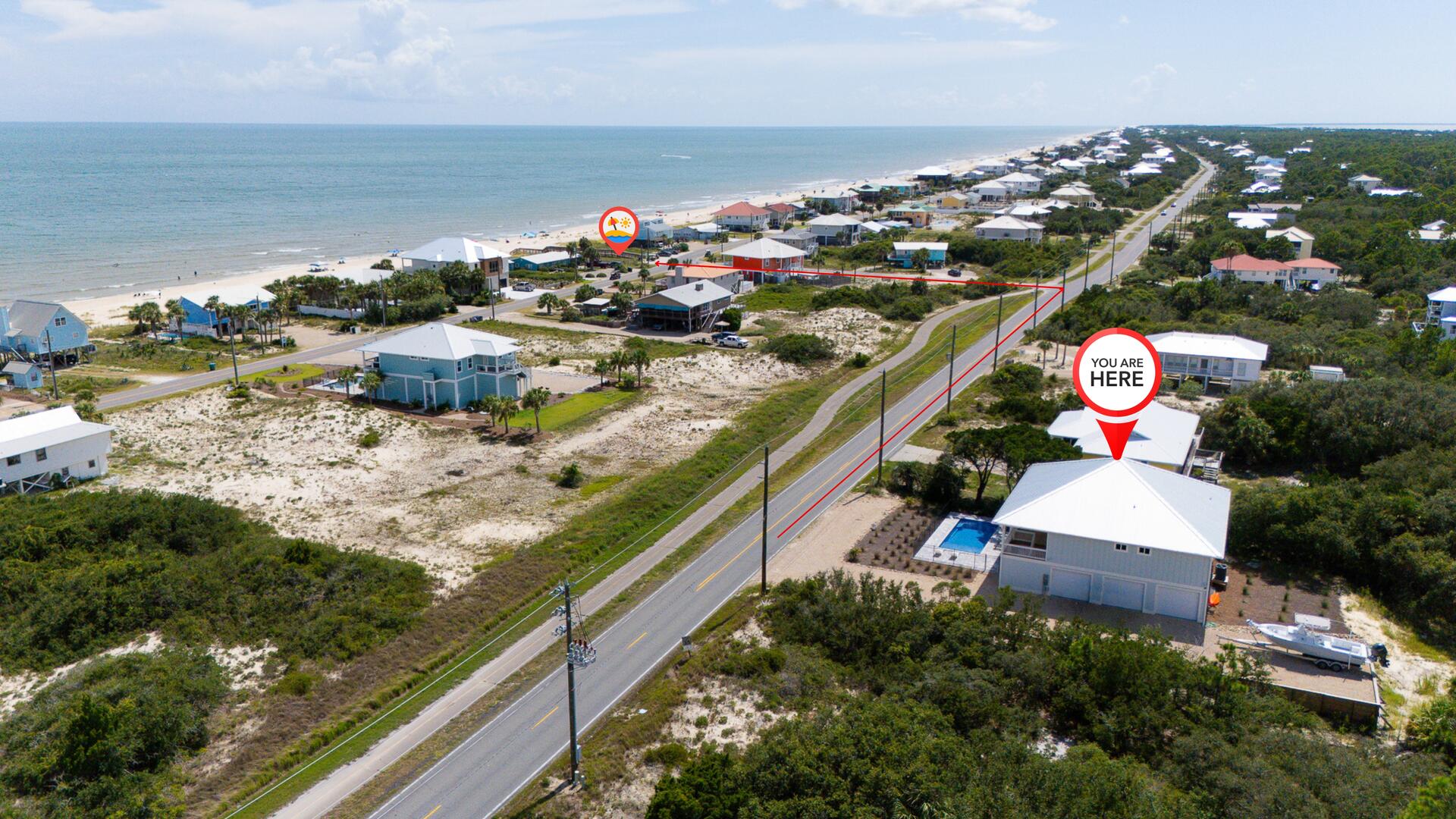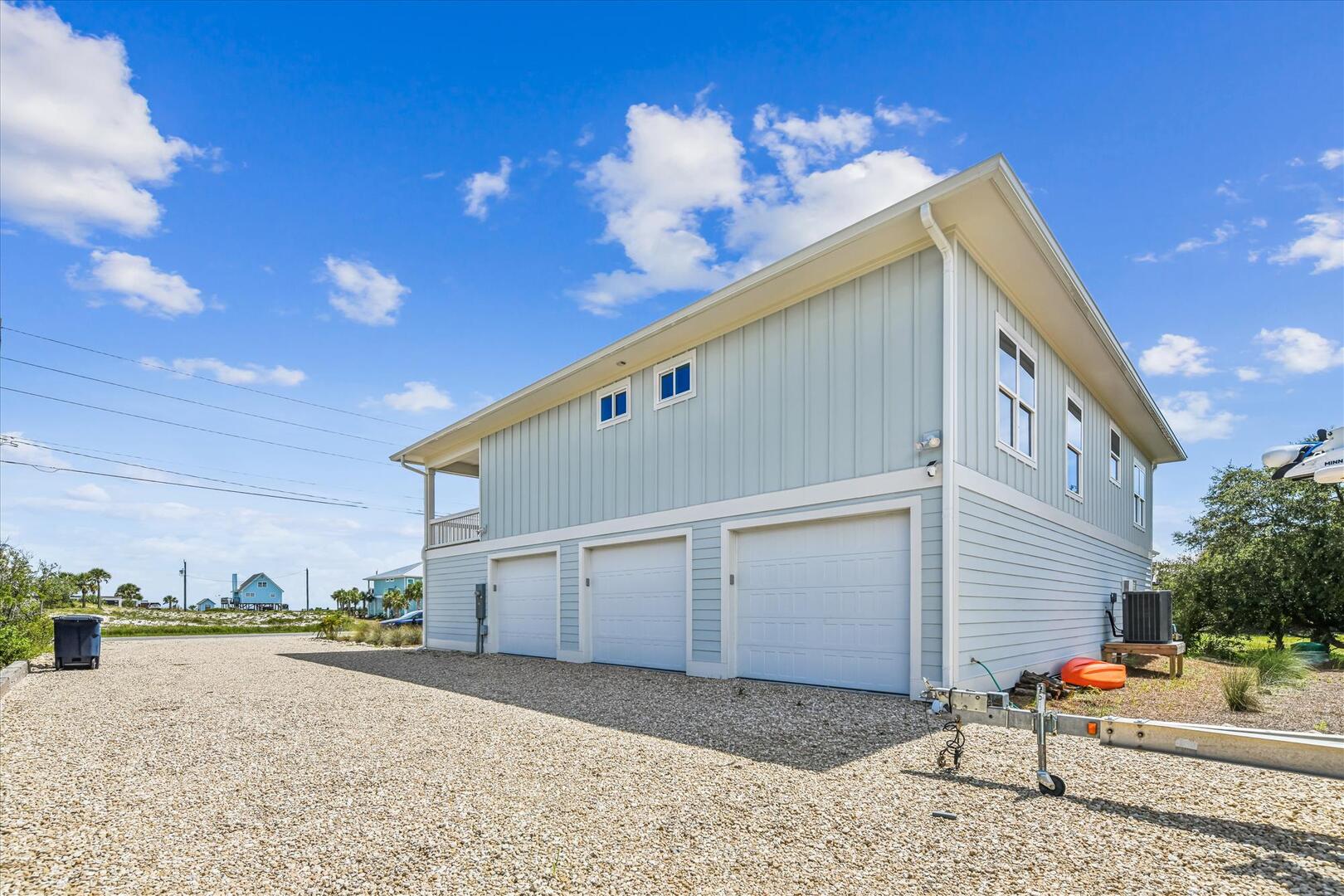 AMENITIES:Multiple smart TV's, beautifully appointed kitchen with quartz countertops and stainless appliances, luxury vinyl plank floors throughout, all new furniture, bedding, decor and accessories, large covered porch, elevator, private pool (heated or cooled for a fee of $450 per week), ground level has one bedroom with 2 queens, full bathroom, game room with pool table, cozy seating and large TV. Pool area extends to under the house entertainment area with a charcoal grill, tables and chairs. Two garage bays available for guest use, One garage bay is not for guest use, Owners boat on premises and not for guest use.