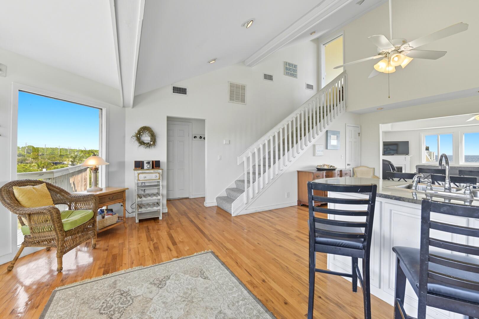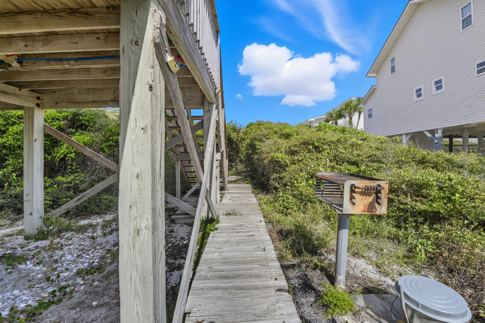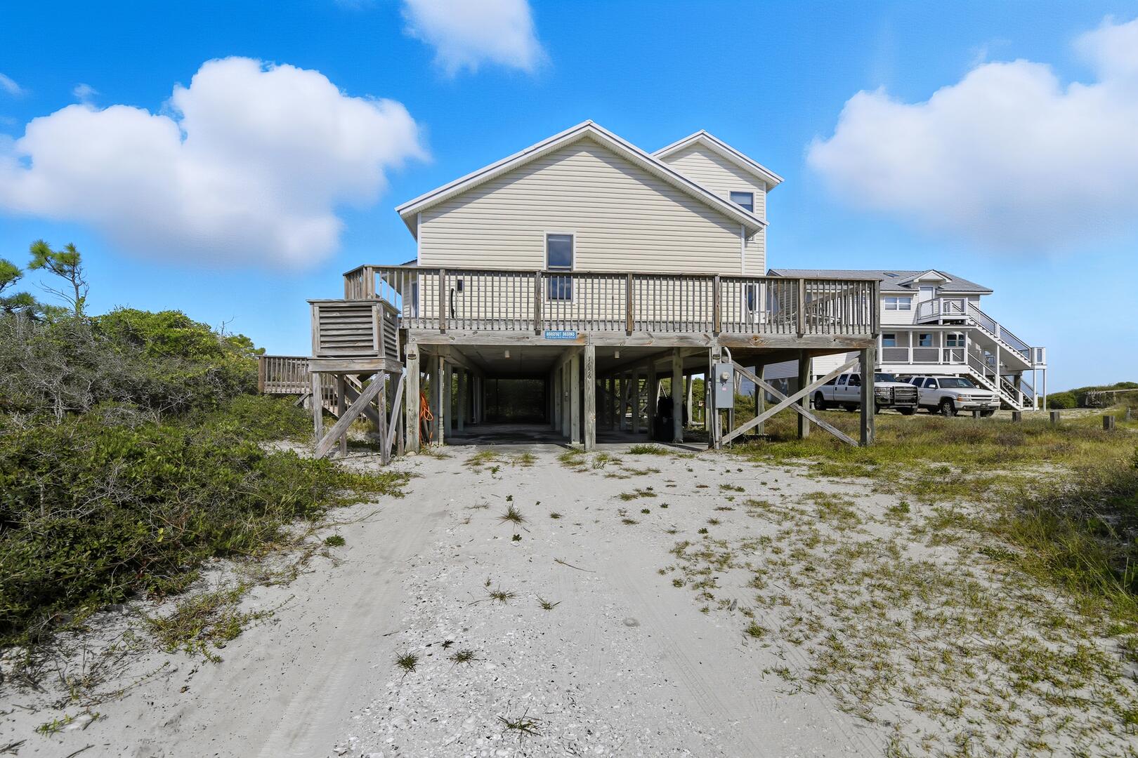 Gather for a family barbecue or enjoy drinks and dinner on the wraparound deck, complete with a grill. Watch dolphins frolic in the waves as you unwind with a book from the large lending library. Situated on a private one-acre lot, this home is located on the newly paved bike and running path, making it even more convenient for outdoor adventures.