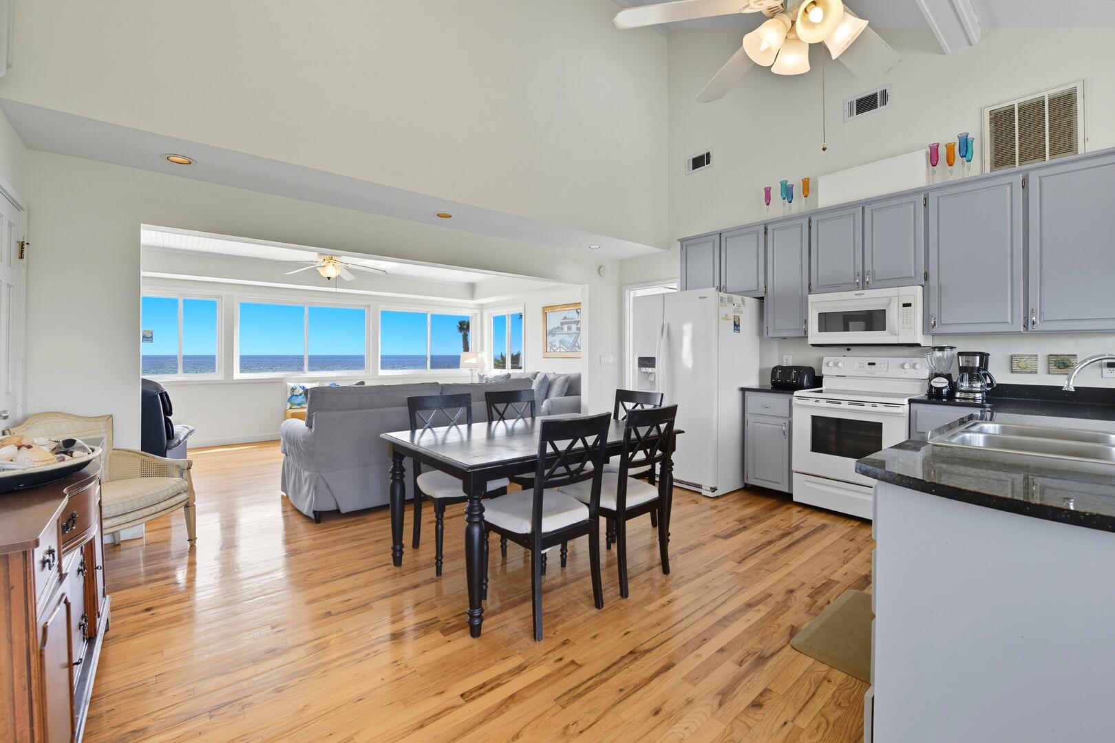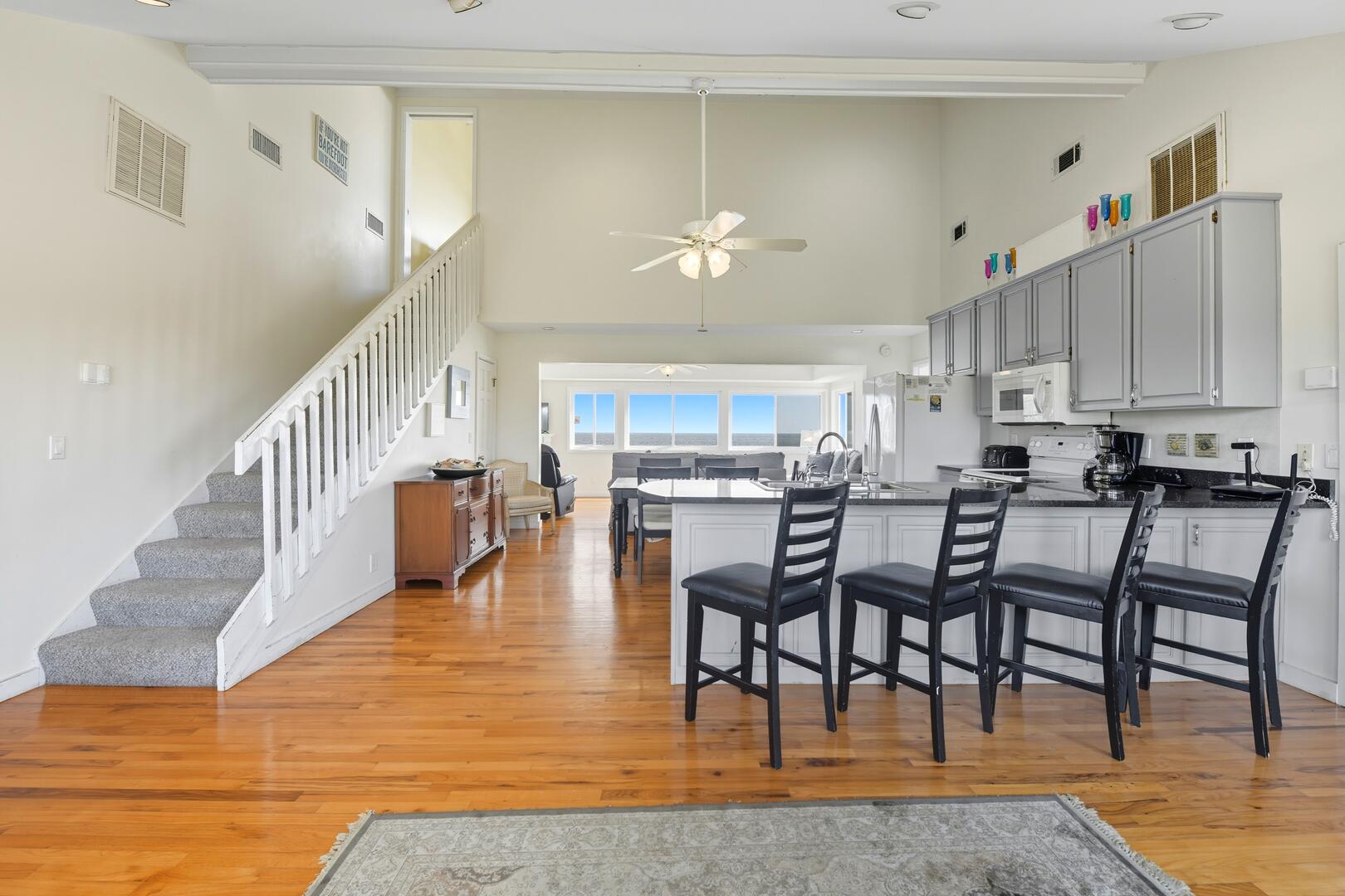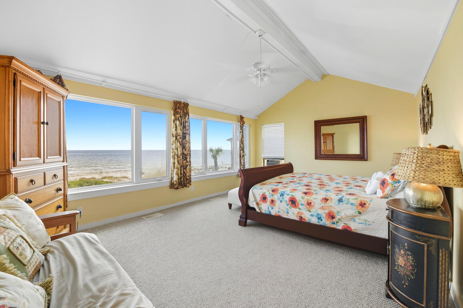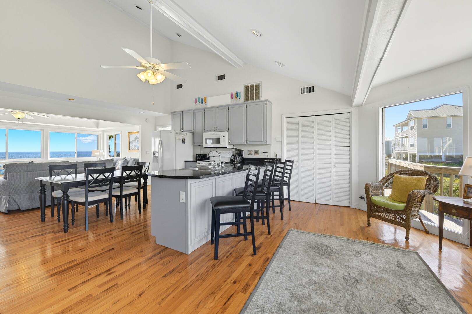 This home features three spacious bedrooms, each with a king bed. Two of the bedrooms have sliding doors leading out to sun decks overlooking the Gulf, while the third bedroom boasts a vaulted ceiling, a wall of windows offering panoramic views and a large sitting area with a full-size futon. The kitchen is equipped with granite countertops, a vaulted ceiling and additional seating for four at the breakfast bar.