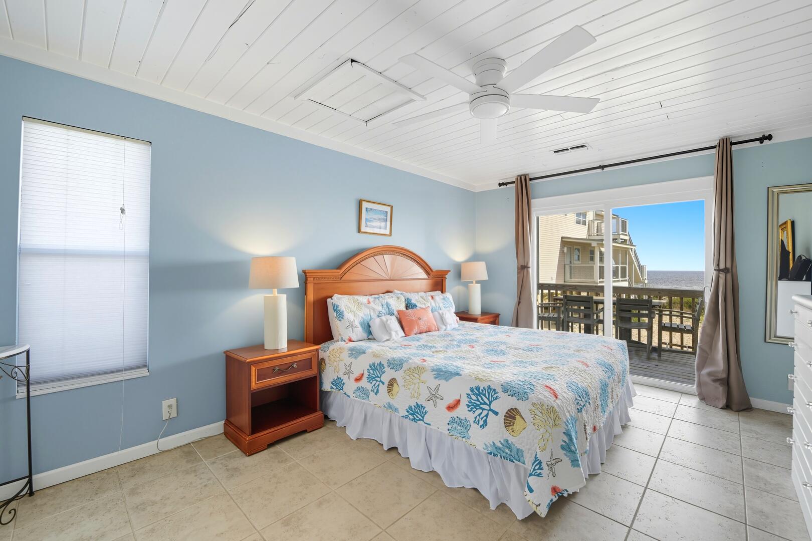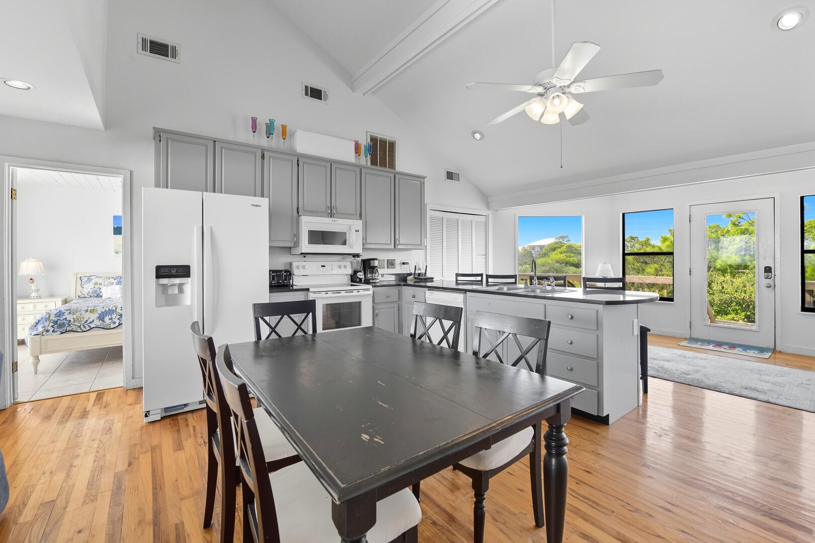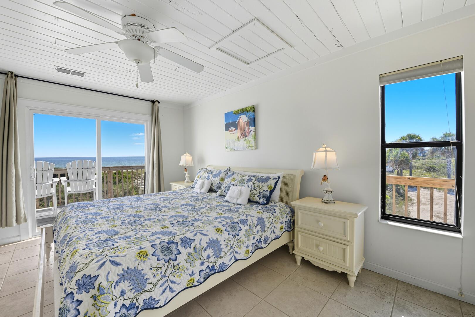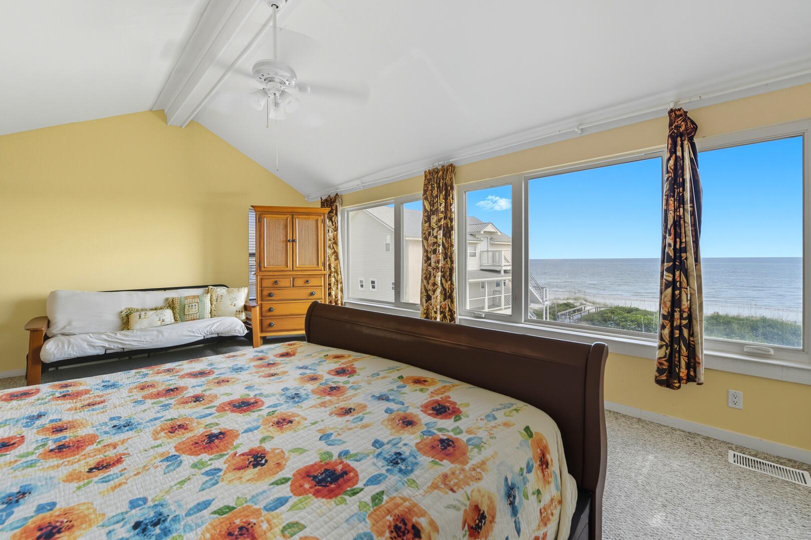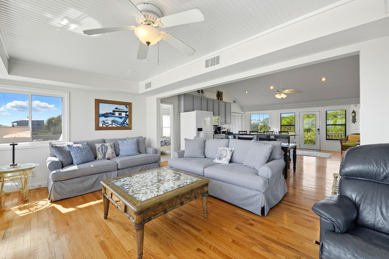 This home features three spacious bedrooms, each with a king bed. Two of the bedrooms have sliding doors leading out to sun decks overlooking the Gulf, while the third bedroom boasts a vaulted ceiling, a wall of windows offering panoramic views and a large sitting area with a full-size futon. The kitchen is equipped with granite countertops, a vaulted ceiling and additional seating for four at the breakfast bar.