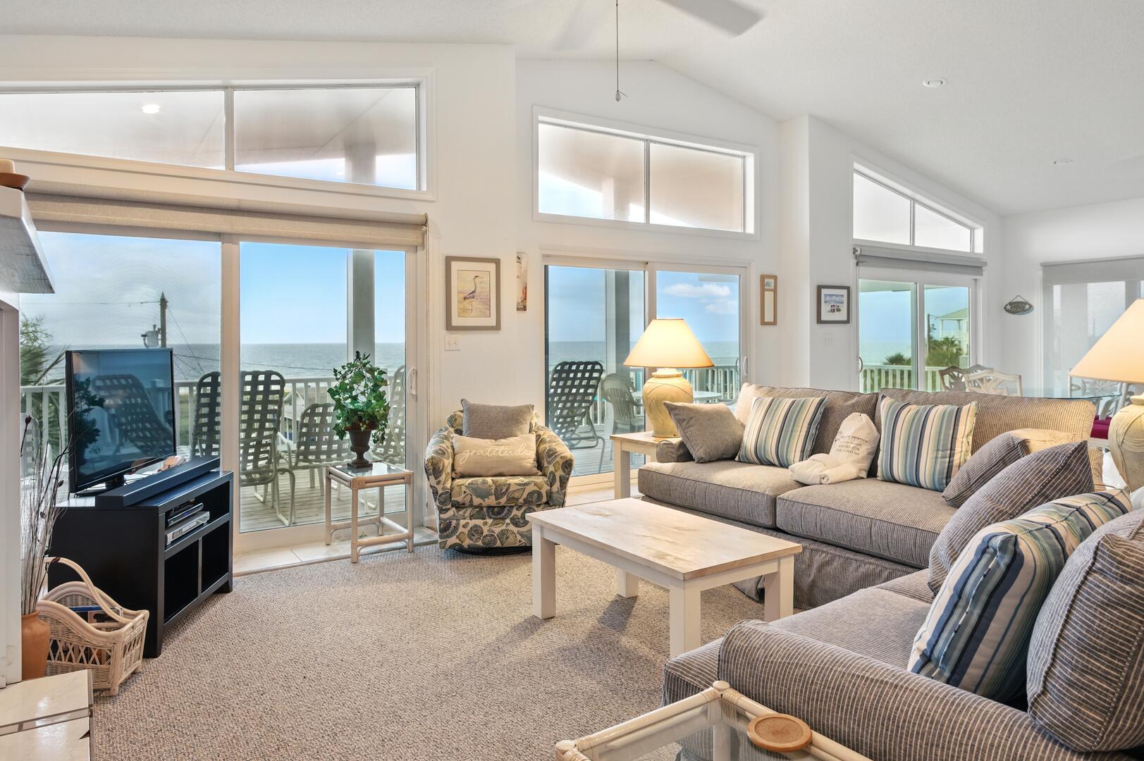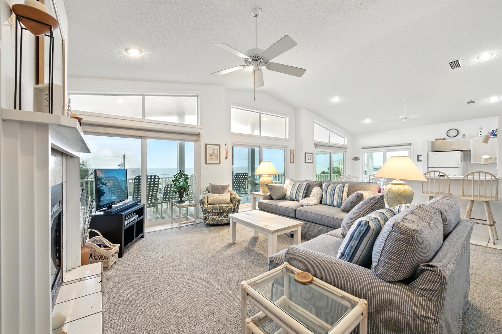 Welcome to "Beach Time"! This first tier home features four bedrooms, four bathrooms and sleeps up to ten people. The ground floor foyer found under the home leads to the first floor that features three bedrooms all with en-suite bathrooms. A large covered deck offers panoramic view of the Gulf of Mexico. Continuing on to the second floor, the open concept living, dining and kitchen is everything your family needs. The kitchen features white appliances, breakfast bar that seats three and is well stocked. The dining table seats six with stunning views of the water. The living area features a new sofa, loveseat, coffee table and end tables, new king bedroom furniture on top floor and new queen bedroom furniture on 1st level. A second large covered deck can be found on this floor. The fourth bedroom is on this floor with a neighboring bathroom. The exterior of this home offers under house parking, enclosed outdoor shower and fish cleaning area. Direct access to the beach is directly across the street.