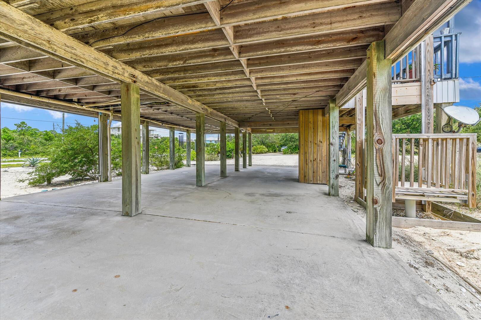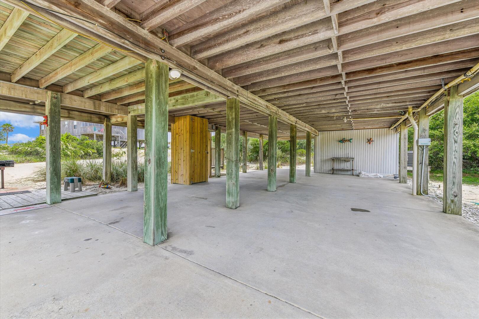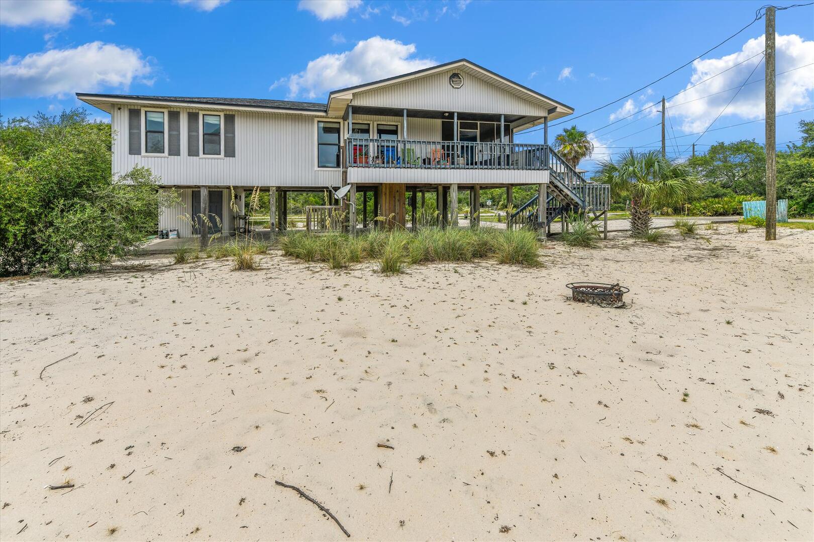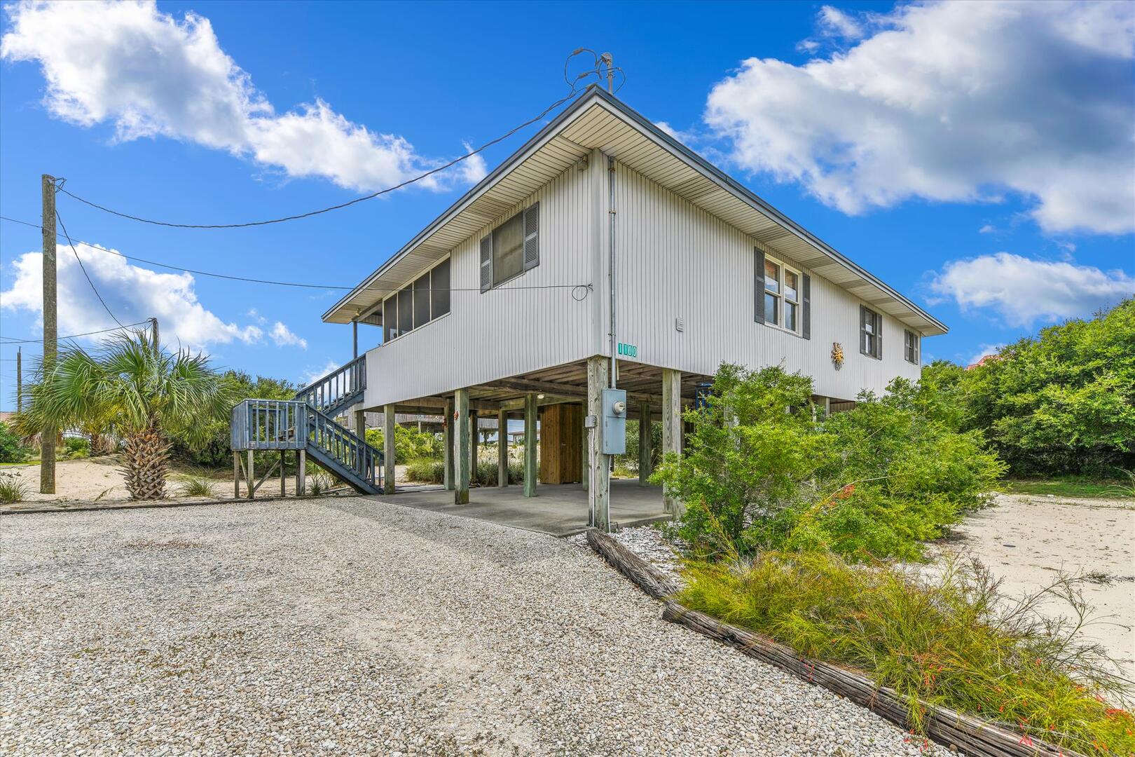 AMENITIES:Multiple TVs, well equipped kitchen, laminate floors throughout, screened porch with picnic table, large covered porch, under house parking, outdoor shower, park style charcoal grill. Located on a corner lot and just steps to the beach boardwalk.