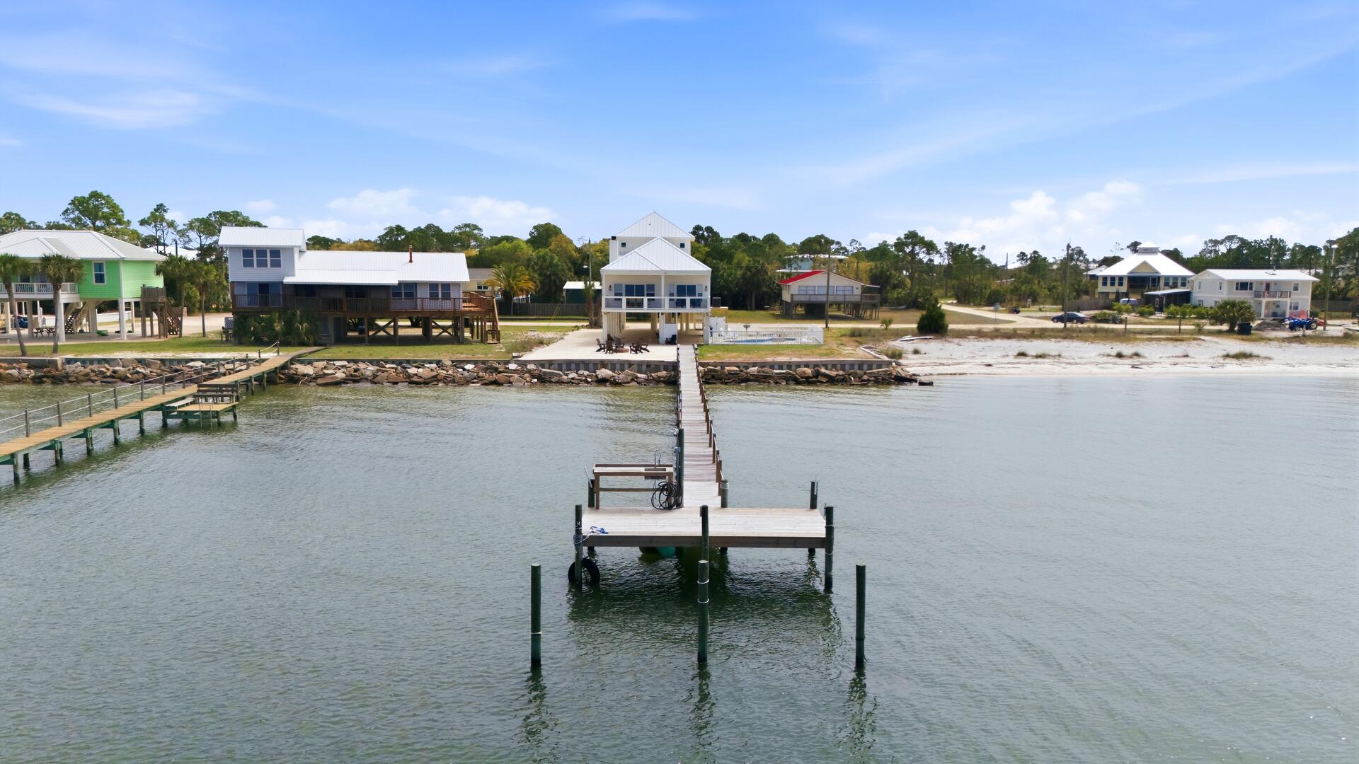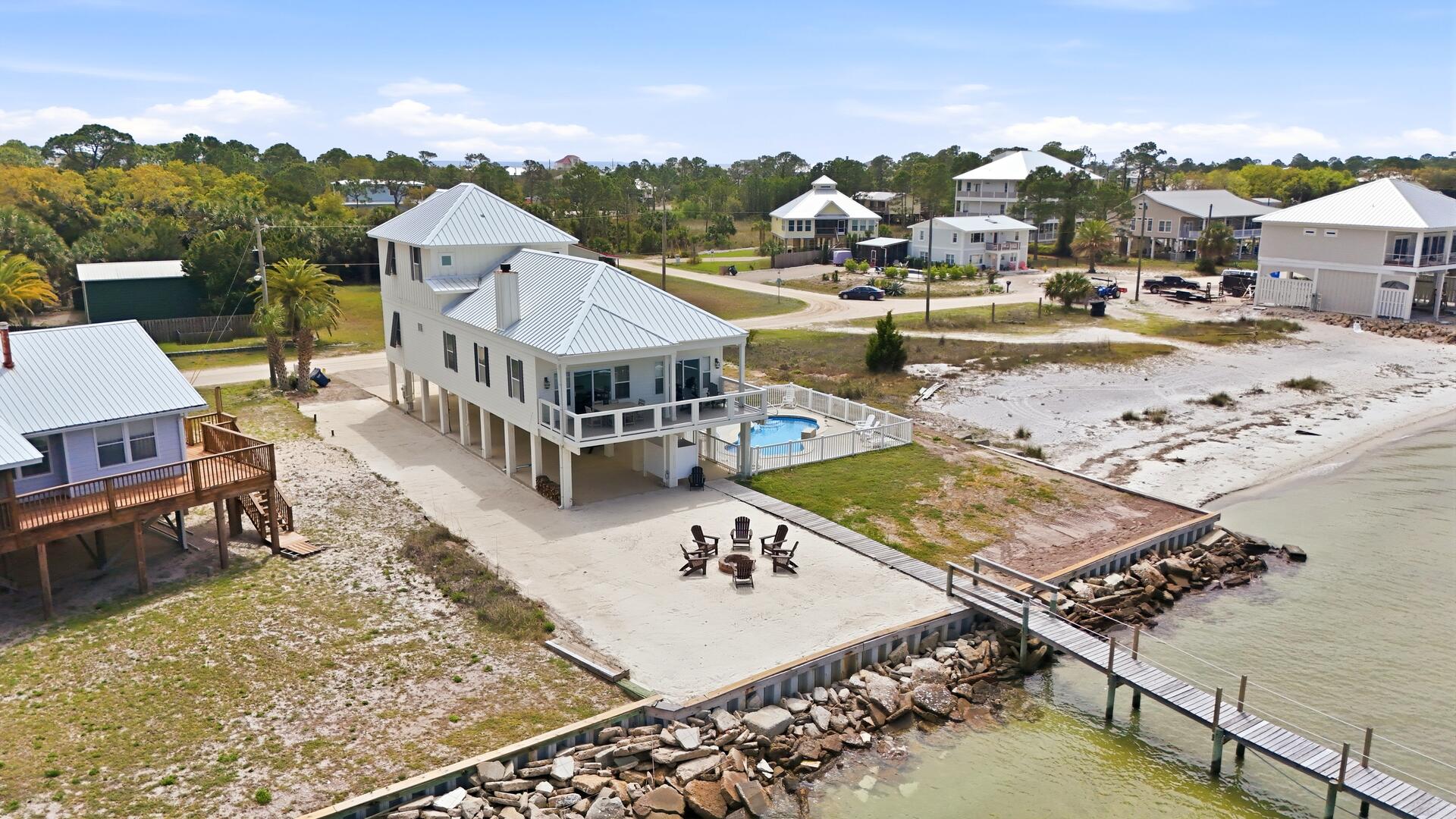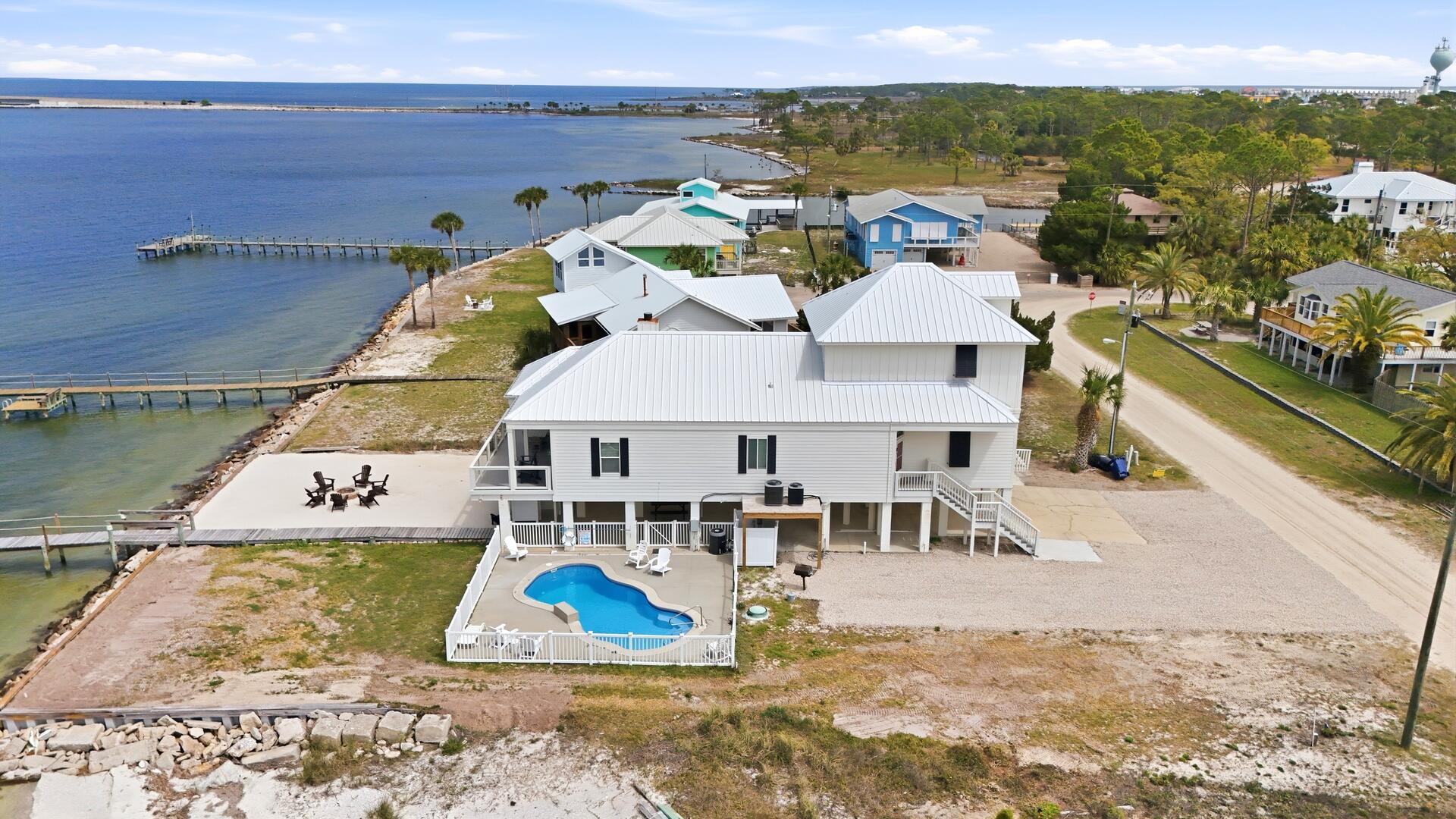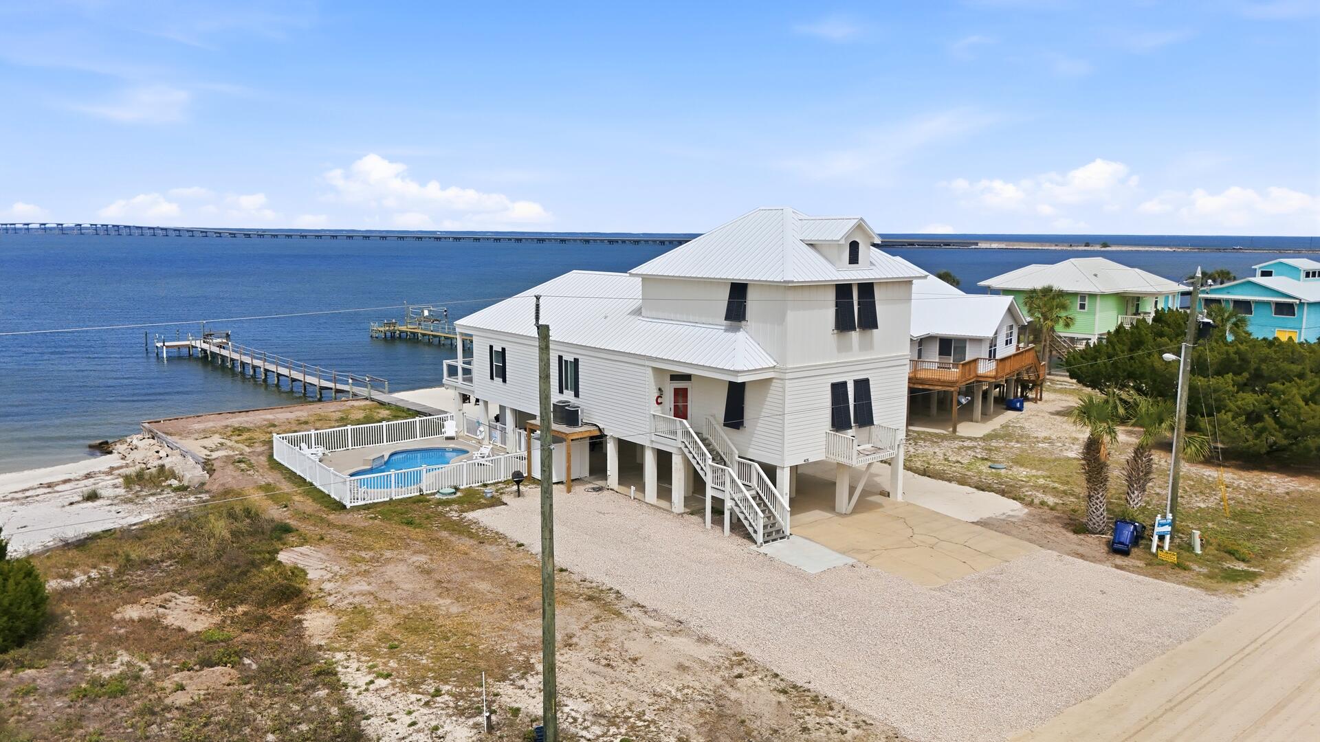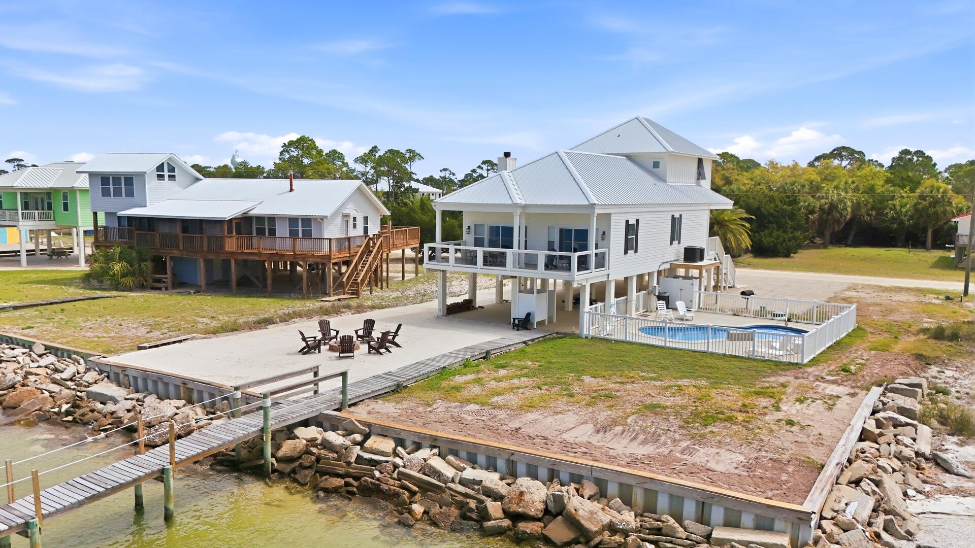 AMENITIES:Multiple TVs, DVD player, well equipped kitchen with granite countertops, luxury vinyl plank flooring throughout kitchen, main living area and bedrooms, covered deck overlooking the bay, outdoor firepit and sitting area. Private pool (heat or chill for a fee), enclosed hot/cold outdoor shower, fish cleaning station, park-style charcoal grill, sea wall with 185-foot private dock, and under-house concrete parking.