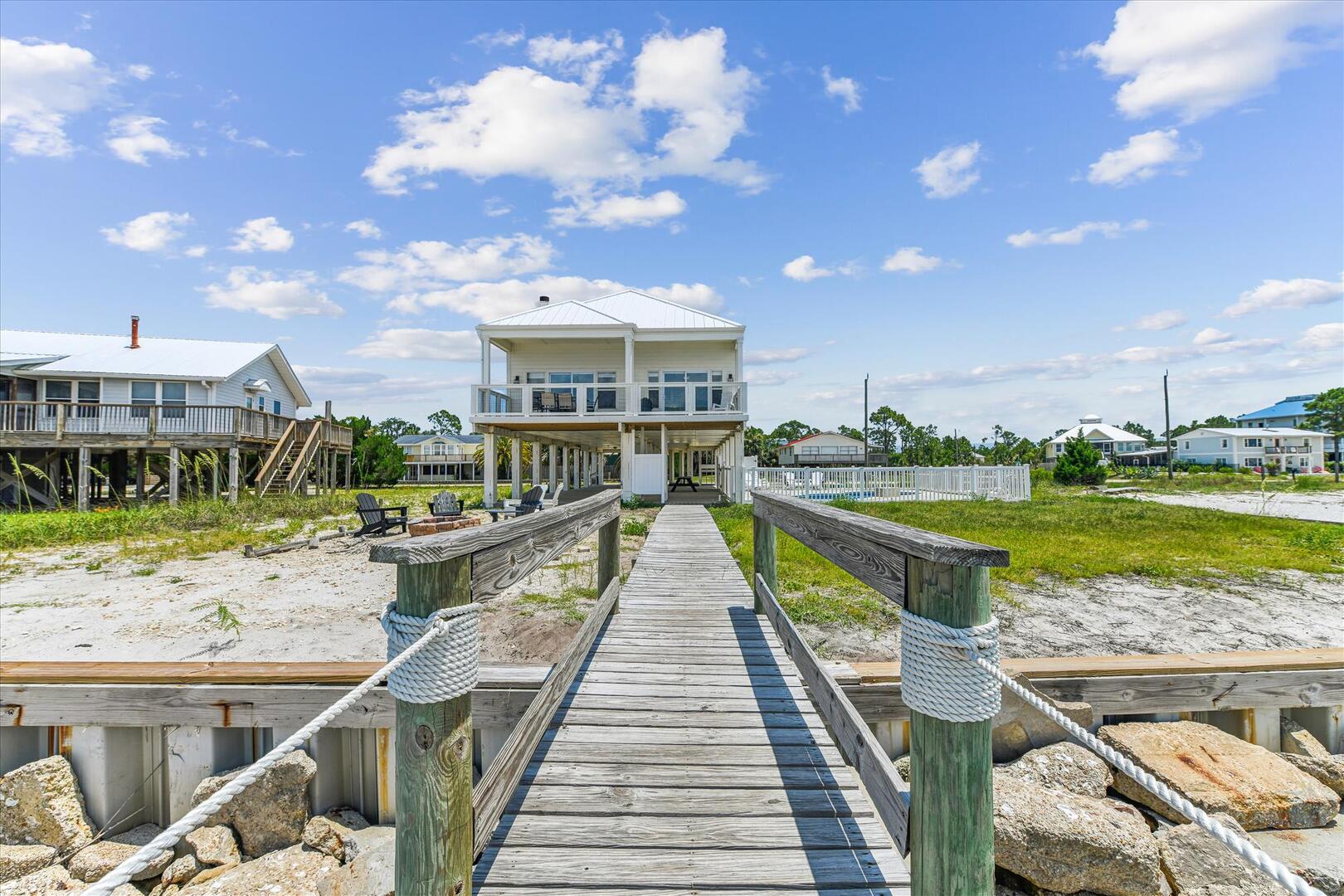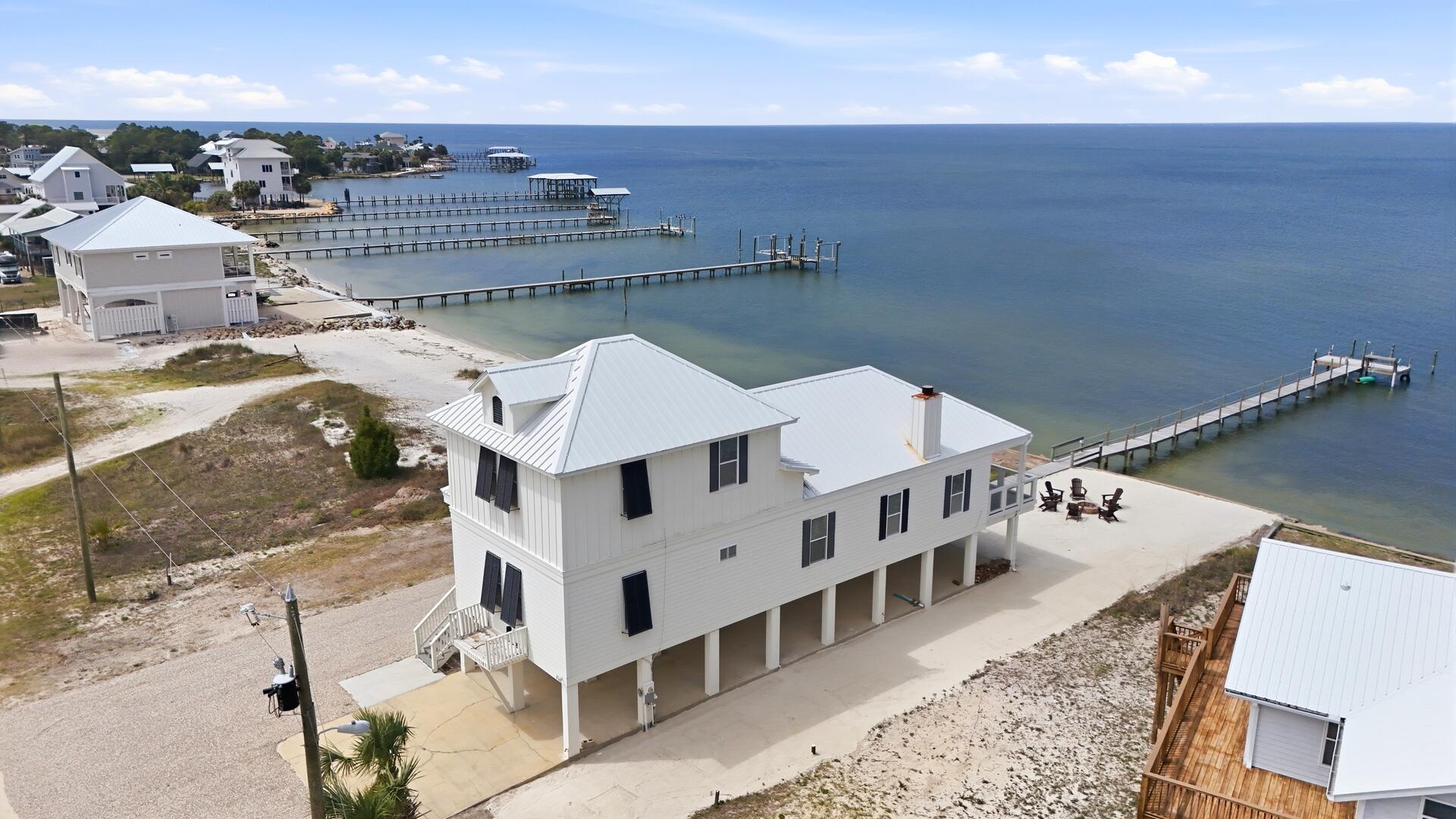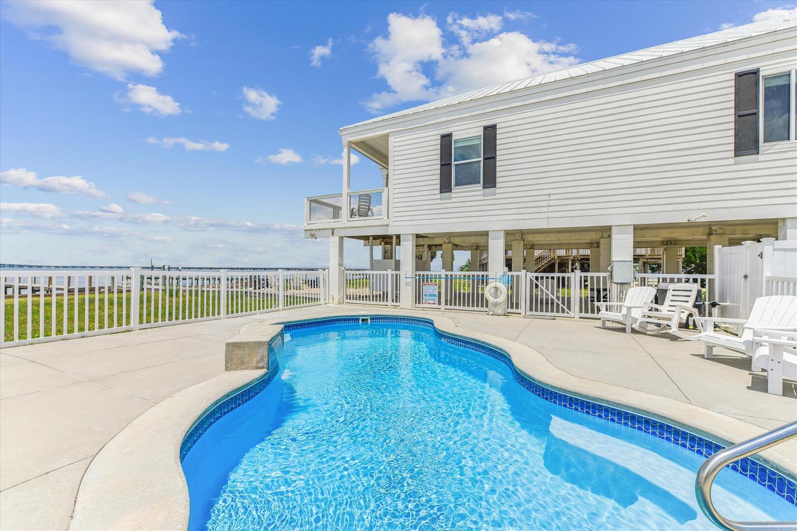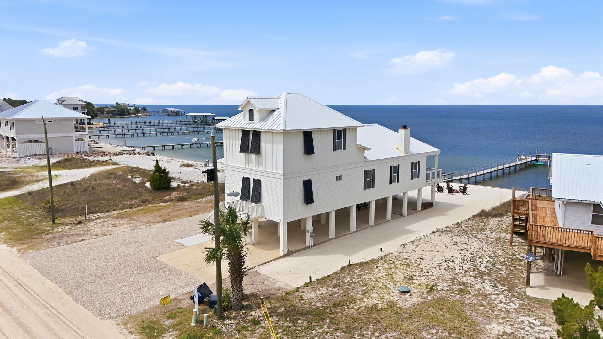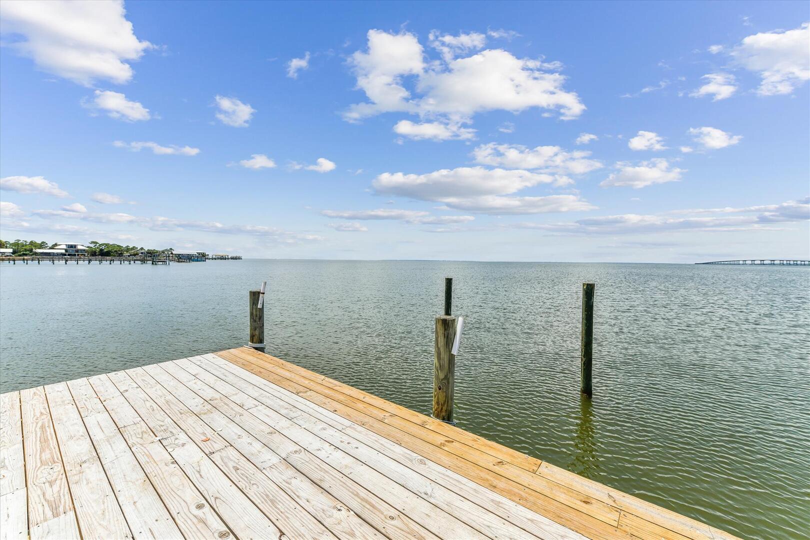 AMENITIES:Multiple TVs, DVD player, well equipped kitchen with granite countertops, luxury vinyl plank flooring throughout kitchen, main living area and bedrooms, covered deck overlooking the bay, outdoor firepit and sitting area. Private pool (heat or chill for a fee), enclosed hot/cold outdoor shower, fish cleaning station, park-style charcoal grill, sea wall with 185-foot private dock, and under-house concrete parking.