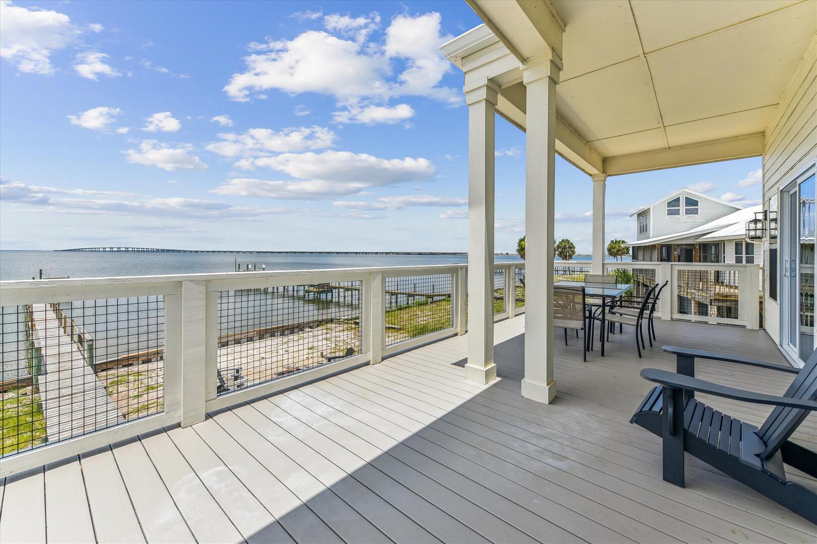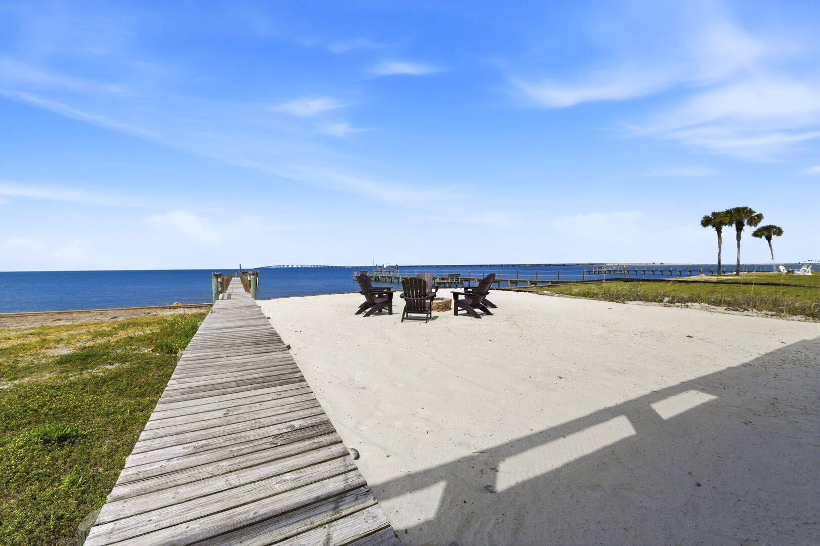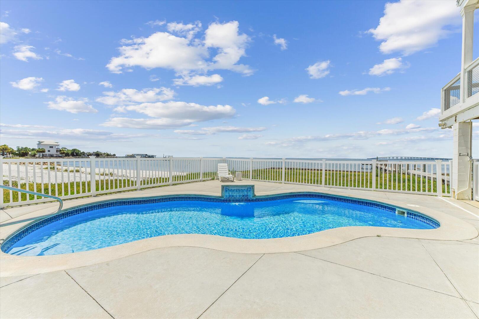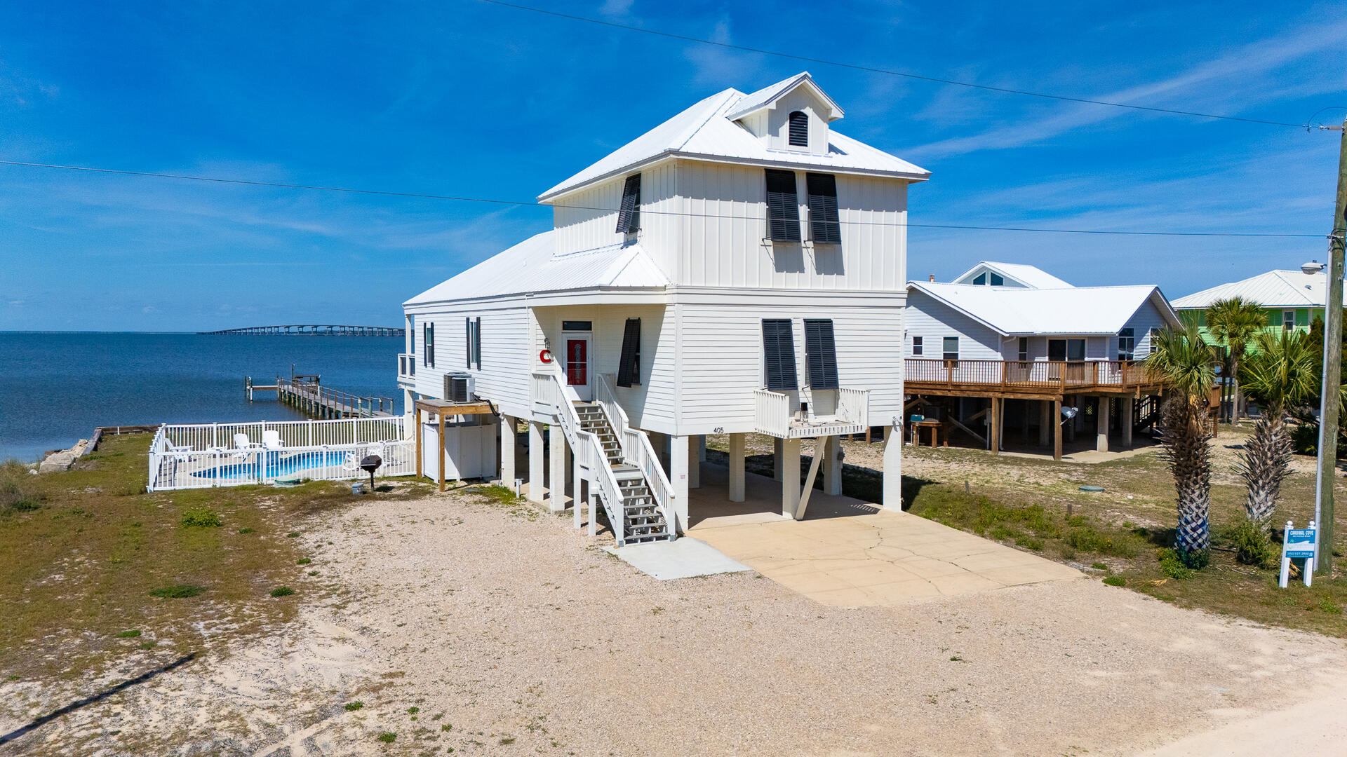 AMENITIES:Multiple TVs, DVD player, well equipped kitchen with granite countertops, luxury vinyl plank flooring throughout kitchen, main living area and bedrooms, covered deck overlooking the bay, outdoor firepit and sitting area. Private pool (heat or chill for a fee), enclosed hot/cold outdoor shower, fish cleaning station, park-style charcoal grill, sea wall with 185-foot private dock, and under-house concrete parking.