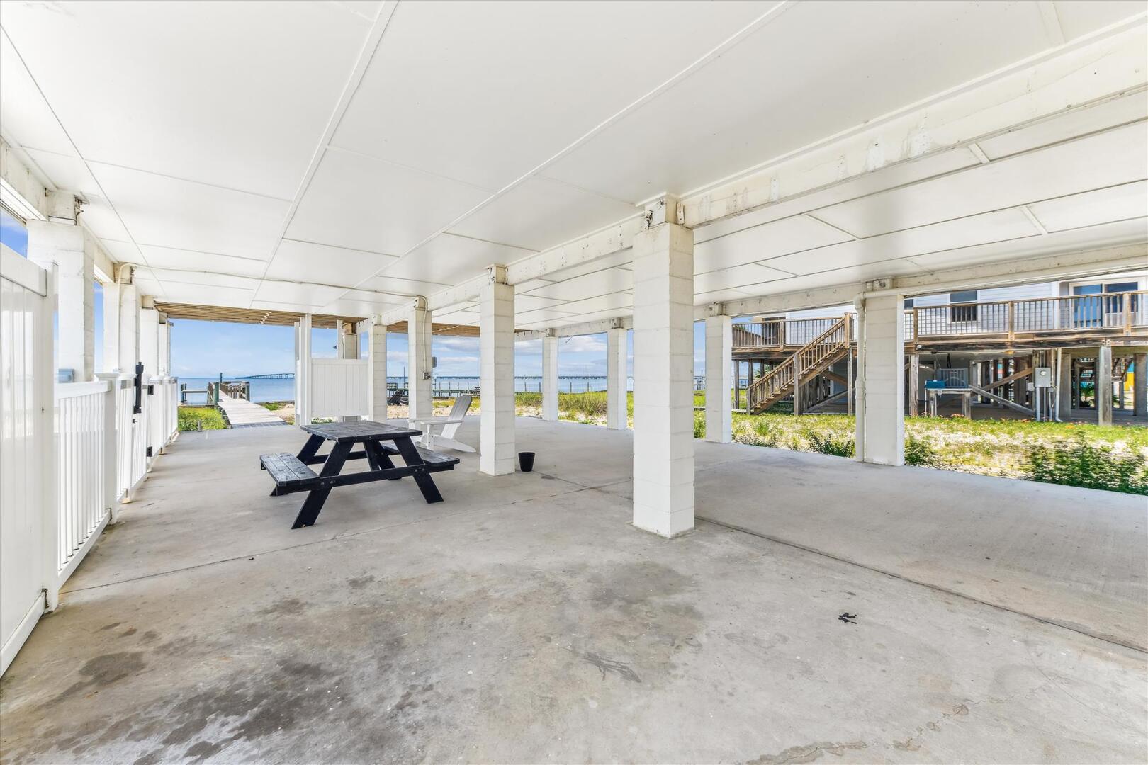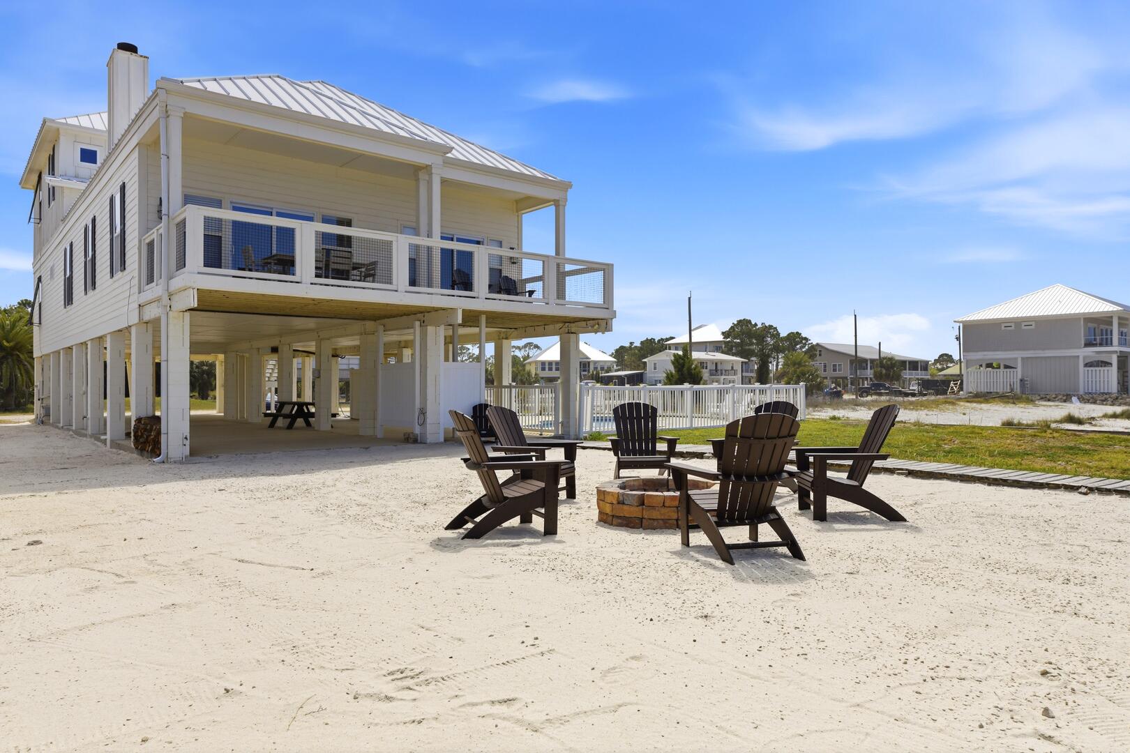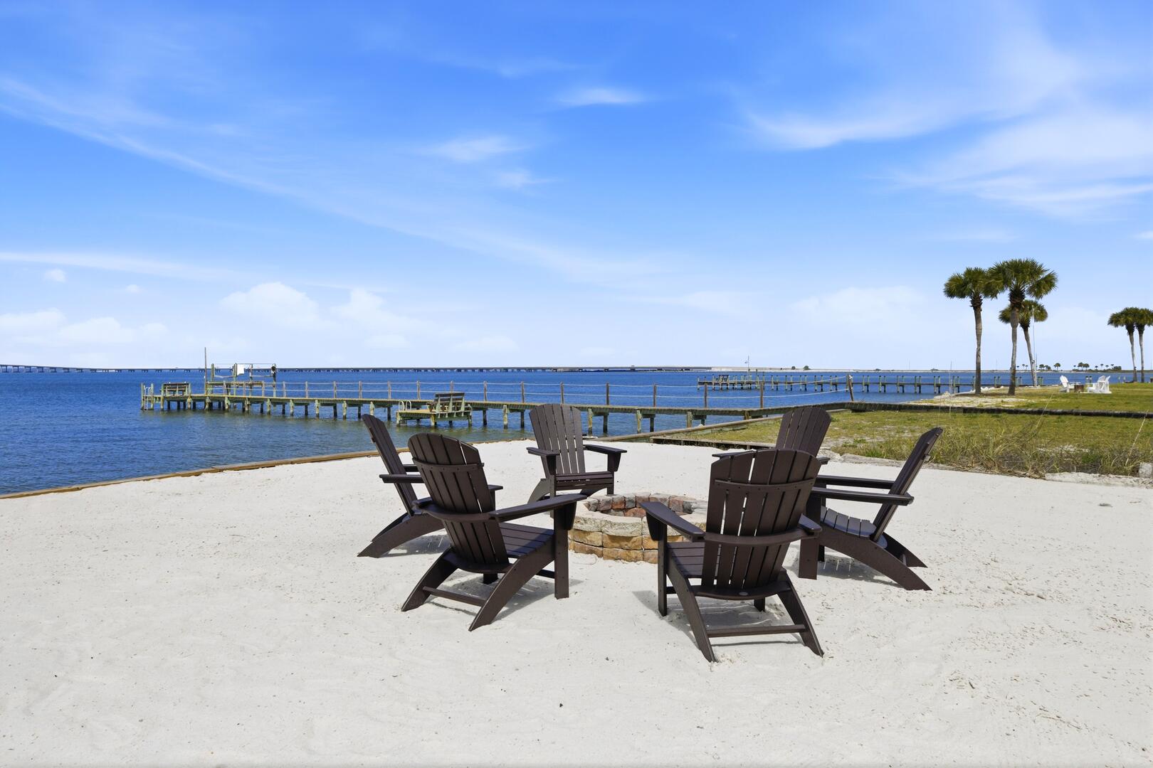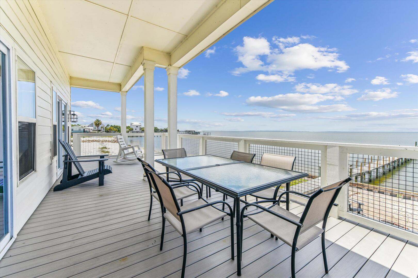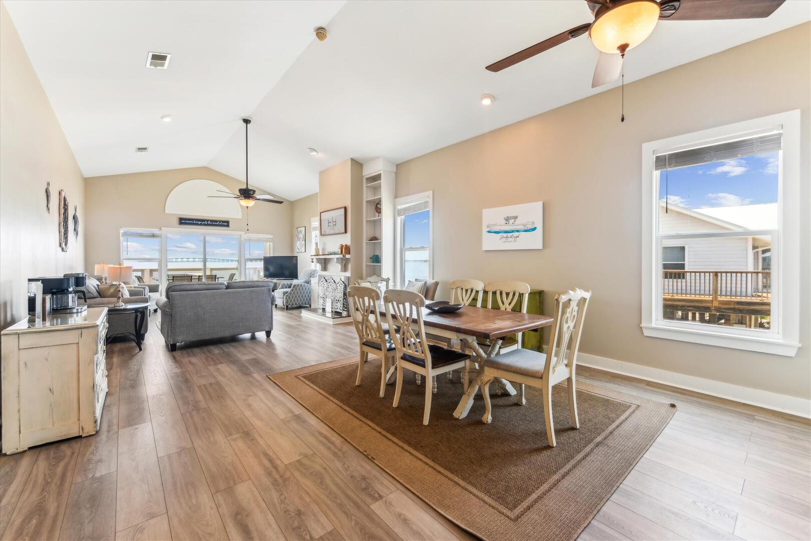 AMENITIES:Multiple TVs, DVD player, well equipped kitchen with granite countertops, luxury vinyl plank flooring throughout kitchen, main living area and bedrooms, covered deck overlooking the bay, outdoor firepit and sitting area. Private pool (heat or chill for a fee), enclosed hot/cold outdoor shower, fish cleaning station, park-style charcoal grill, sea wall with 185-foot private dock, and under-house concrete parking.