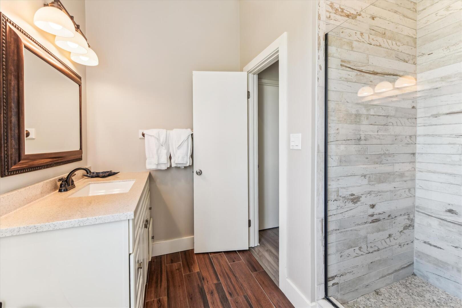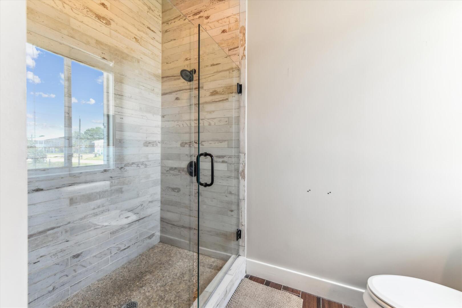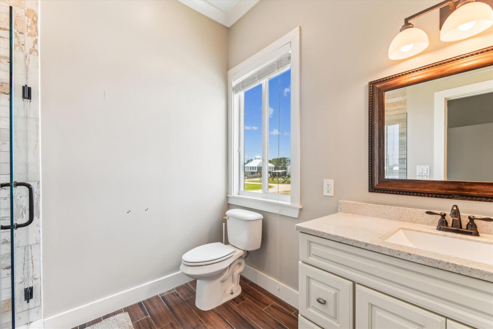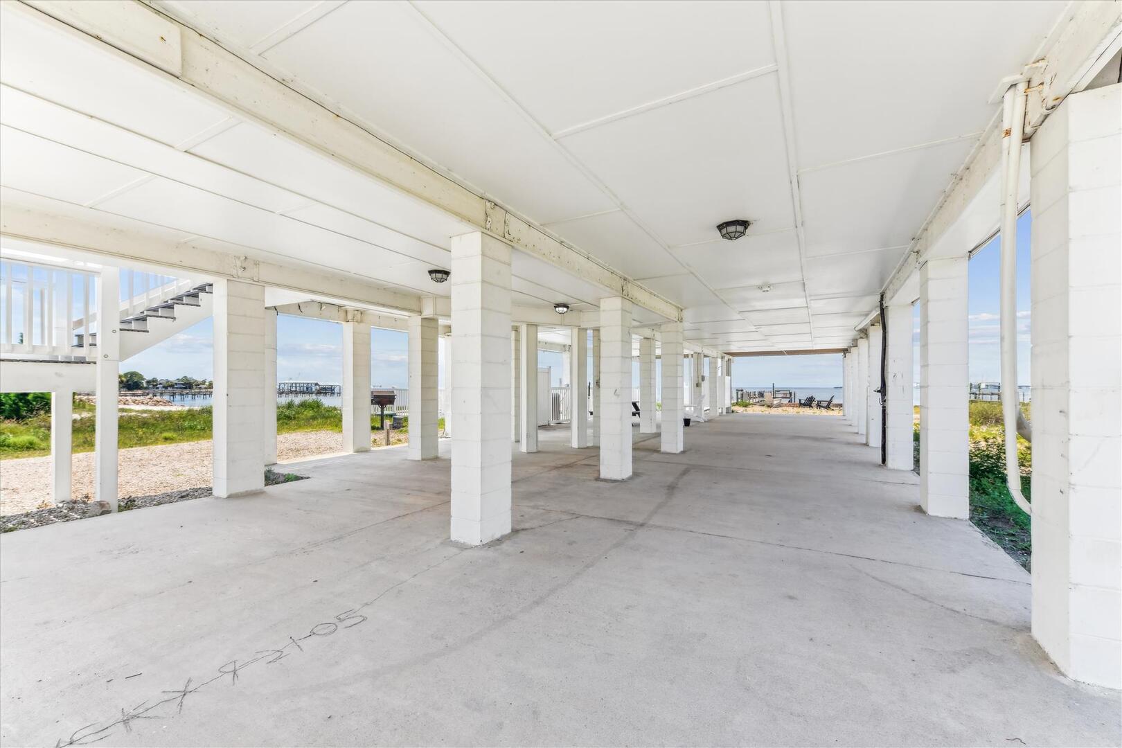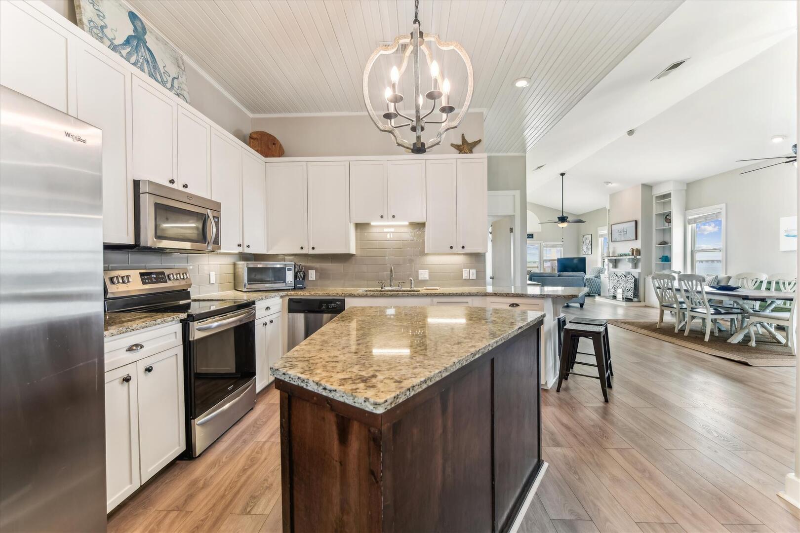AMENITIES:Multiple TVs, DVD player, well equipped kitchen with granite countertops, luxury vinyl plank flooring throughout kitchen, main living area and bedrooms, covered deck overlooking the bay, outdoor firepit and sitting area. Private pool (heat or chill for a fee), enclosed hot/cold outdoor shower, fish cleaning station, park-style charcoal grill, sea wall with 185-foot private dock, and under-house concrete parking.