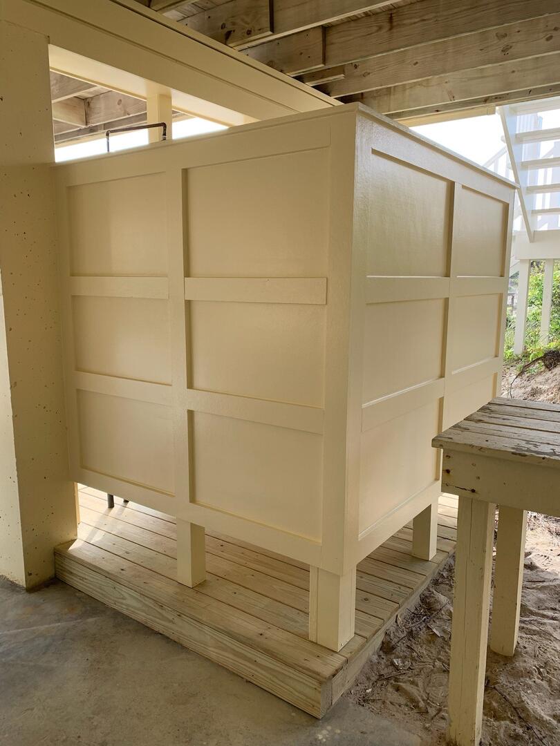 AMENITIES: Multiple TVs, DVD player, well equipped kitchen with pantry, carpet throughout, tile in kitchen, 1st level is bedroom level with large covered porch and access to beach boardwalk, hot/cold enclosed outdoor shower, fish cleaning station, park style charcoal grill, private boardwalk to beach, under house concrete parking.