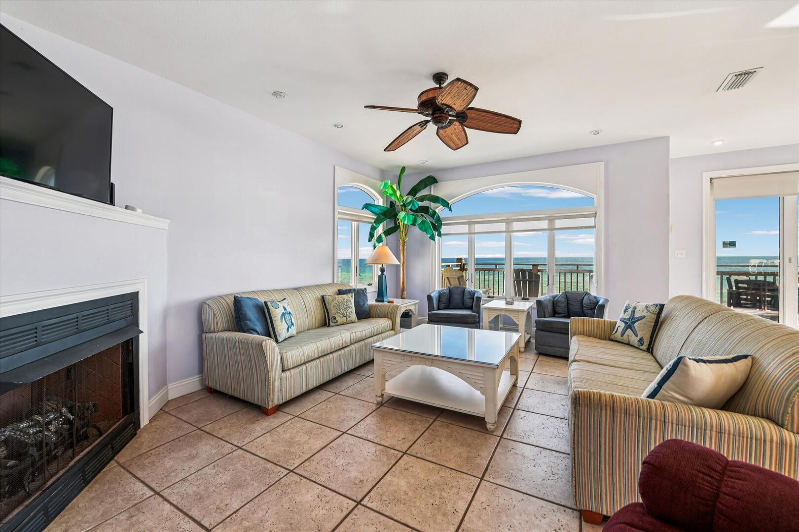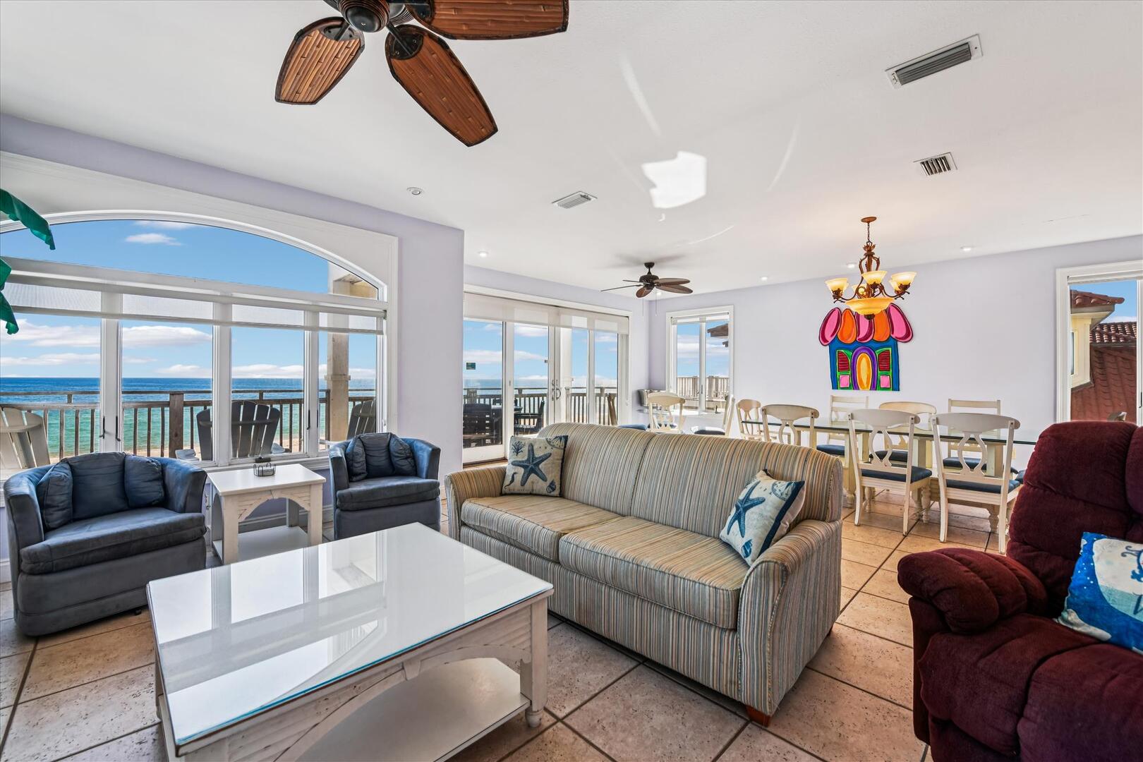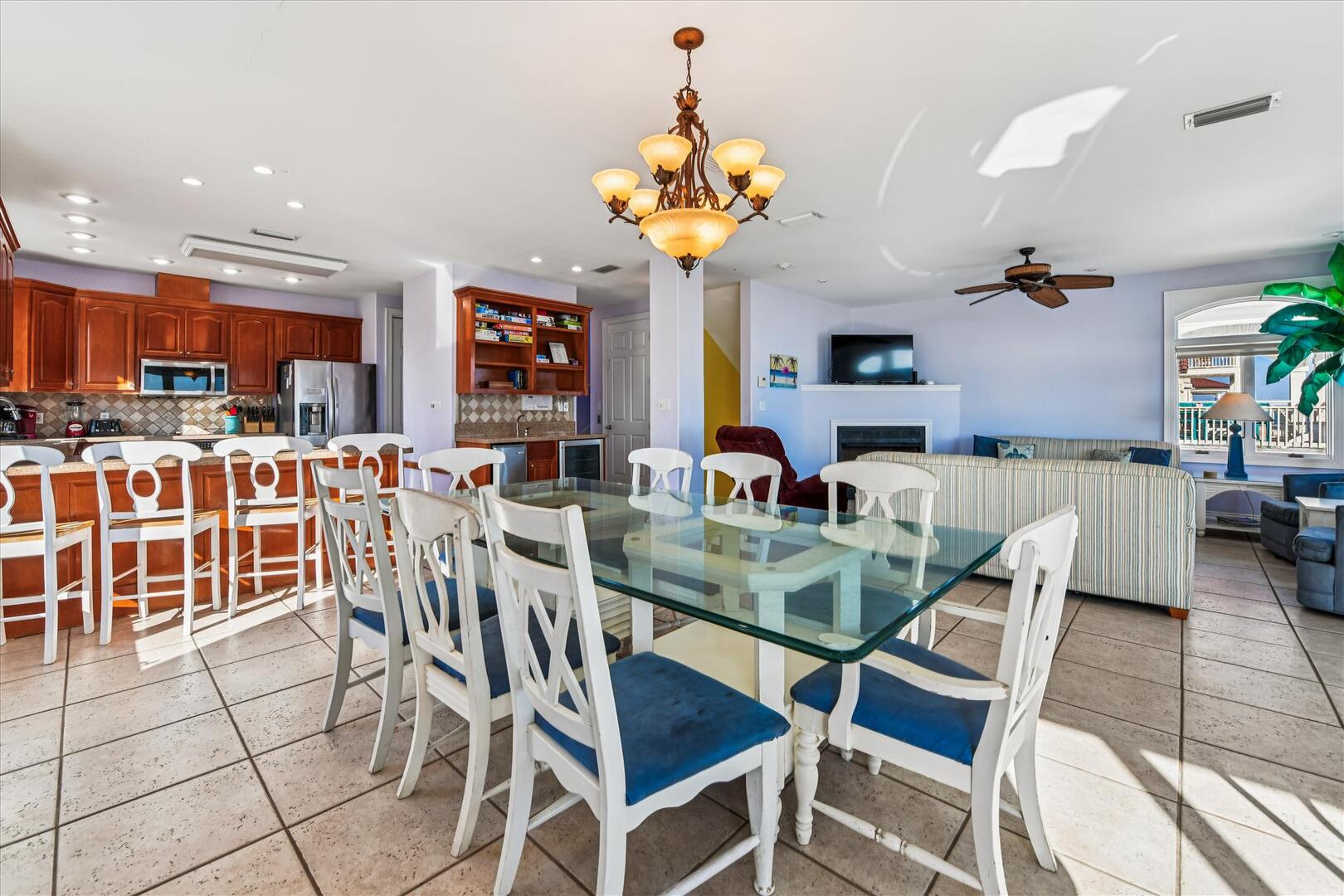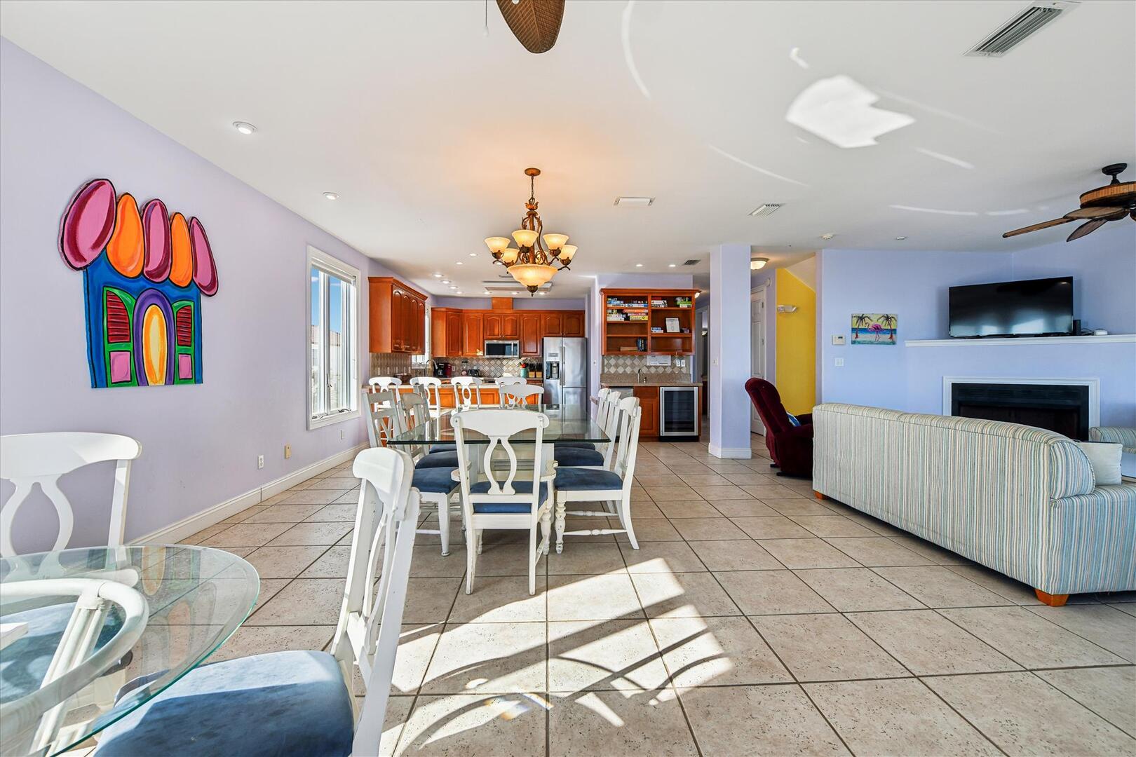 The second floor's open-concept common area includes a bright and airy living room, dining space, and fully equipped kitchen framed by arched windows that flood the space with natural light and offer sweeping Gulf views. The living area features a TV, cozy seating and a wet bar with a wine cooler and mini fridge -- perfect for entertaining.