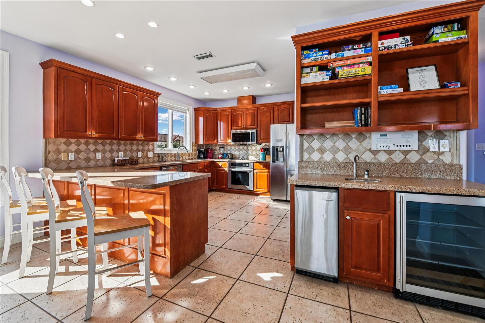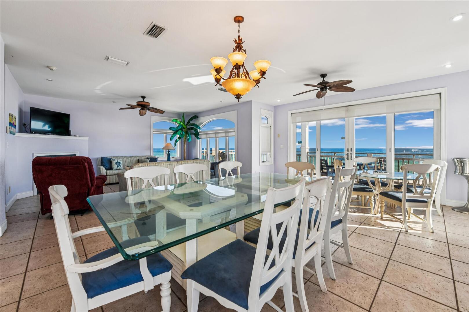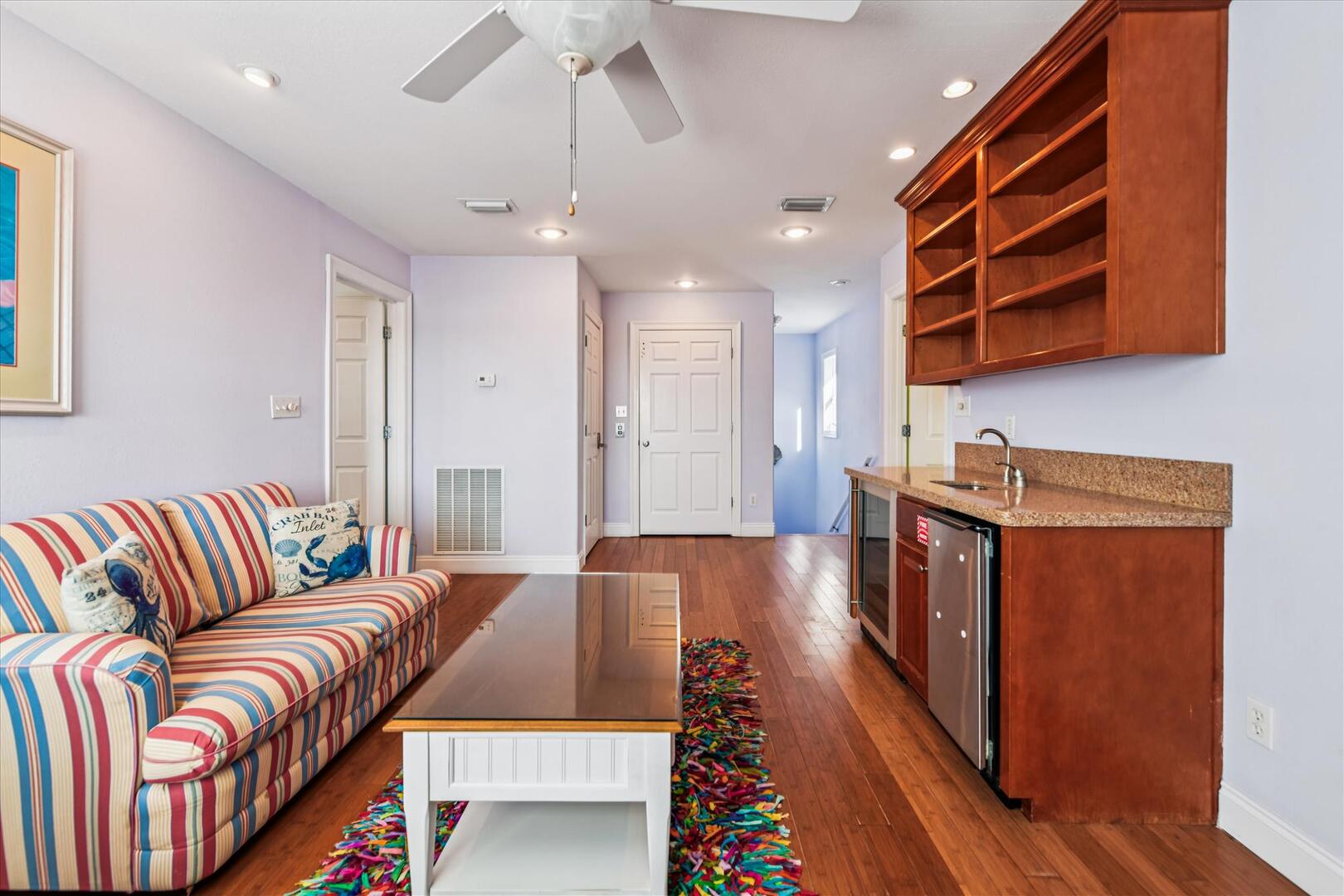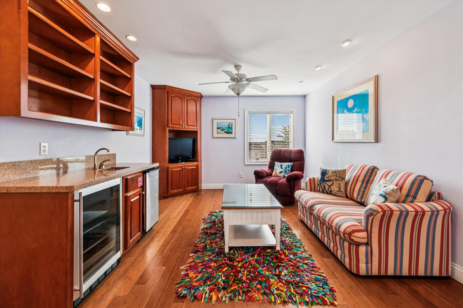 The second floor's open-concept common area includes a bright and airy living room, dining space, and fully equipped kitchen framed by arched windows that flood the space with natural light and offer sweeping Gulf views. The living area features a TV, cozy seating and a wet bar with a wine cooler and mini fridge -- perfect for entertaining.