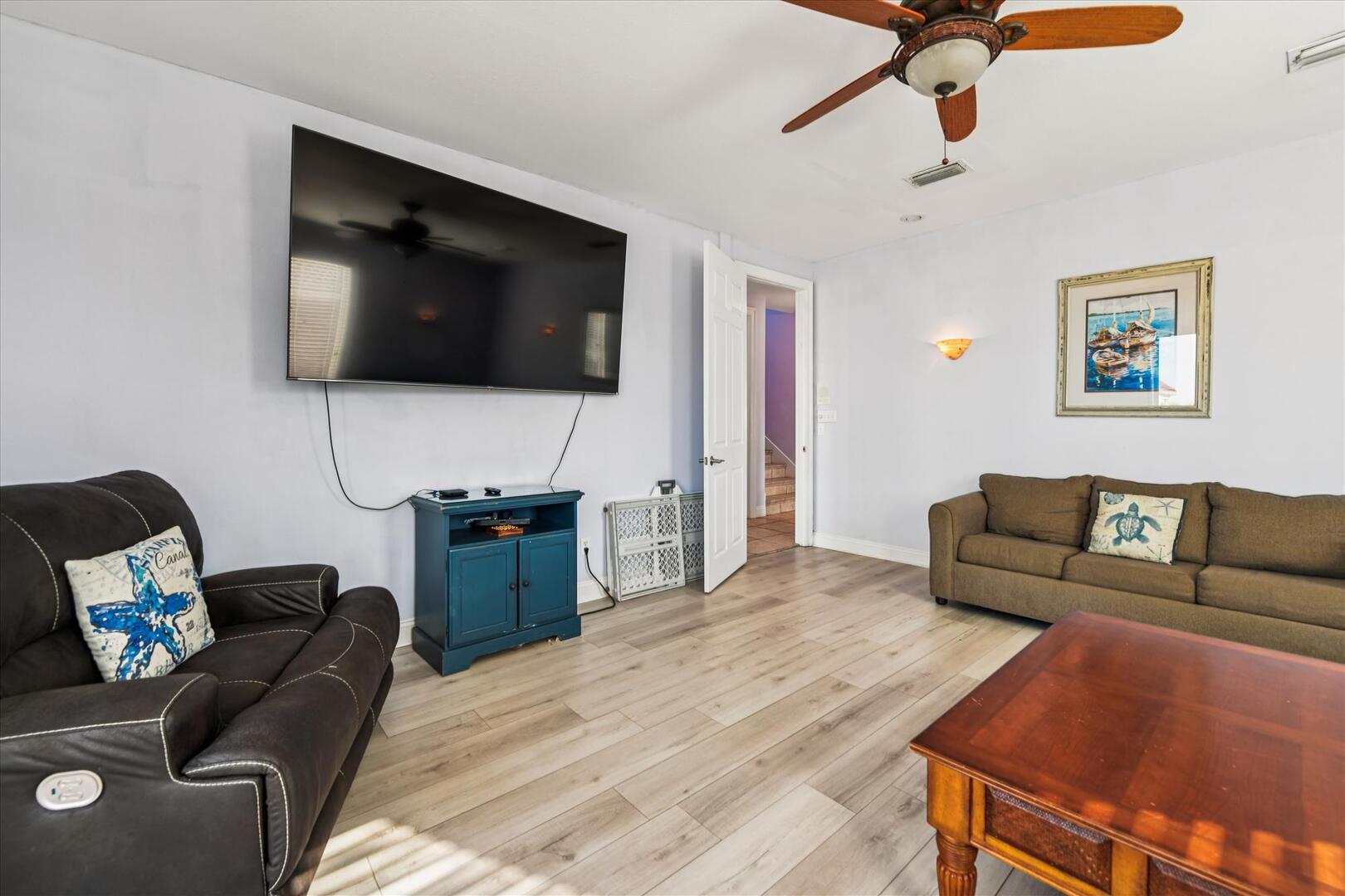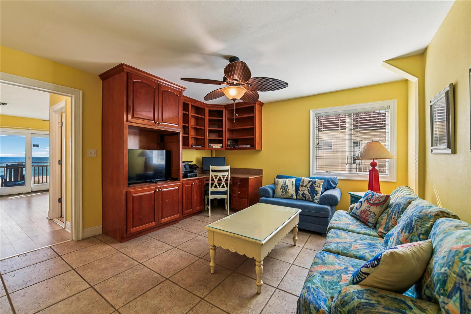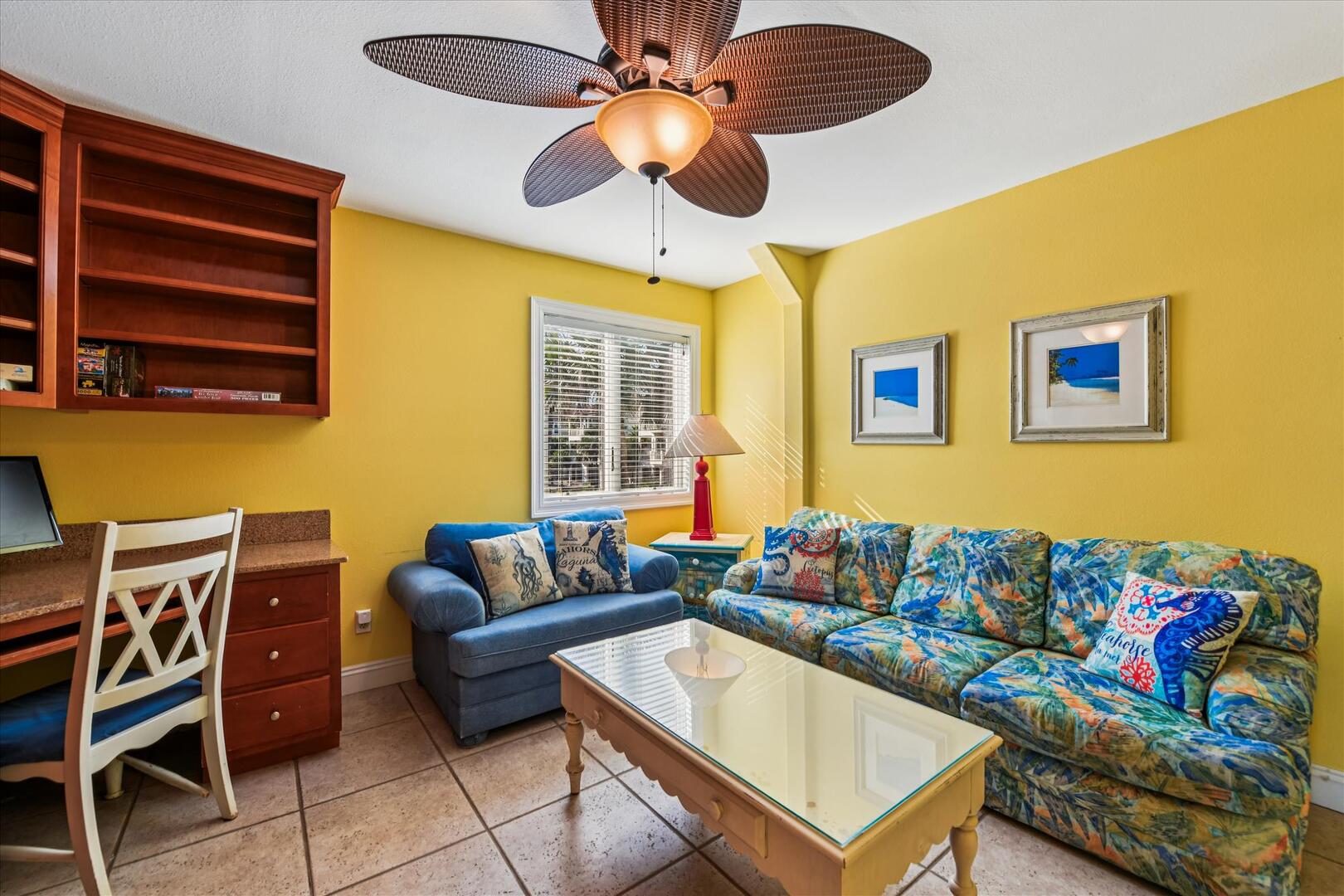 On the first floor, you'll find a comfortable living space complete with a large smart TV, ample seating, and a dedicated desk for remote work or planning your island adventures.