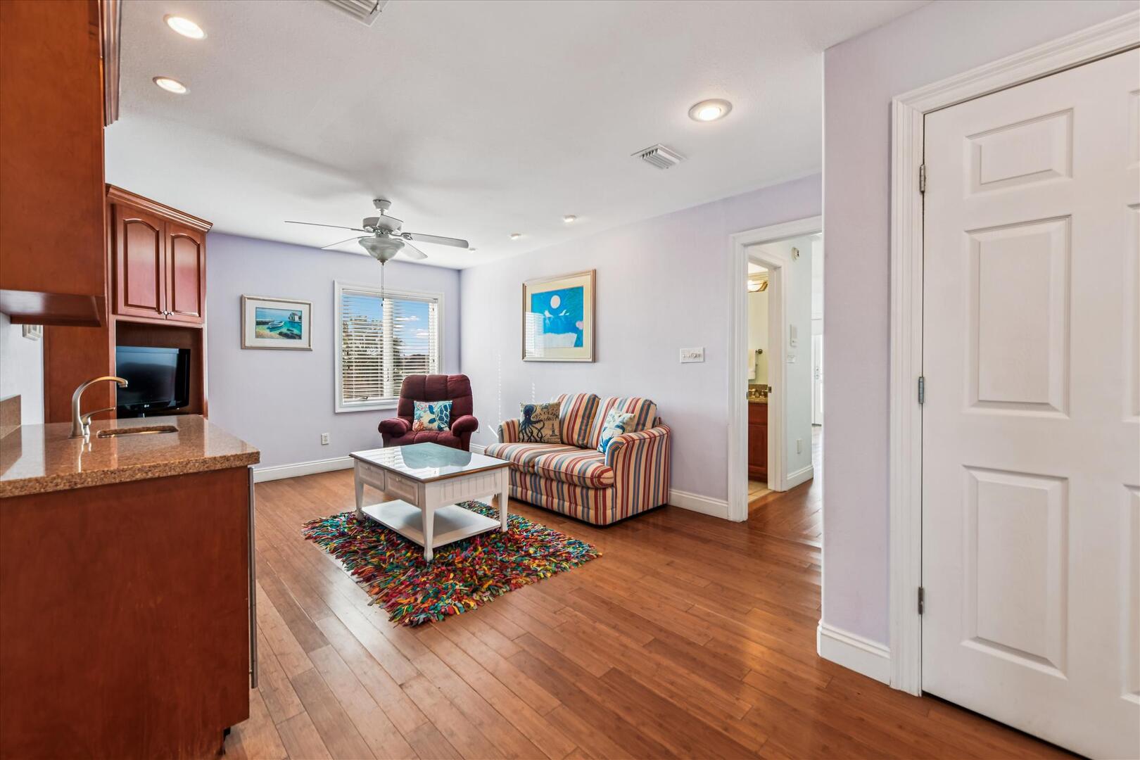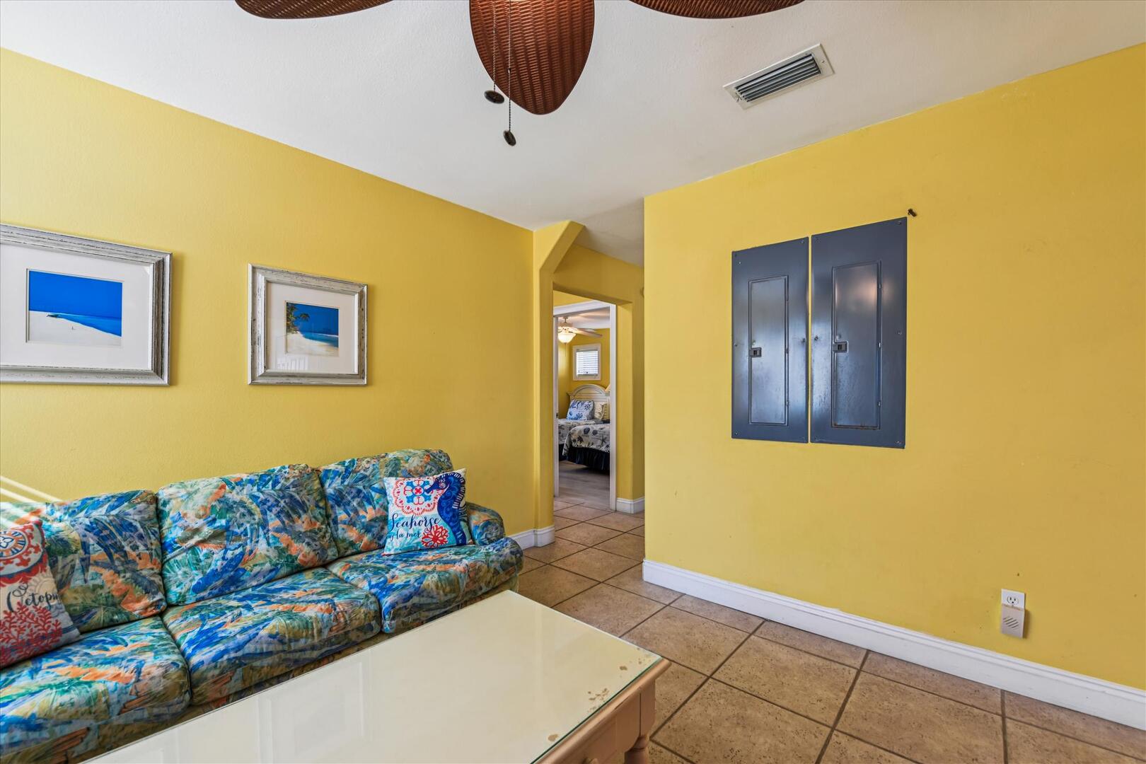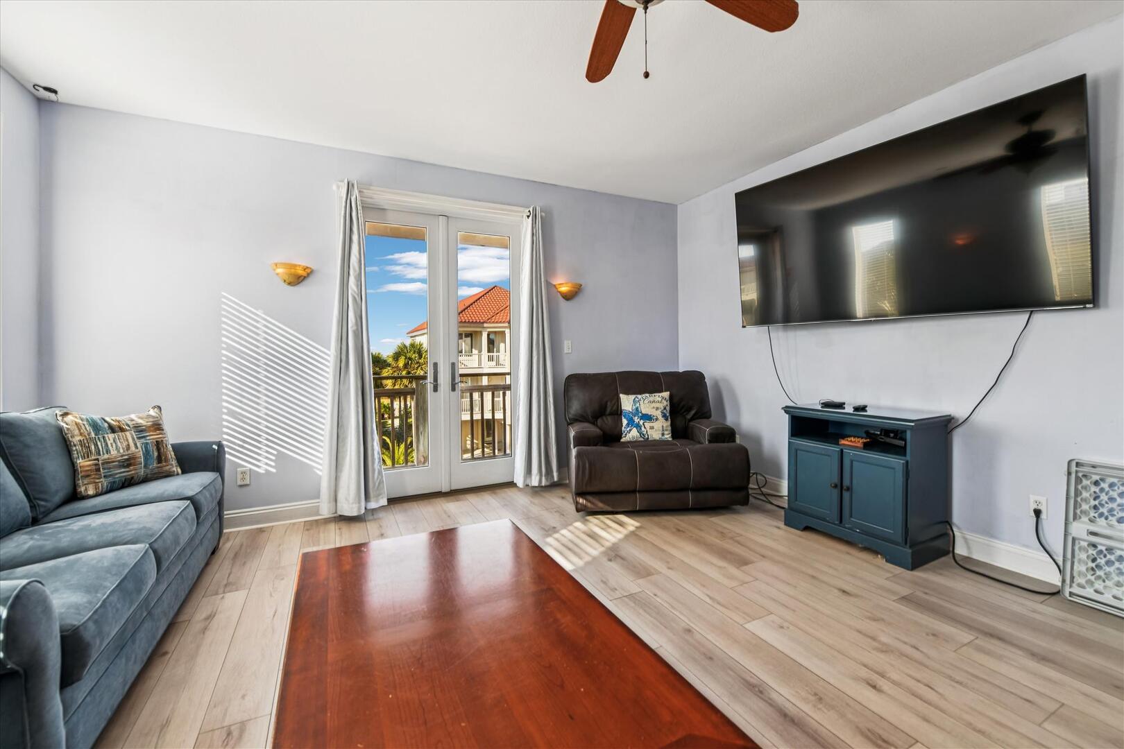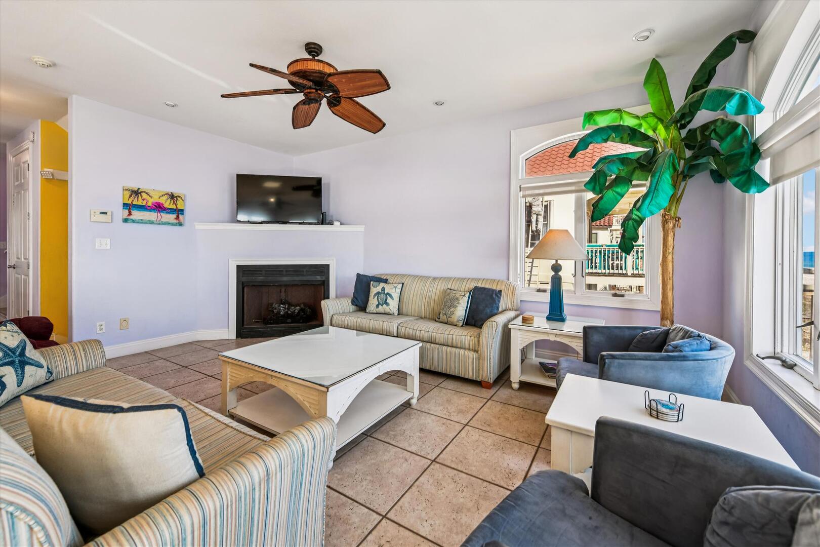 On the first floor, you'll find a comfortable living space complete with a large smart TV, ample seating, and a dedicated desk for remote work or planning your island adventures.