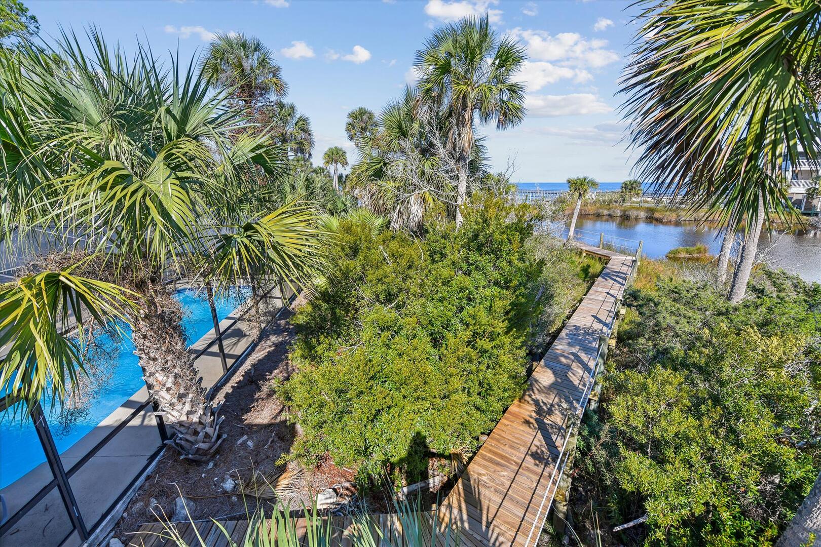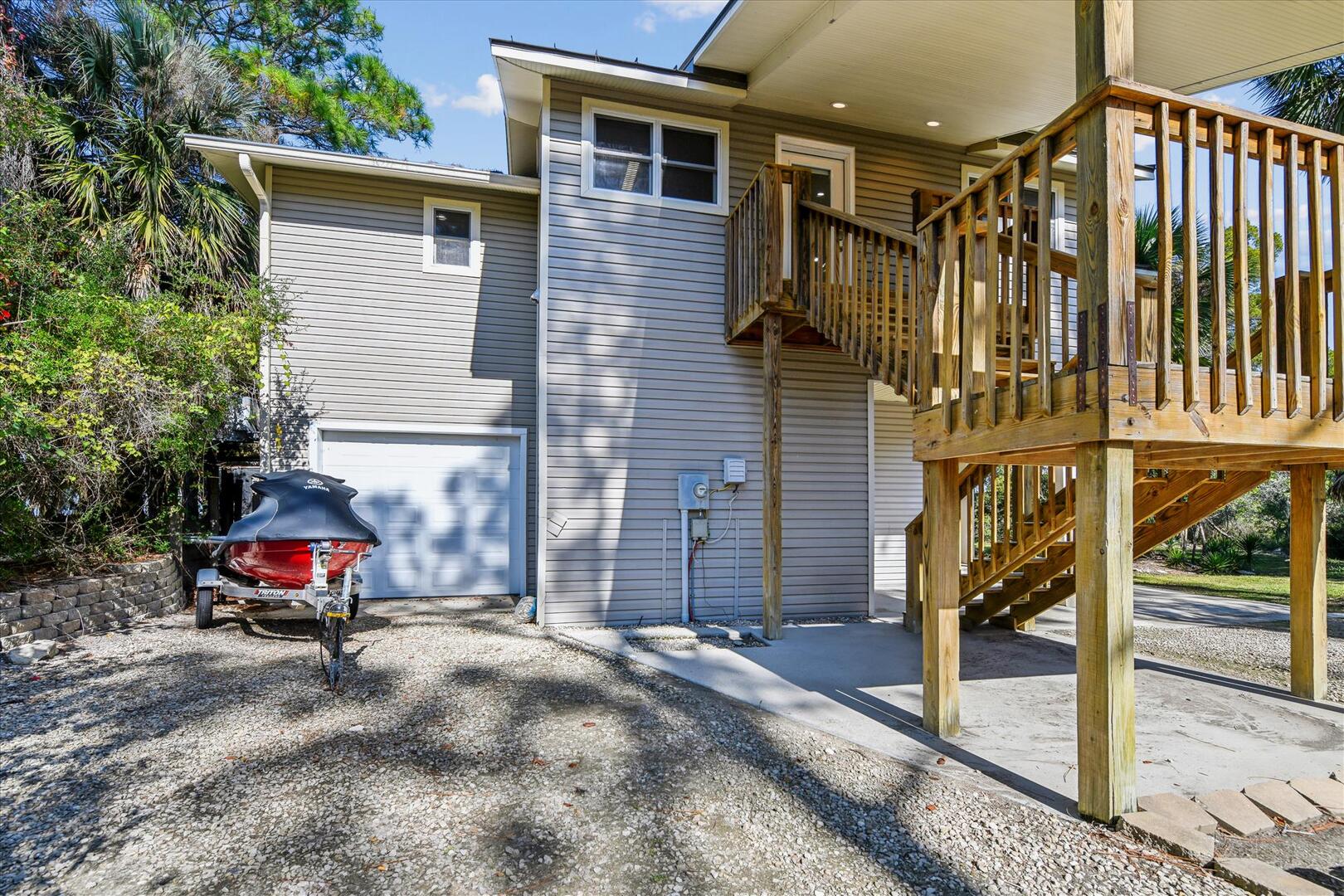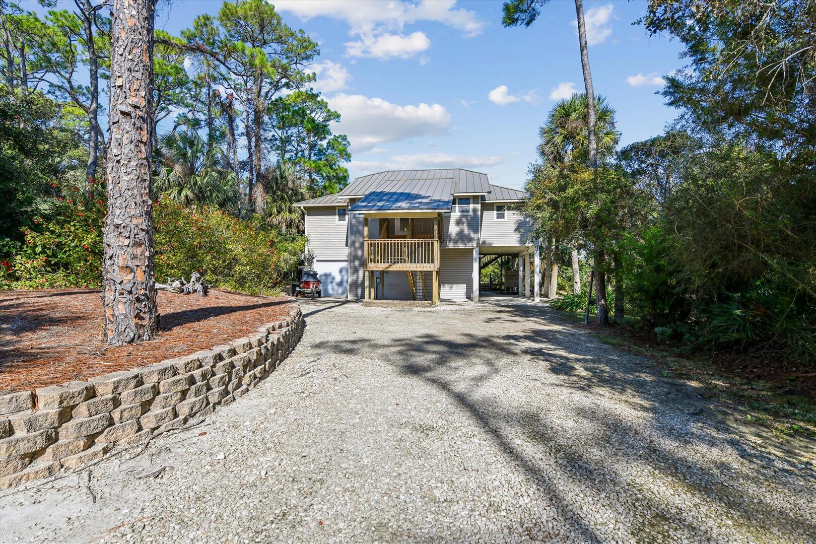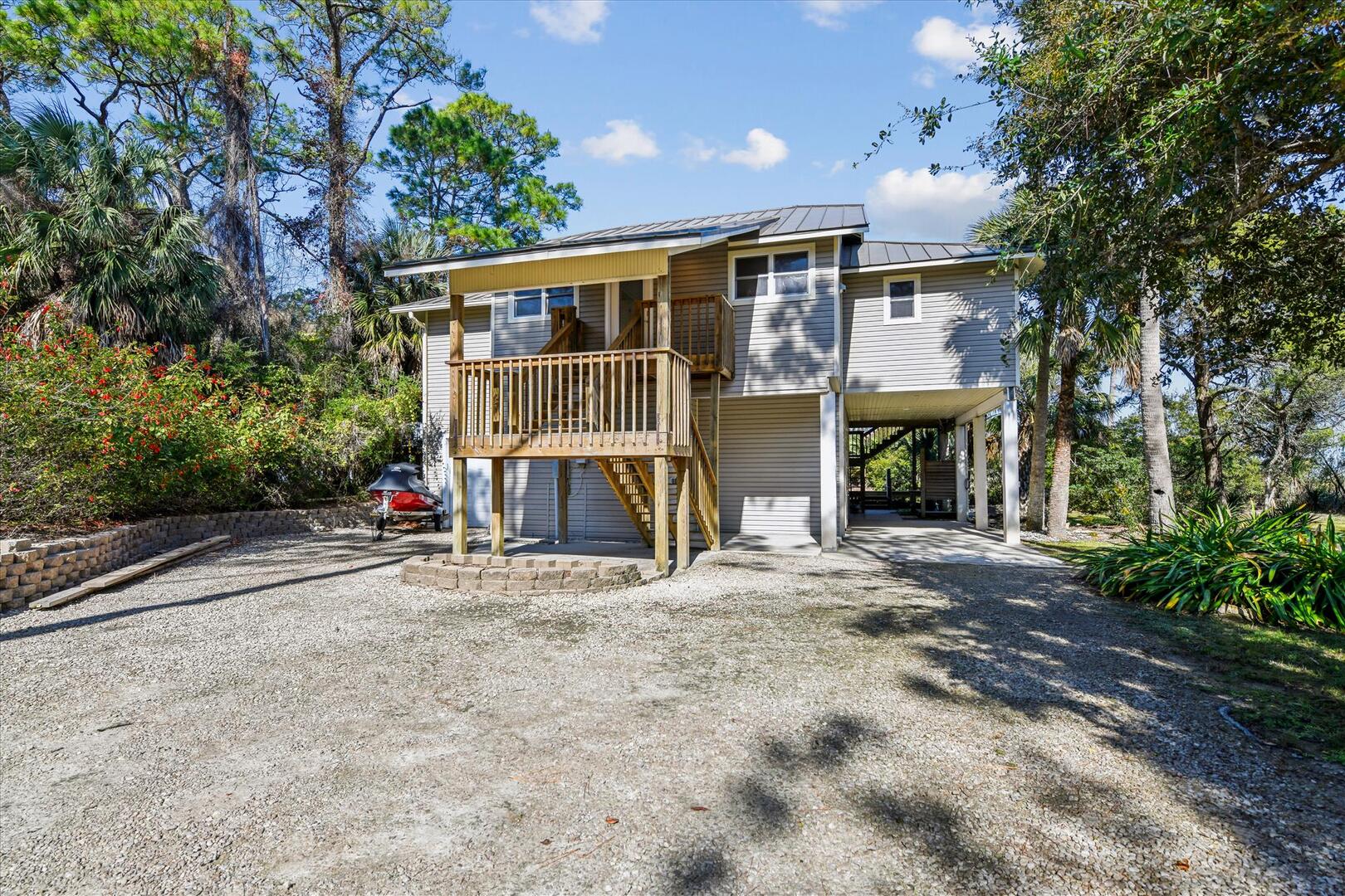 AMENITIES:Multiple TVs, newly remodeled in 2024 with a well equipped kitchen with quartz countertops and stainless appliances, luxury vinyl plank floors throughout, all new furniture, bedding and decor, queen murphy bed located in the living room, large screened in porch and sun decks, laundry room with half bath, private screen-enclosed pool with large deck, under house screened area, under house parking, outdoor shower, park style charcoal grill and boardwalk to private dock. This home has access to the Plantation Clubhouse with community pools, tennis courts, pickle ball courts and fitness center. Garage and under house storage is not for guest use.
