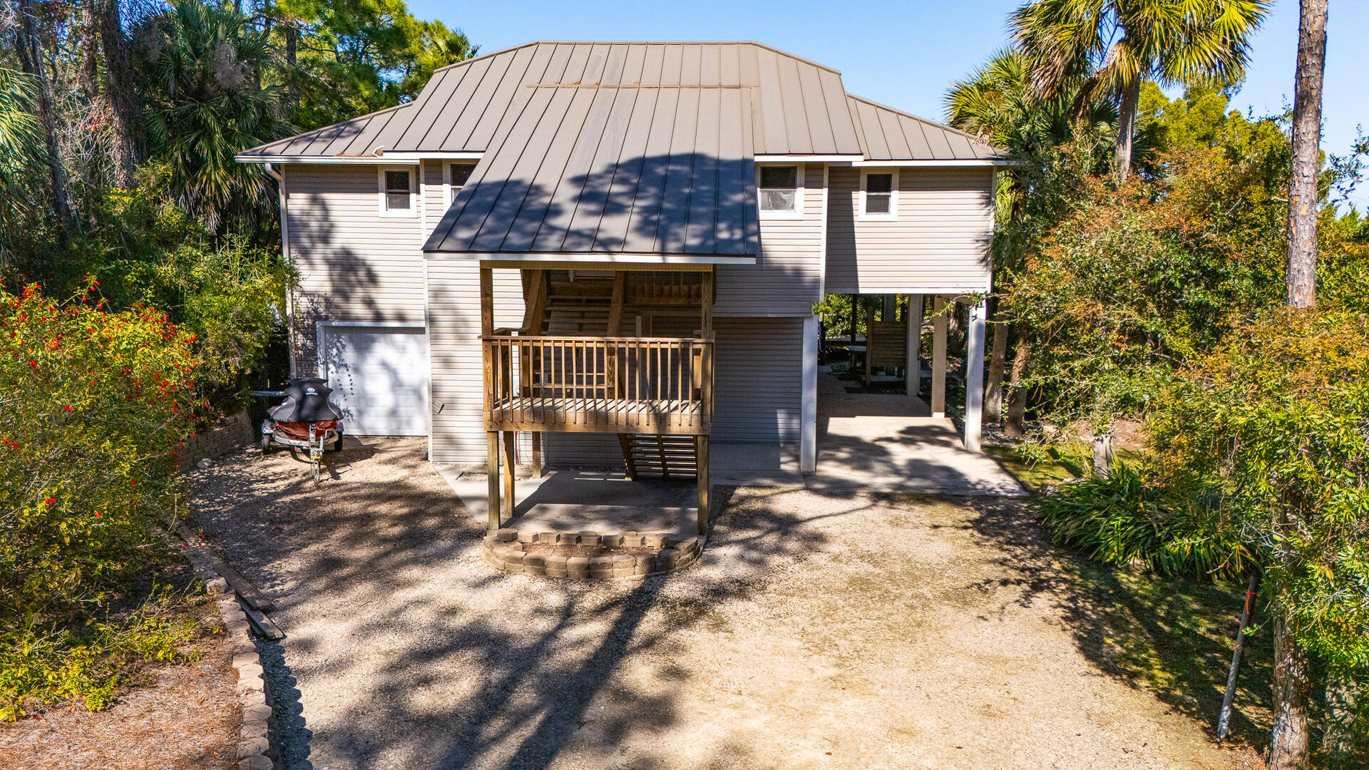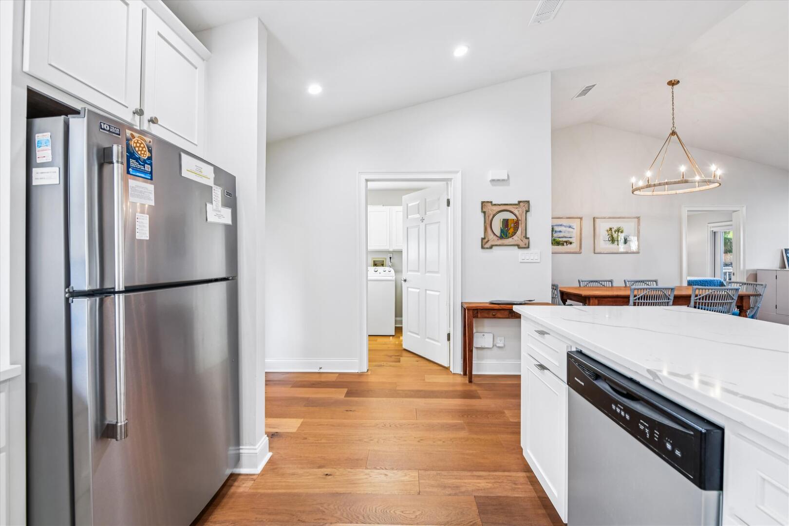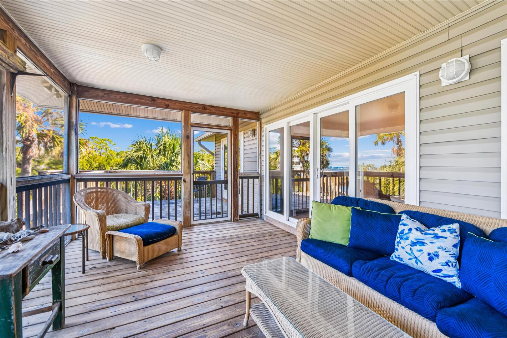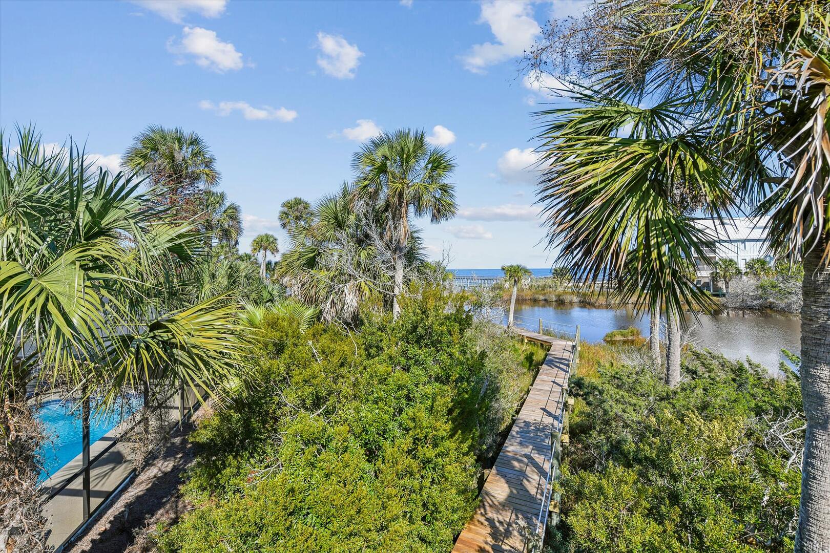 AMENITIES:Multiple TVs, newly remodeled in 2024 with a well equipped kitchen with quartz countertops and stainless appliances, luxury vinyl plank floors throughout, all new furniture, bedding and decor, queen murphy bed located in the living room, large screened in porch and sun decks, laundry room with half bath, private screen-enclosed pool with large deck, under house screened area, under house parking, outdoor shower, park style charcoal grill and boardwalk to private dock. This home has access to the Plantation Clubhouse with community pools, tennis courts, pickle ball courts and fitness center. Garage and under house storage is not for guest use.