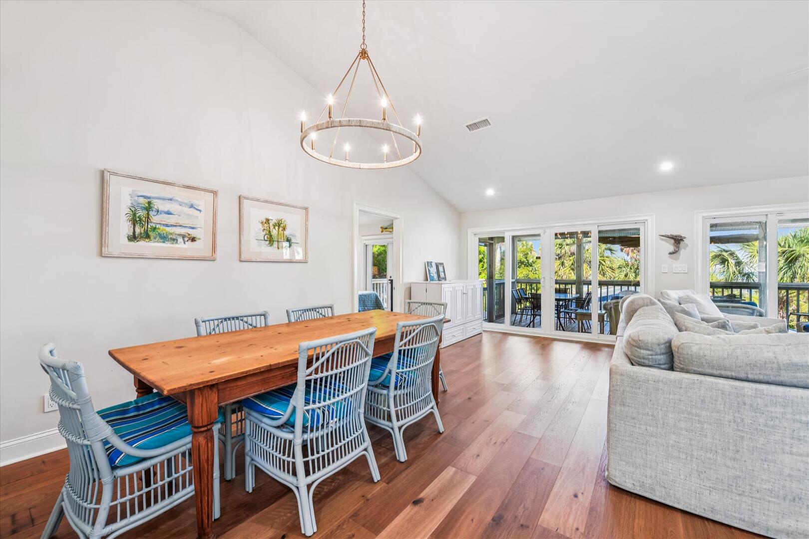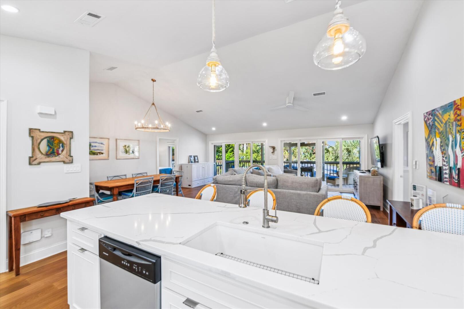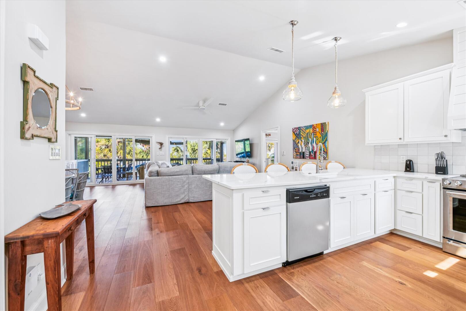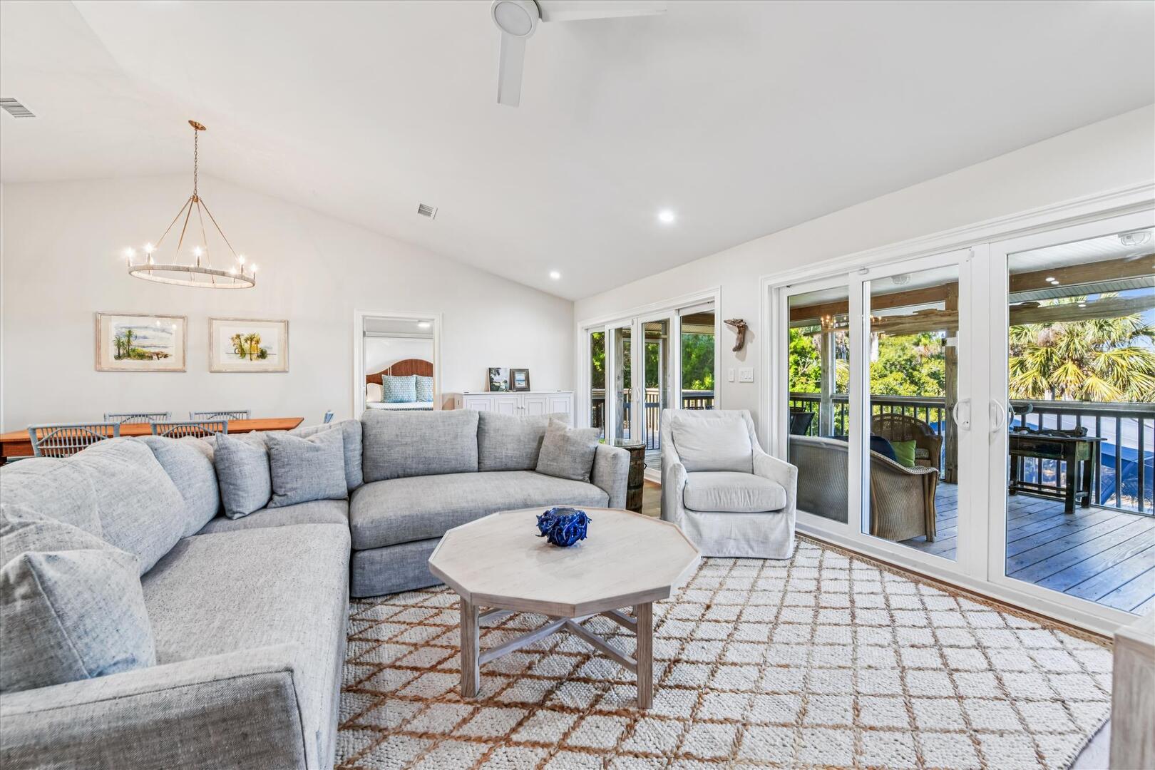 Step inside to an open-concept living space with breathtaking views of Apalachicola Bay and the private pool. The well-equipped kitchen boasts stainless appliances, a breakfast bar with seating for four and a spacious dining area with a large wooden table for six. The inviting living area features a plush sectional and a TV, perfect for relaxing after a day on the water.