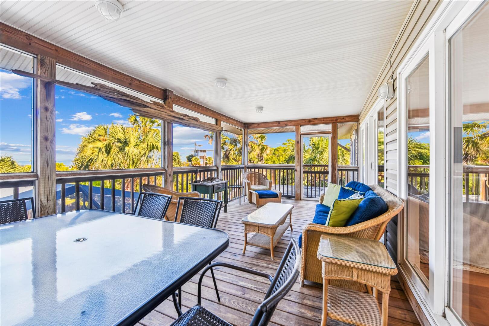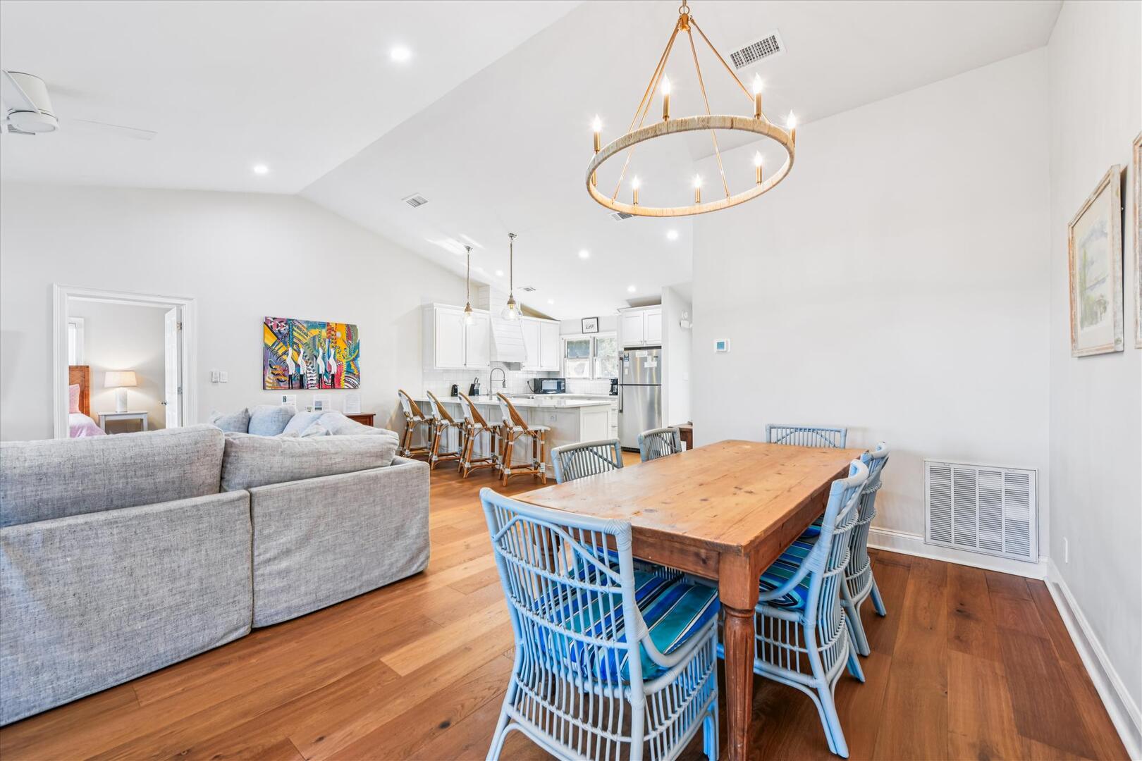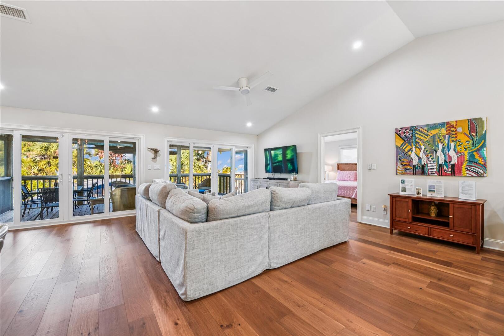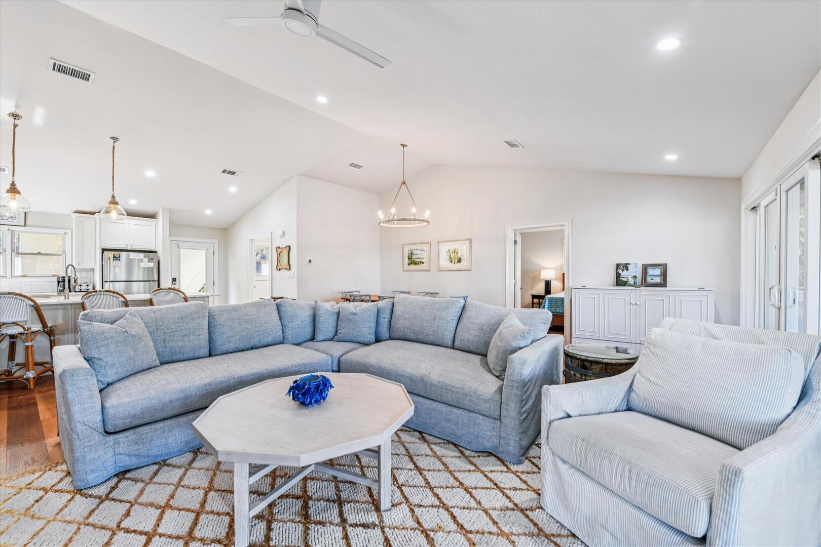 Step inside to an open-concept living space with breathtaking views of Apalachicola Bay and the private pool. The well-equipped kitchen boasts stainless appliances, a breakfast bar with seating for four and a spacious dining area with a large wooden table for six. The inviting living area features a plush sectional and a TV, perfect for relaxing after a day on the water.