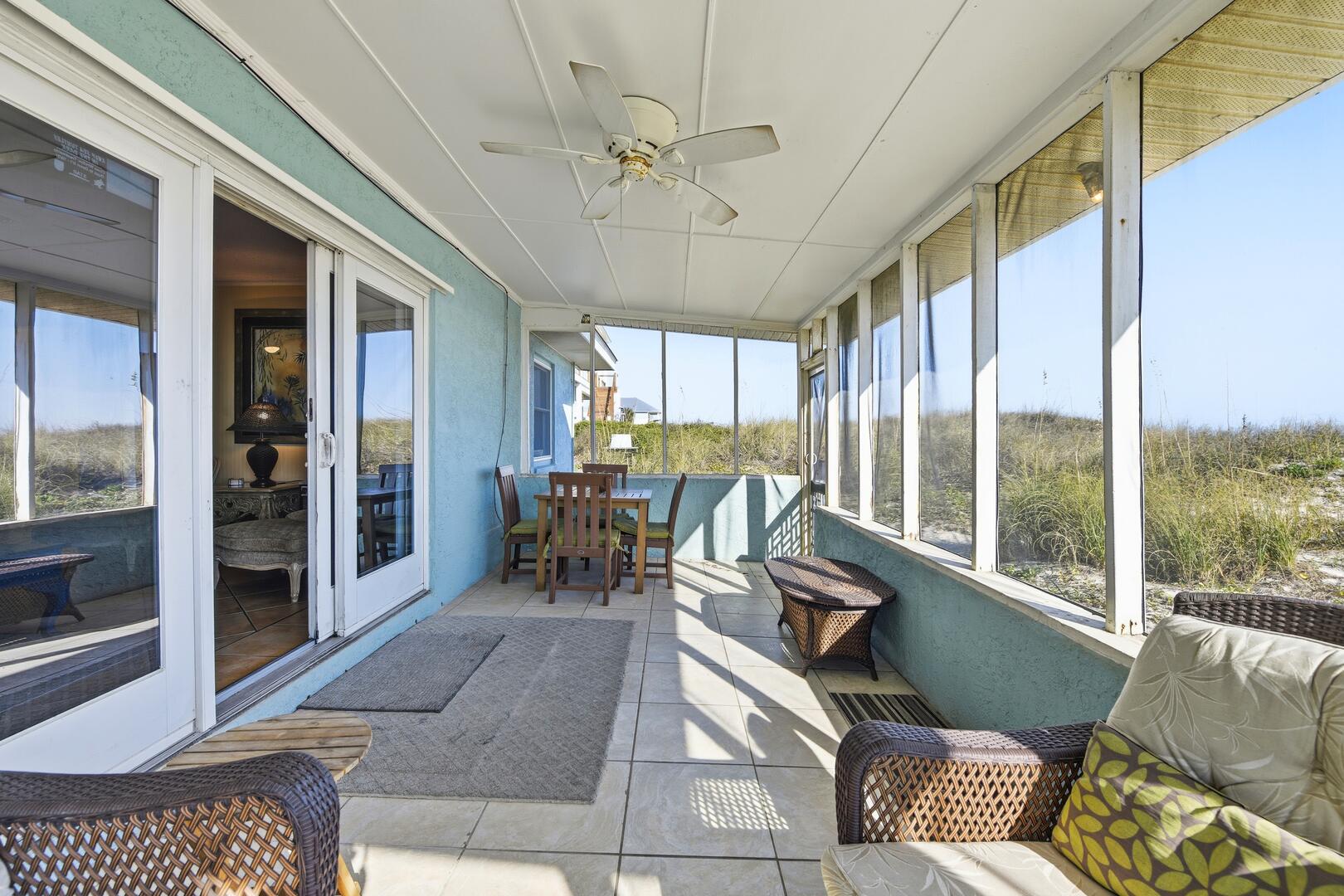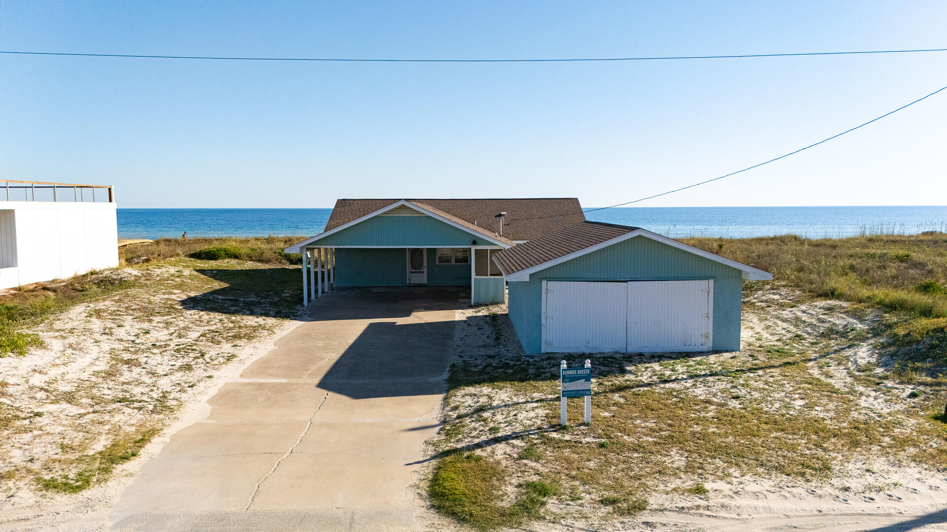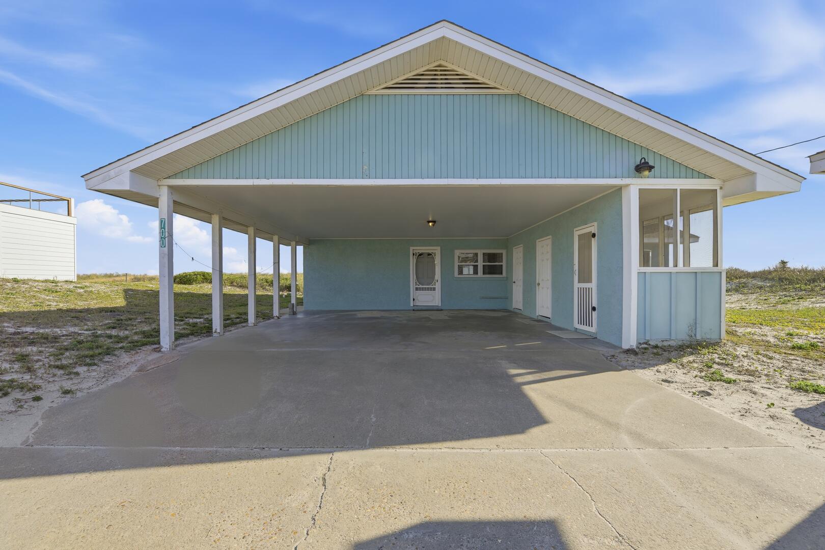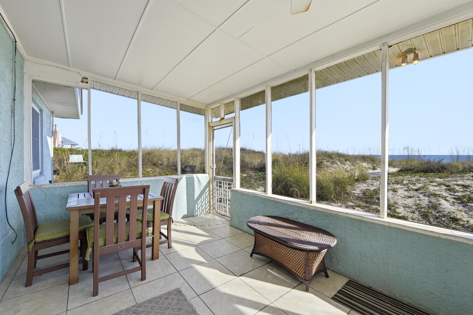 SUMMER BREEZE WILL MAKE YOU FEEL FINE when you escape to this sunny beachfront home! Sweeping views from all rooms will melt your cares. Tastefully furnished, family friendly home is perfect for pets, small children and those with knee issues as there are no stairs or balconies. Stay cool as you park in the shady carport large enough for four vehicles and unpack your groceries seamlessly into the well appointed kitchen. Lounge on the oceanfront screened porch curled up with a book from the large lending library. Play cards, games or put together a puzzle on the over sized dining table. The spacious screened porch also boasts dining furniture for coffee or cocktails while enjoying the ocean breezes. Grill out and dine beachfront on your private ground level sun deck! The split floor plan affords privacy for large gatherings or two families traveling together. House is close to center of the Island, but worlds away in terms of privacy, seclusion and close neighbors. Sleep well at night with upgraded mattresses listening to the sound of the waves.