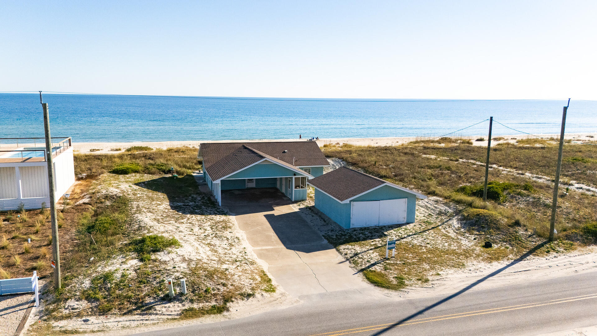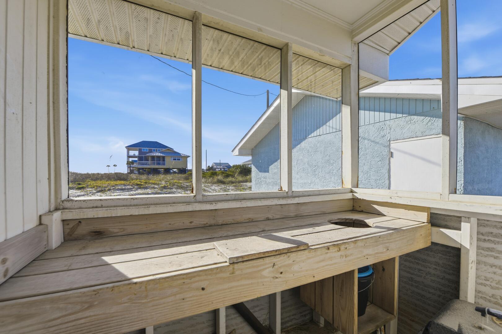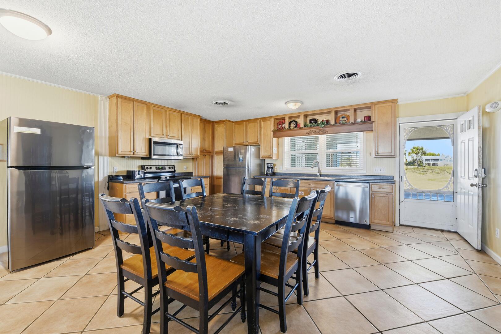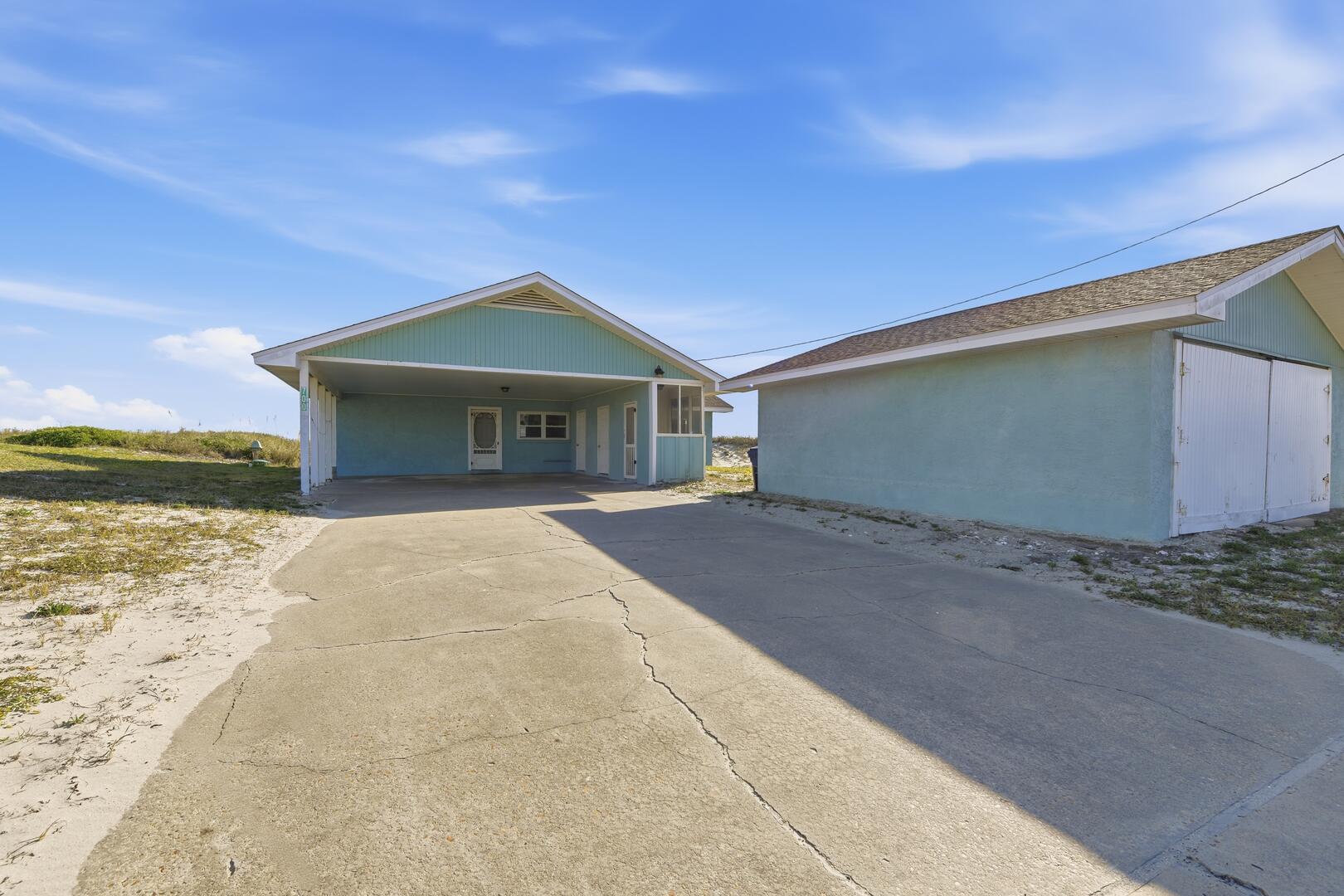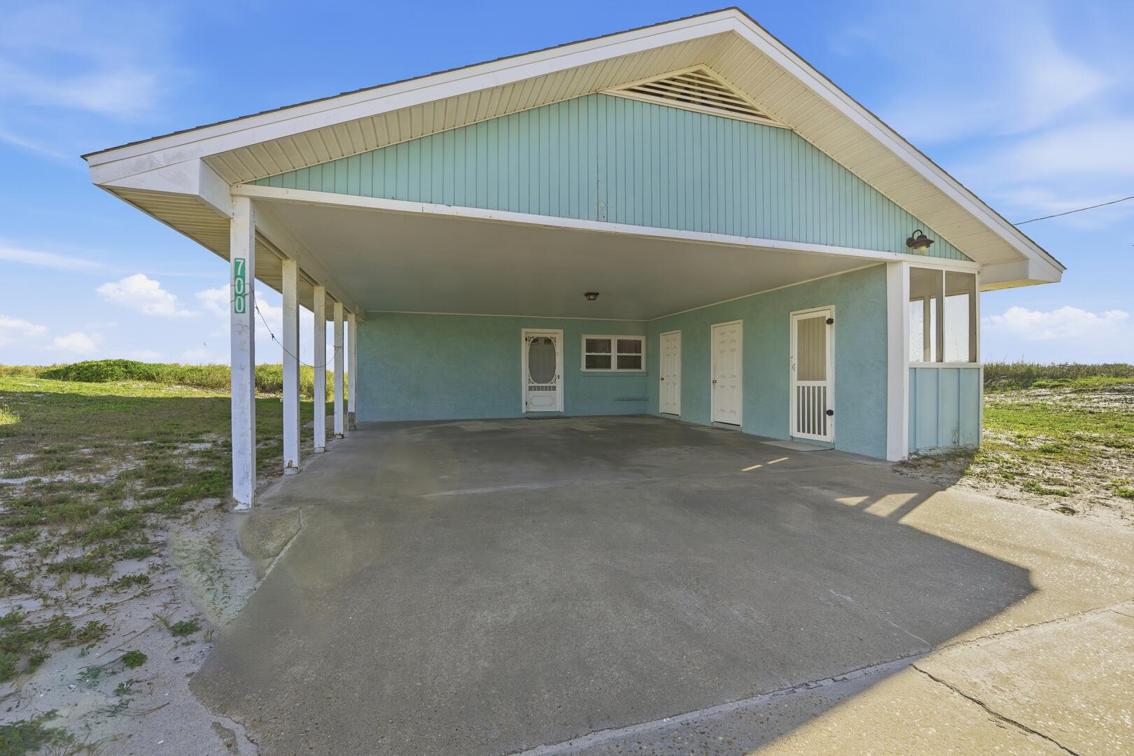 SUMMER BREEZE WILL MAKE YOU FEEL FINE when you escape to this sunny beachfront home! Sweeping views from all rooms will melt your cares. Tastefully furnished, family friendly home is perfect for pets, small children and those with knee issues as there are no stairs or balconies. Stay cool as you park in the shady carport large enough for four vehicles and unpack your groceries seamlessly into the well appointed kitchen. Lounge on the oceanfront screened porch curled up with a book from the large lending library. Play cards, games or put together a puzzle on the over sized dining table. The spacious screened porch also boasts dining furniture for coffee or cocktails while enjoying the ocean breezes. Grill out and dine beachfront on your private ground level sun deck! The split floor plan affords privacy for large gatherings or two families traveling together. House is close to center of the Island, but worlds away in terms of privacy, seclusion and close neighbors. Sleep well at night with upgraded mattresses listening to the sound of the waves.