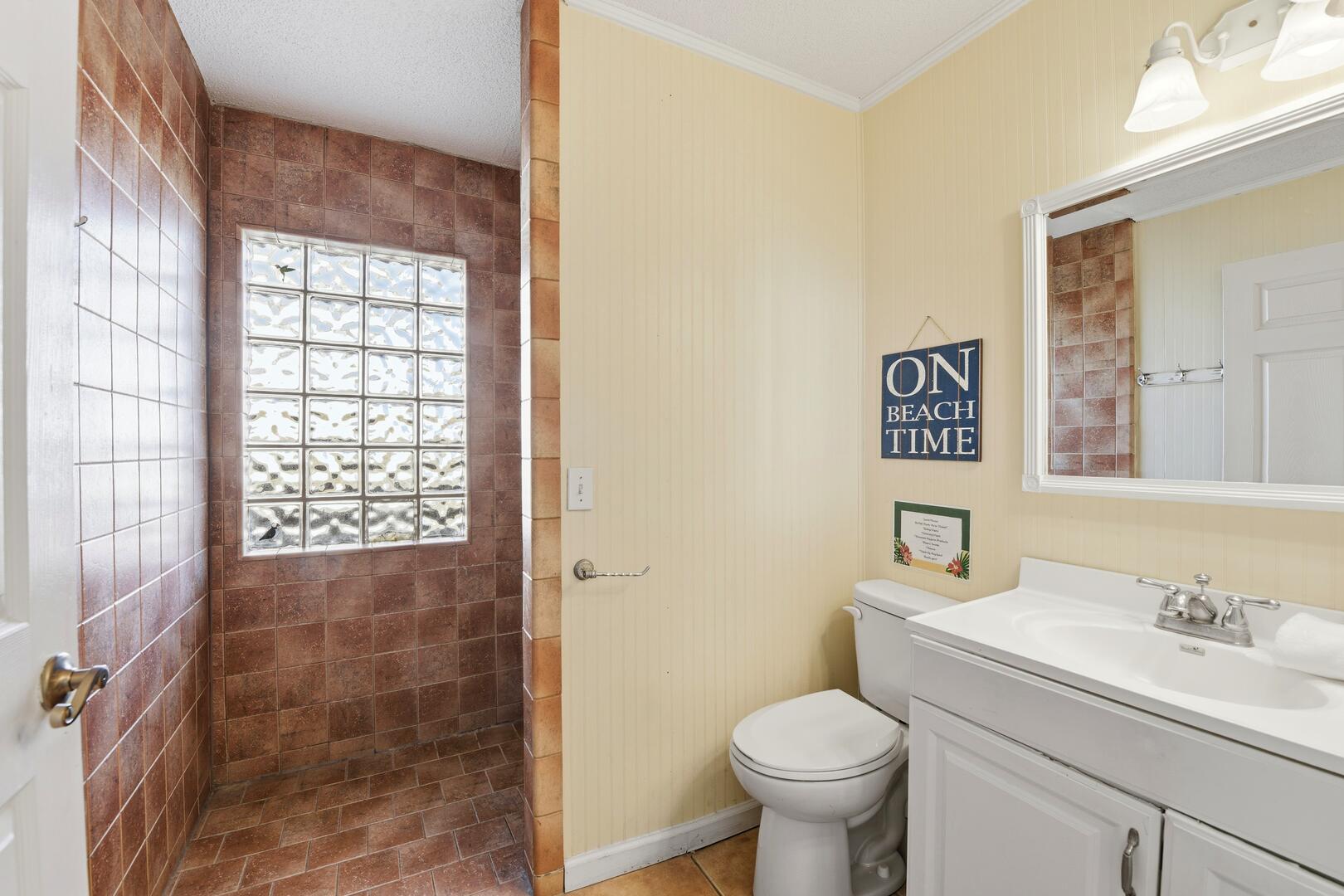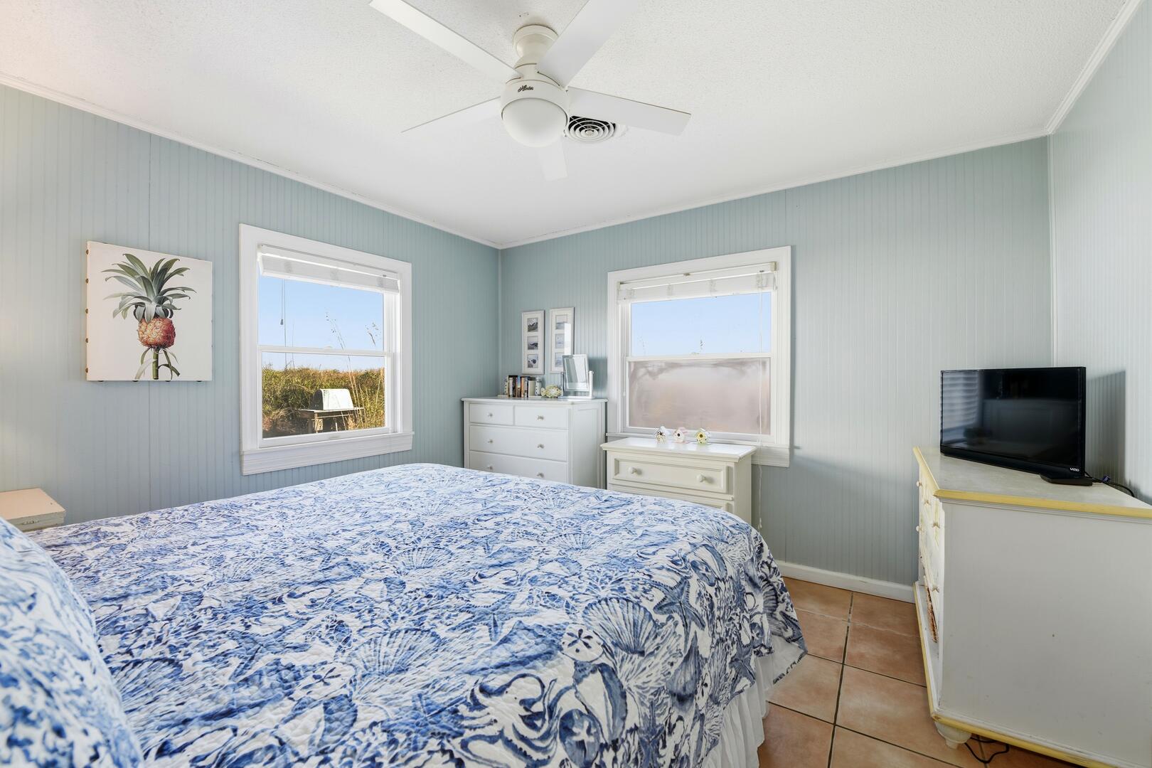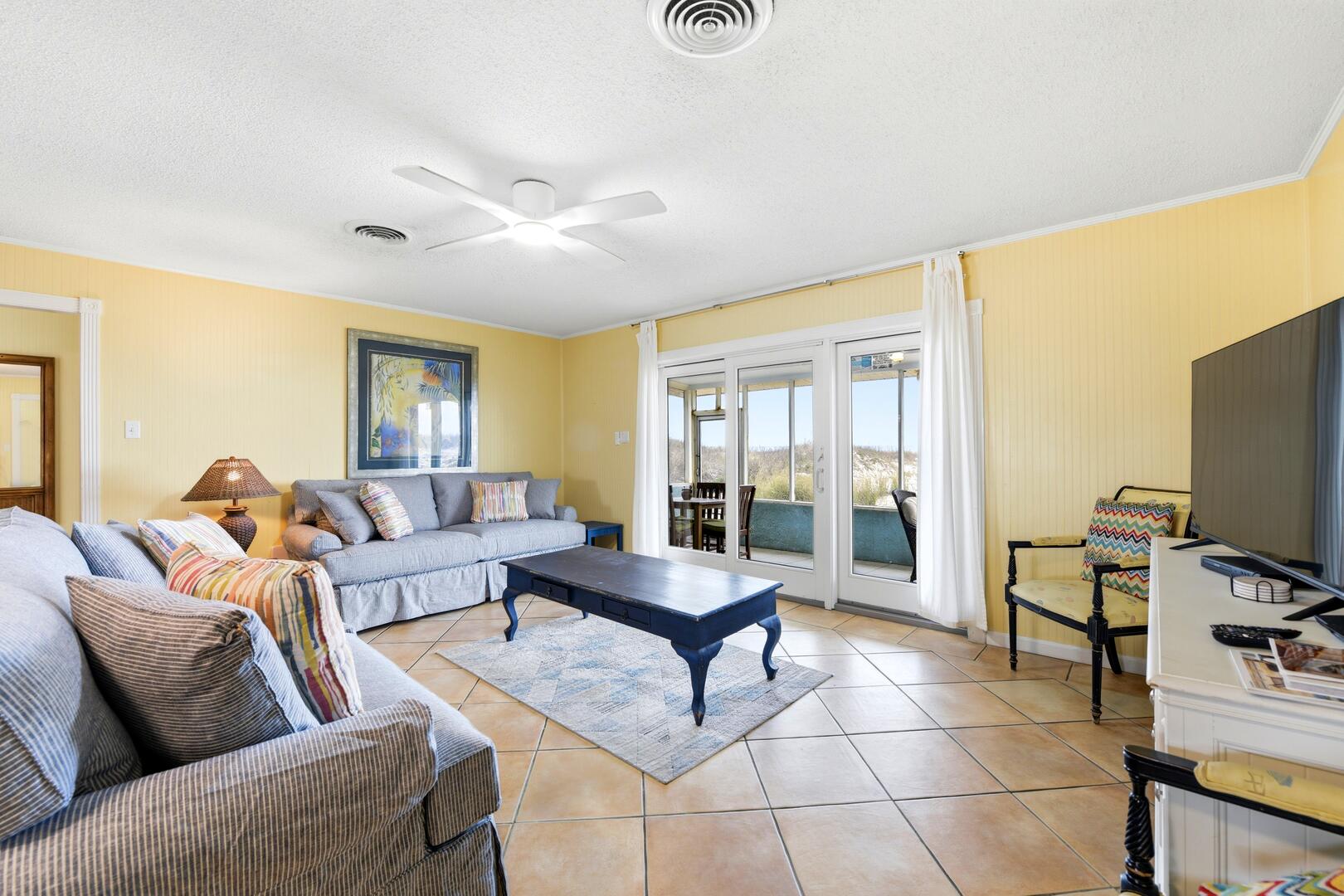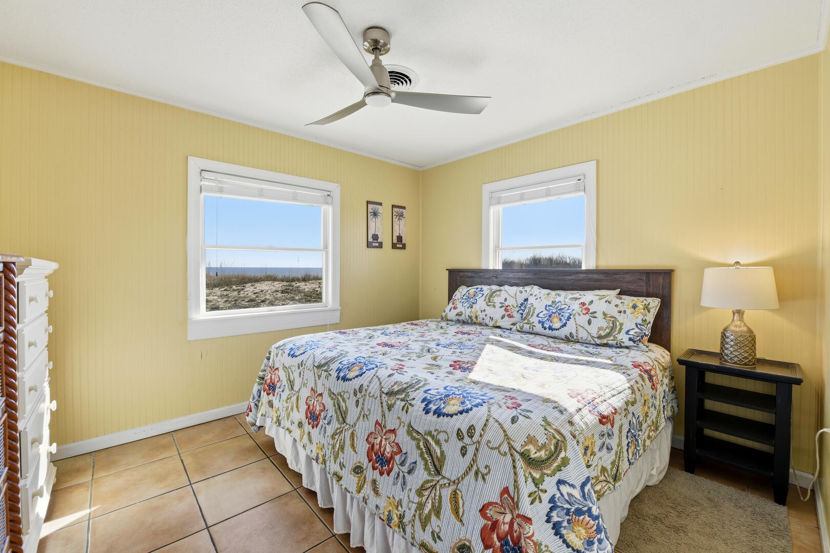 SUMMER BREEZE WILL MAKE YOU FEEL FINE when you escape to this sunny beachfront home! Sweeping views from all rooms will melt your cares. Tastefully furnished, family friendly home is perfect for pets, small children and those with knee issues as there are no stairs or balconies. Stay cool as you park in the shady carport large enough for four vehicles and unpack your groceries seamlessly into the well appointed kitchen. Lounge on the oceanfront screened porch curled up with a book from the large lending library. Play cards, games or put together a puzzle on the over sized dining table. The spacious screened porch also boasts dining furniture for coffee or cocktails while enjoying the ocean breezes. Grill out and dine beachfront on your private ground level sun deck! The split floor plan affords privacy for large gatherings or two families traveling together. House is close to center of the Island, but worlds away in terms of privacy, seclusion and close neighbors. Sleep well at night with upgraded mattresses listening to the sound of the waves.