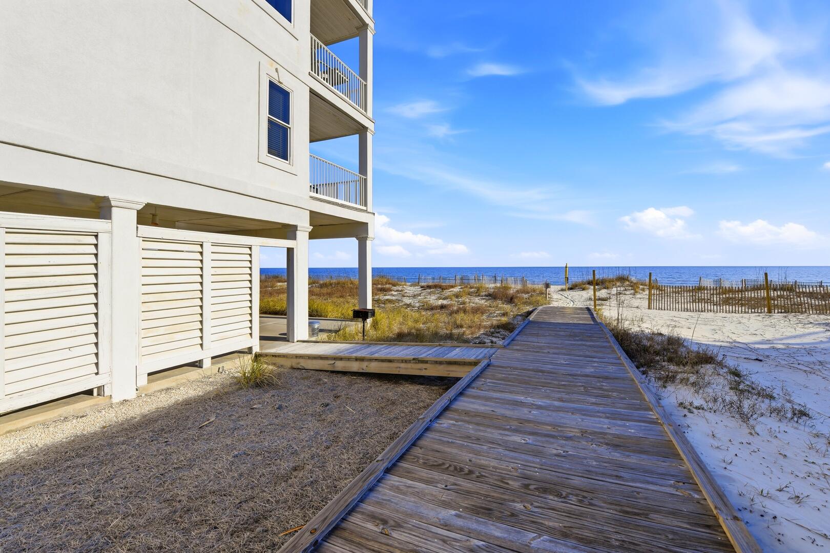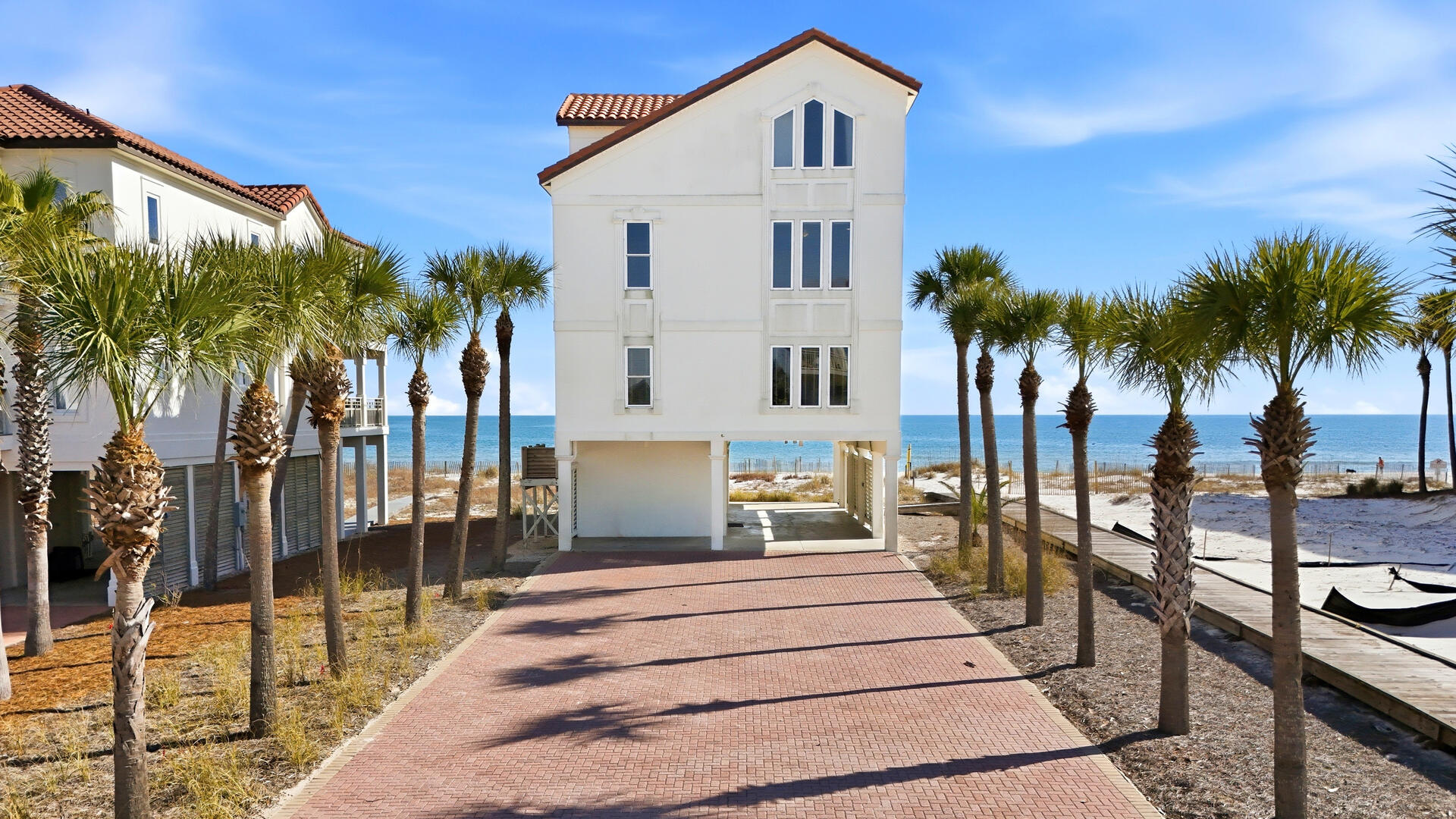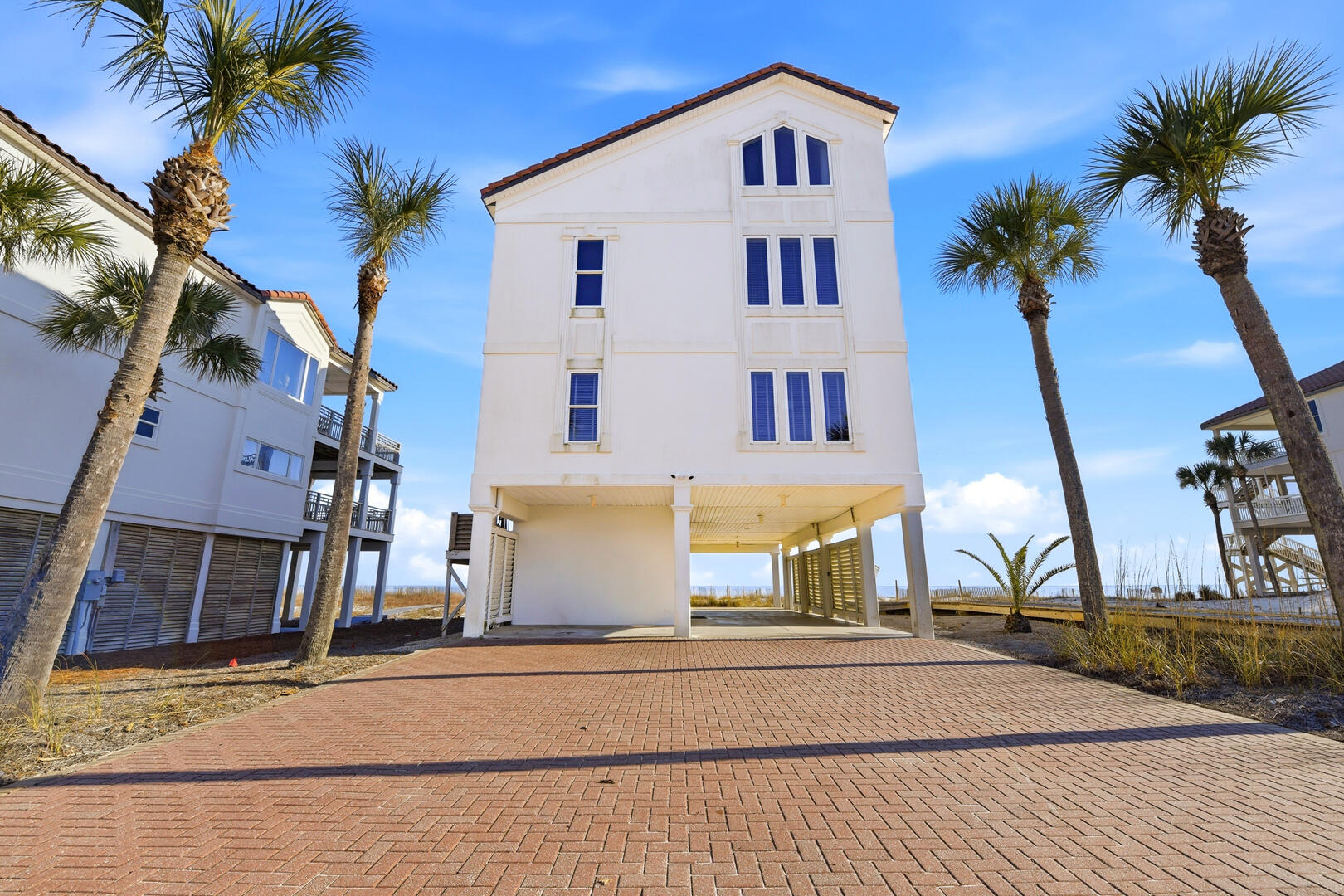 AMENITIES:Multiple TVs, gorgeous well-appointed kitchen with granite countertops, stainless appliances, two dishwashers, laundry room with washer and dryer, living room has separate bar area with ice machine, top level beachside master suite has a private sitting room with sofa, wet bar with beverage center, tile floors throughout main living spaces, carpet in bedrooms, elevator services all floors, large covered porches, gas grill, outdoor enclosed shower, under house concrete parking, shared boardwalk to beach.
