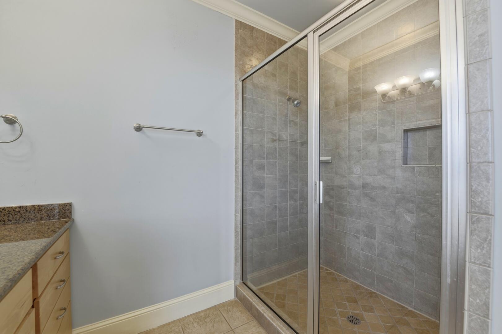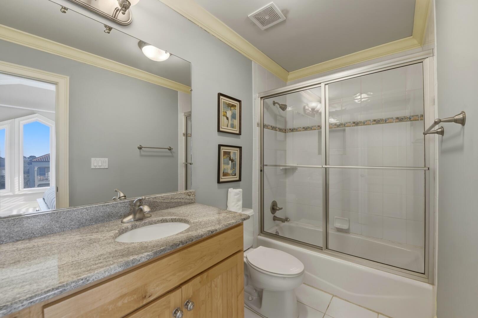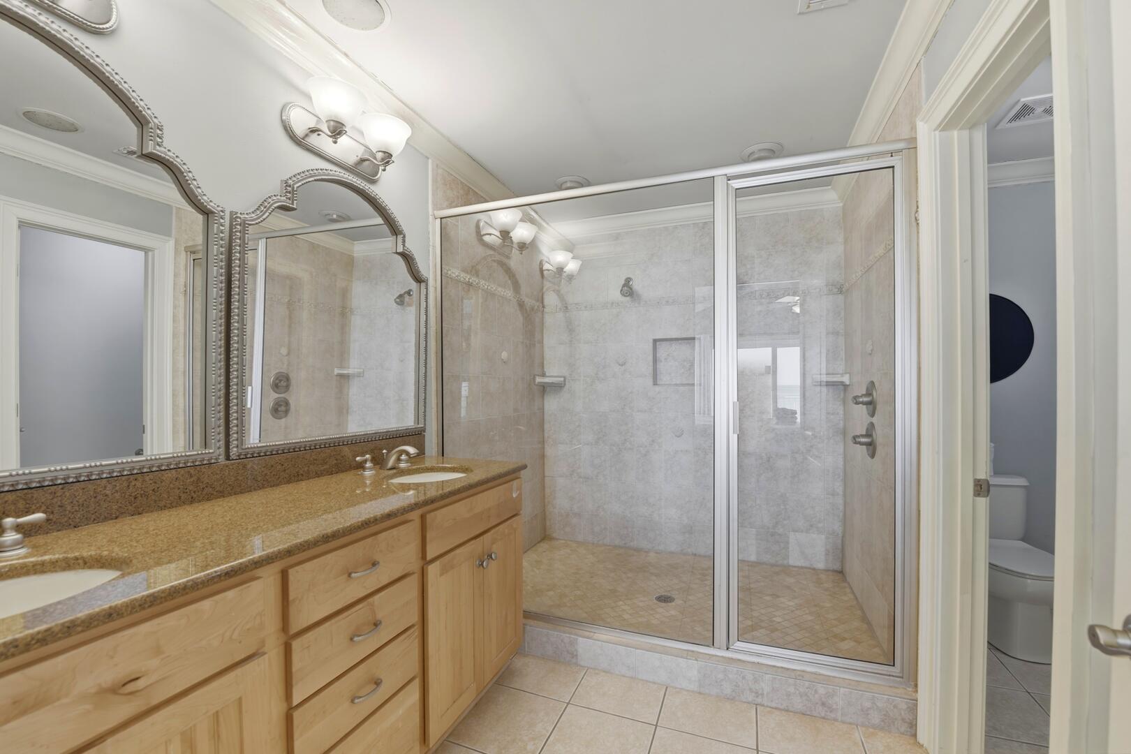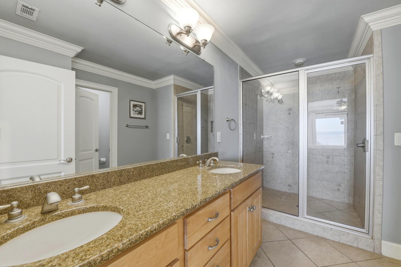AMENITIES:Multiple TVs, gorgeous well-appointed kitchen with granite countertops, stainless appliances, two dishwashers, laundry room with washer and dryer, living room has separate bar area with ice machine, top level beachside master suite has a private sitting room with sofa, wet bar with beverage center, tile floors throughout main living spaces, carpet in bedrooms, elevator services all floors, large covered porches, gas grill, outdoor enclosed shower, under house concrete parking, shared boardwalk to beach.