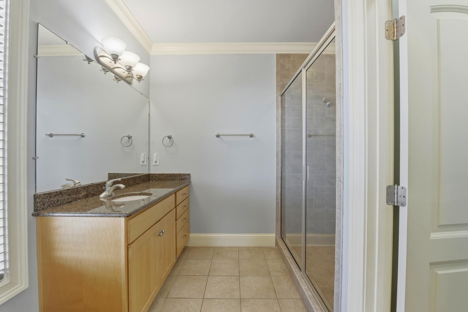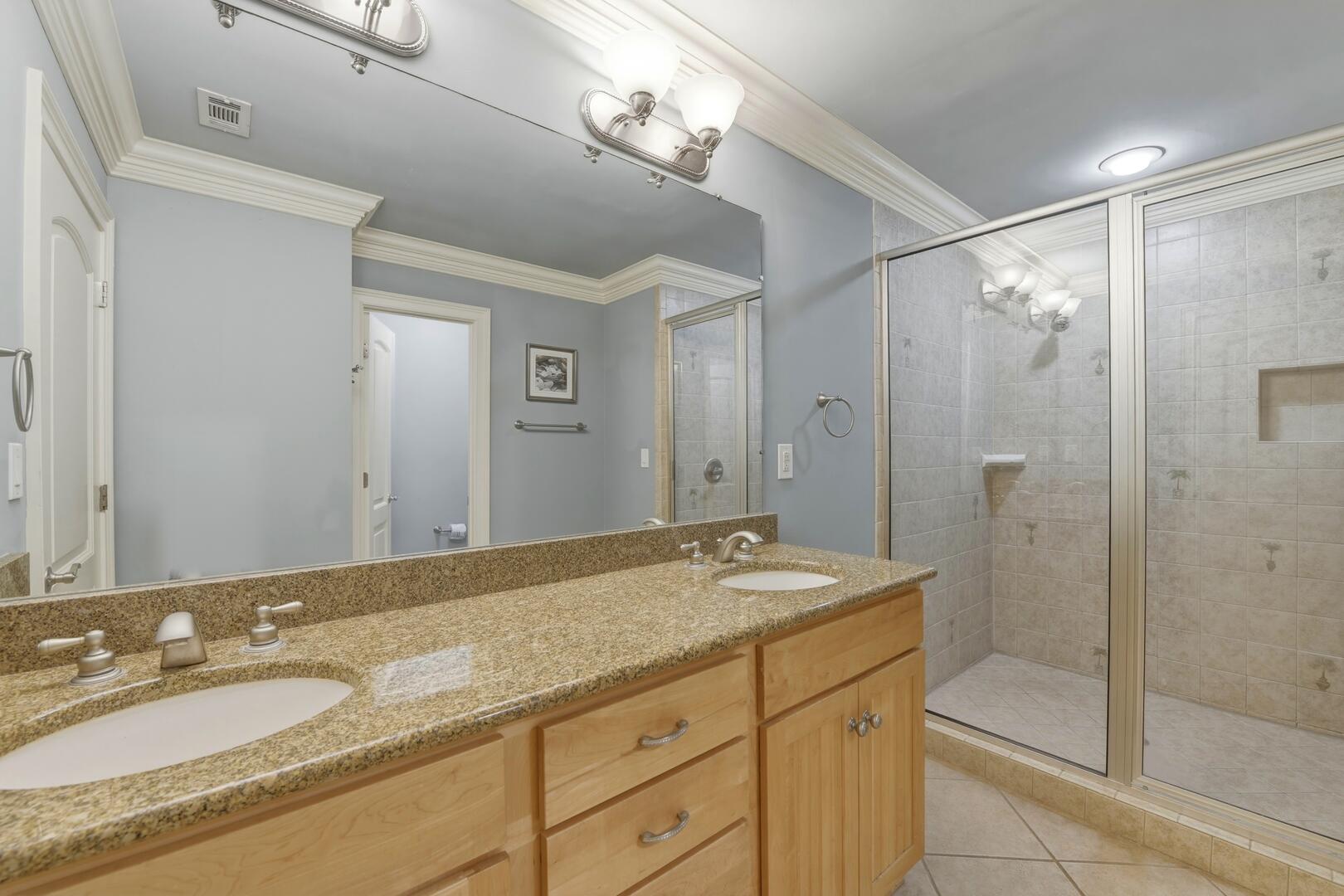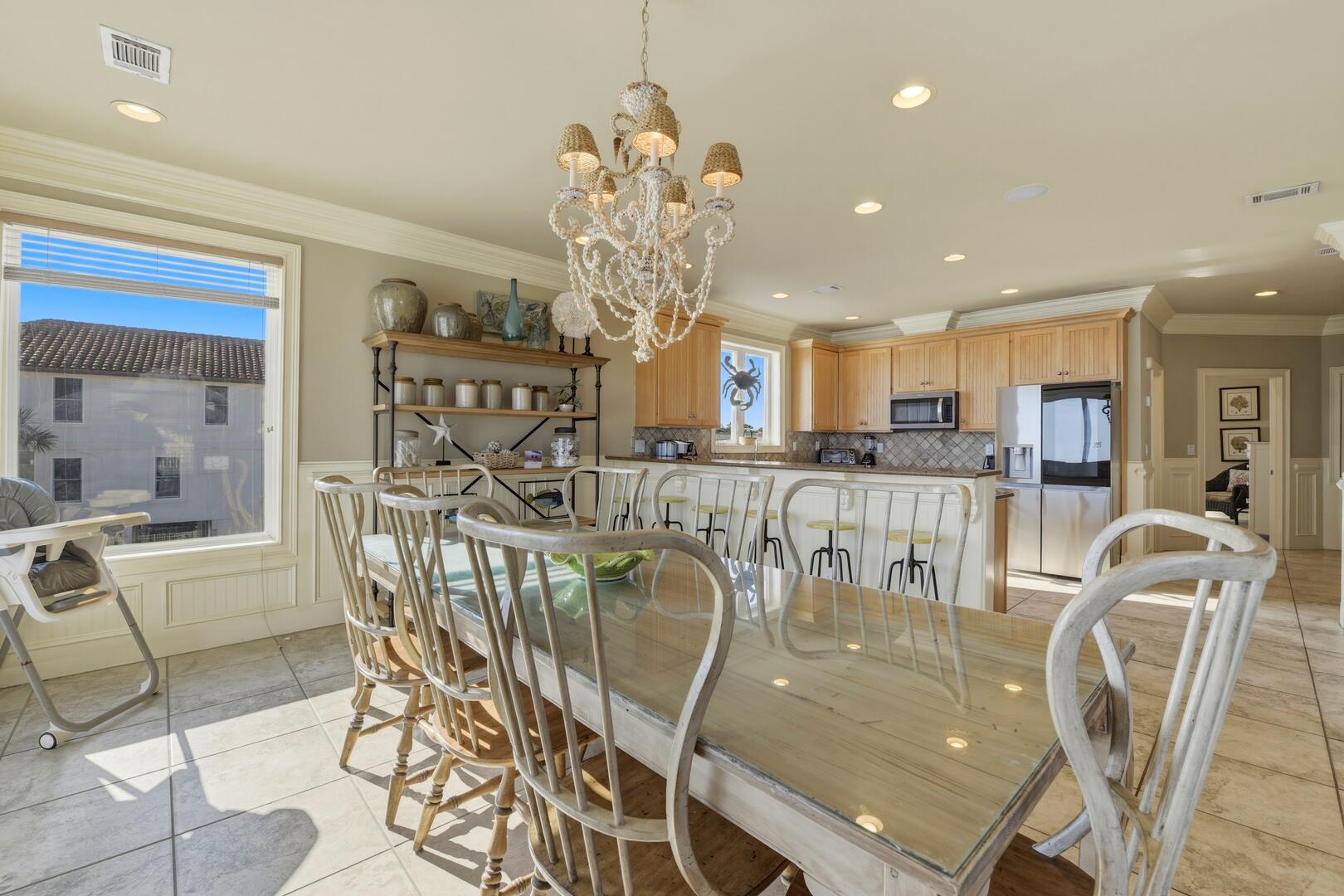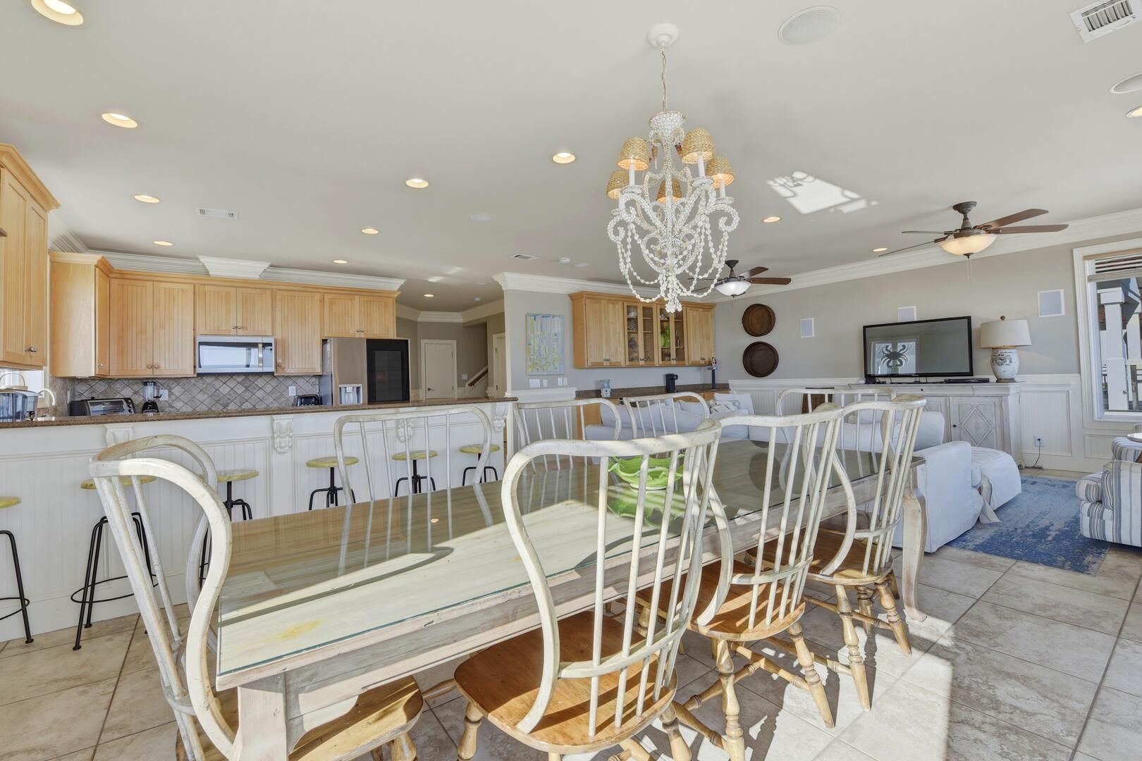 The heart of the home is the beautifully appointed kitchen, featuring granite countertops, stainless steel appliances, and two dishwashers, making meal preparation effortless for larger groups. A generous dining table with seating for 10, along with additional seating at the long kitchen island, provides ample space for shared meals and meaningful gatherings.