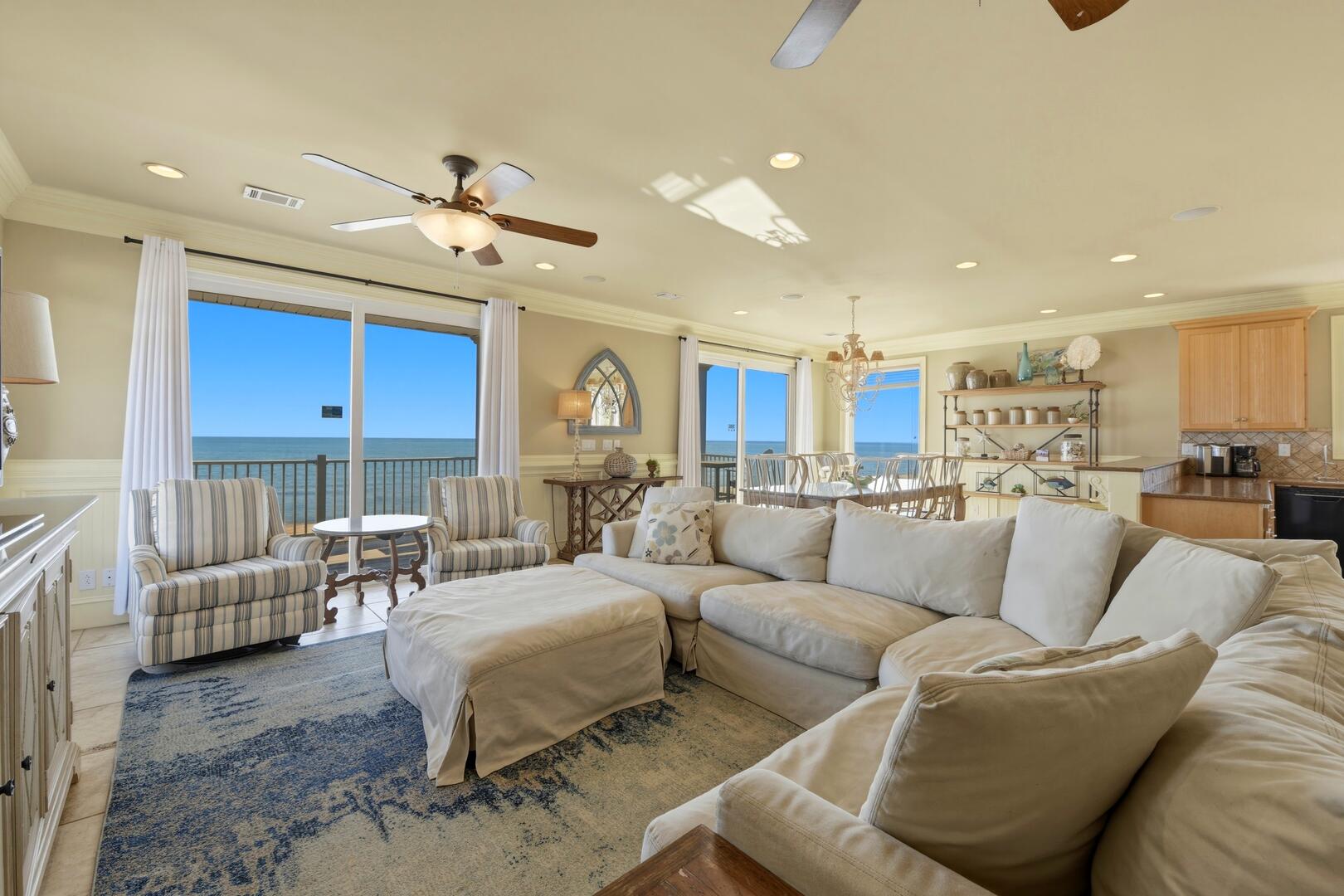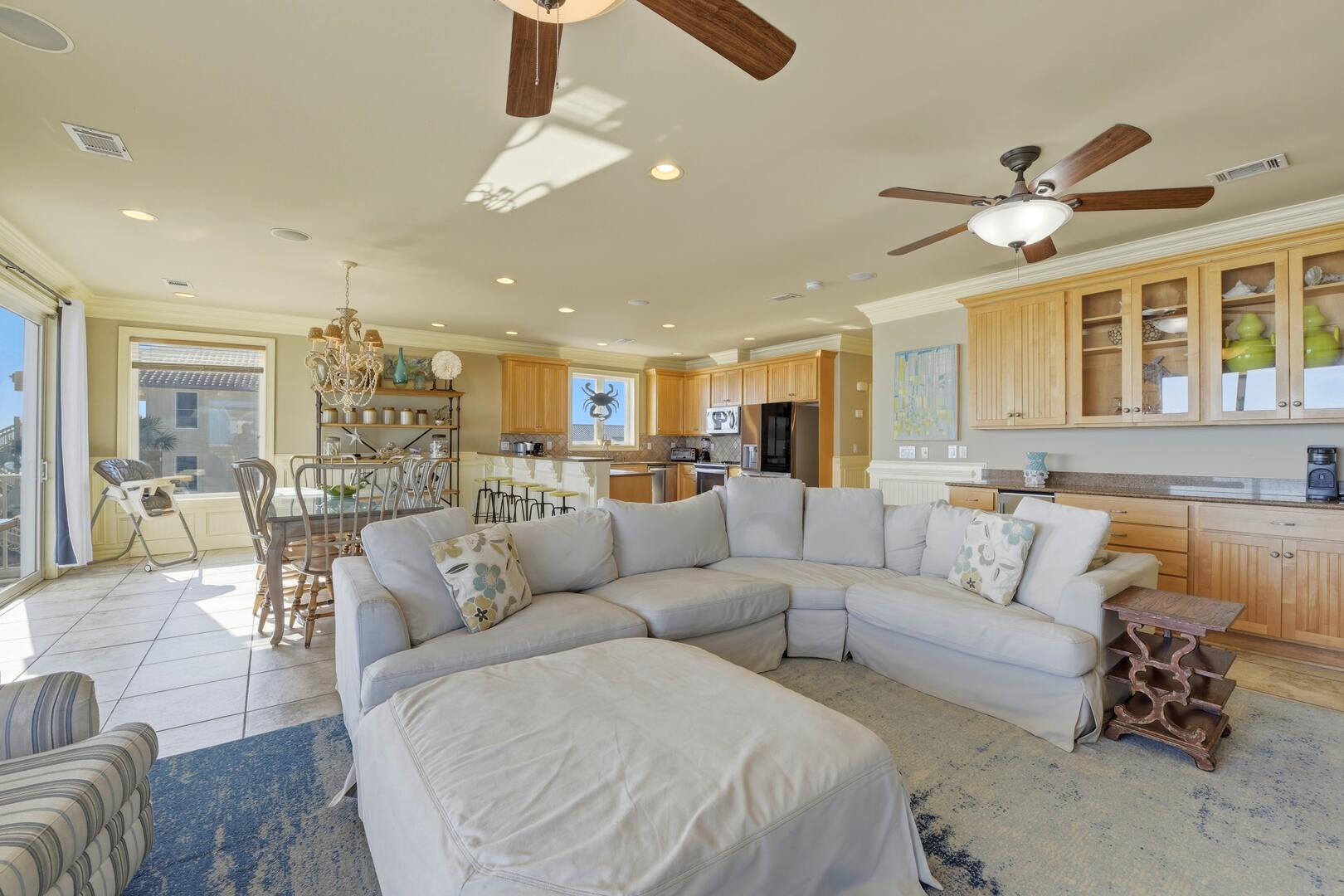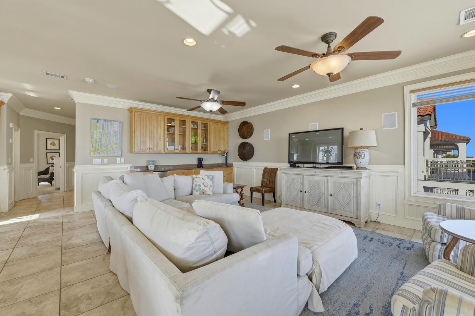 The living room is designed for comfort and connection, centered around a large, plush sectional sofa perfect for relaxing after a day at the beach. Just off the main living area, you'll find a separate bar area complete with a built-in icemaker and beverage cooler, creating the perfect space for entertaining, mixing sunset cocktails, or keeping drinks chilled and easily accessible for guests.