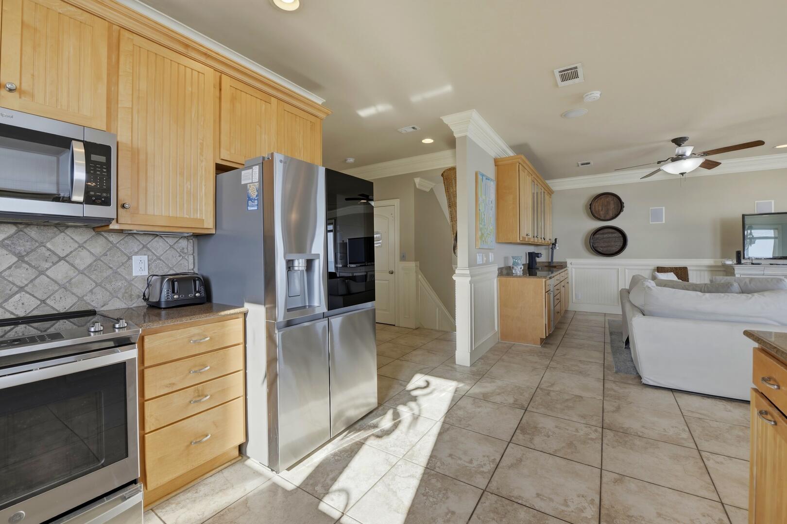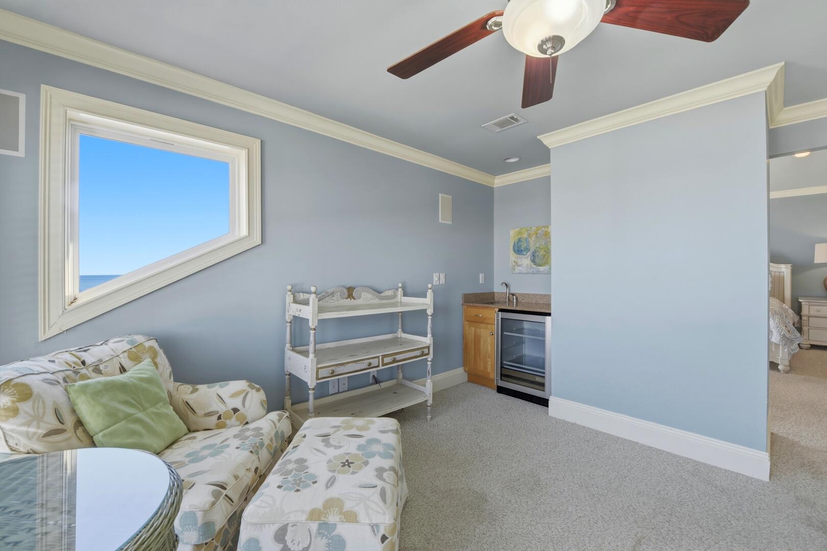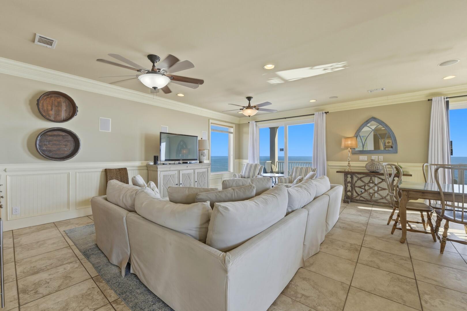 The living room is designed for comfort and connection, centered around a large, plush sectional sofa perfect for relaxing after a day at the beach. Just off the main living area, you'll find a separate bar area complete with a built-in icemaker and beverage cooler, creating the perfect space for entertaining, mixing sunset cocktails, or keeping drinks chilled and easily accessible for guests.