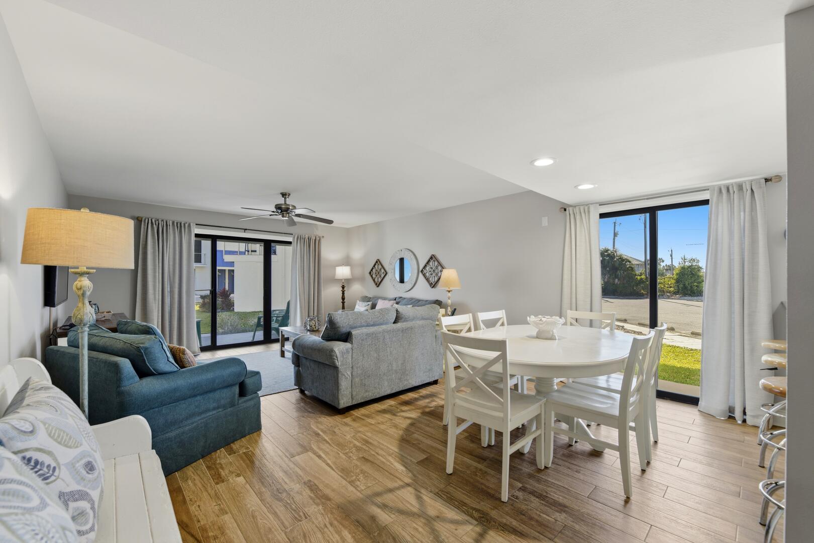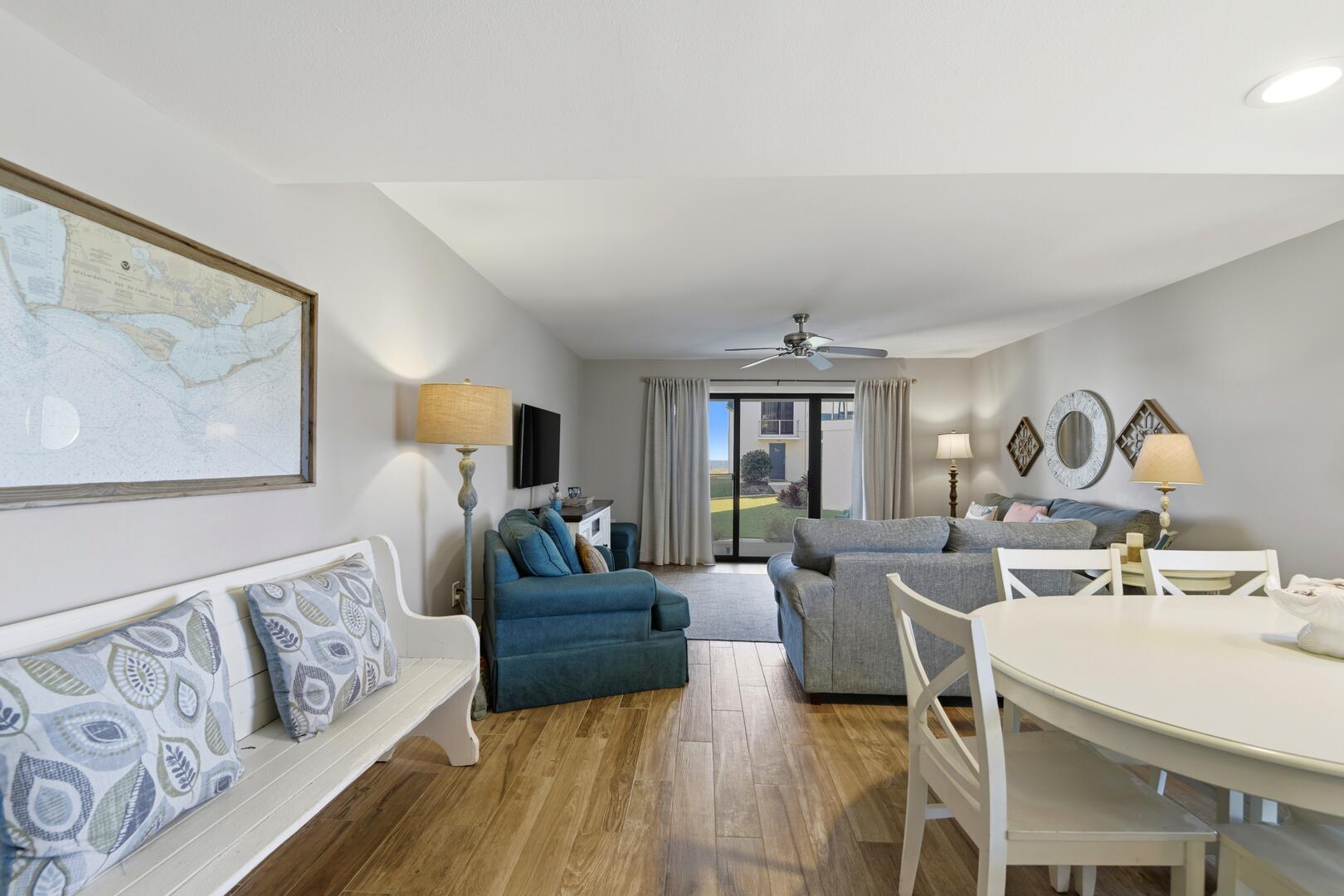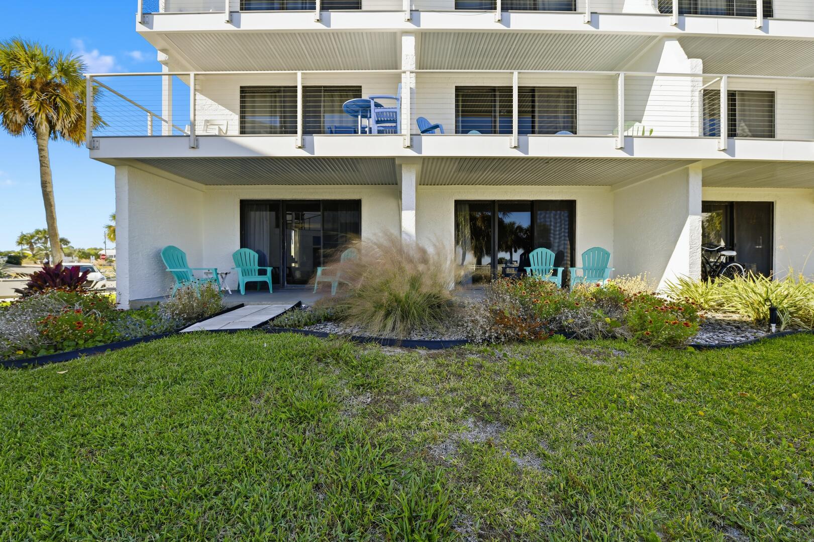 AMENITIES: Multiple flat screen TVs, all new tile flooring throughout, well stocked kitchen with new cabinets, granite counter tops, stainless appliances, washer and dryer. All new furniture and decor, garden unit with patio, close to shops and restaurants, park style grills and fish cleaning area in the complex.