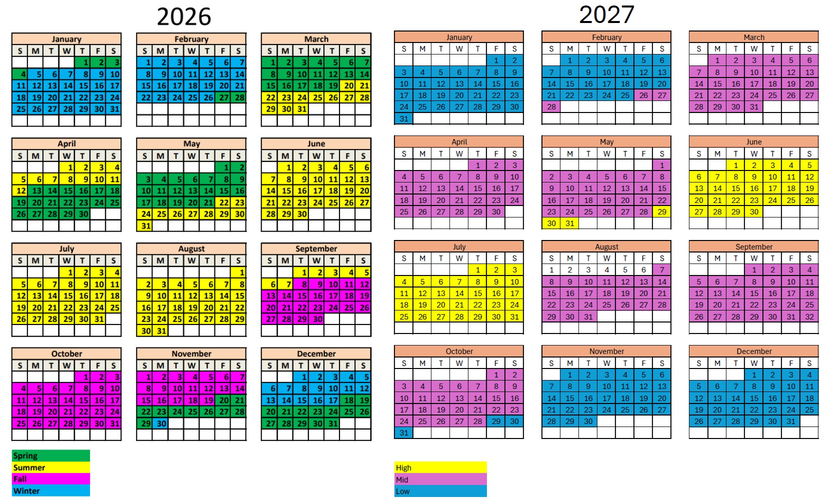 2027 calendar represent the seasons designated as High, Mid, and Low.